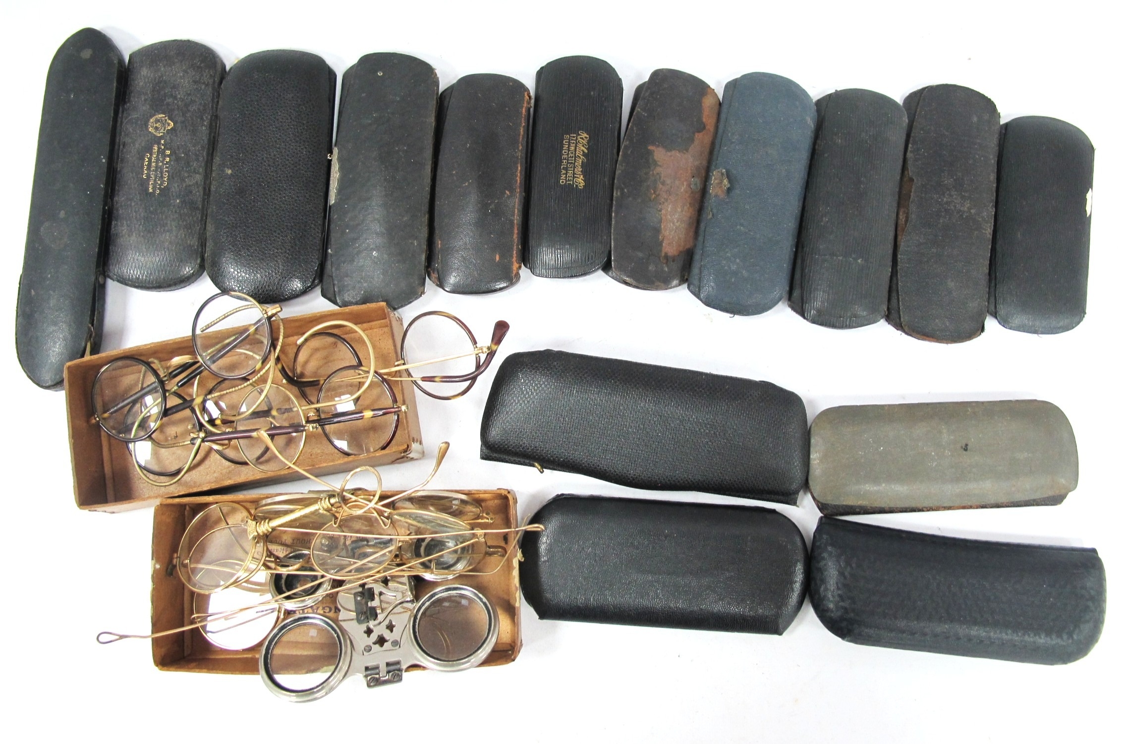 Early to Mid XX Century Vintage Spectacles, with gold-filled and Bakelite/Celluloid frames, many with original cases:- One Tray. [145930]