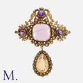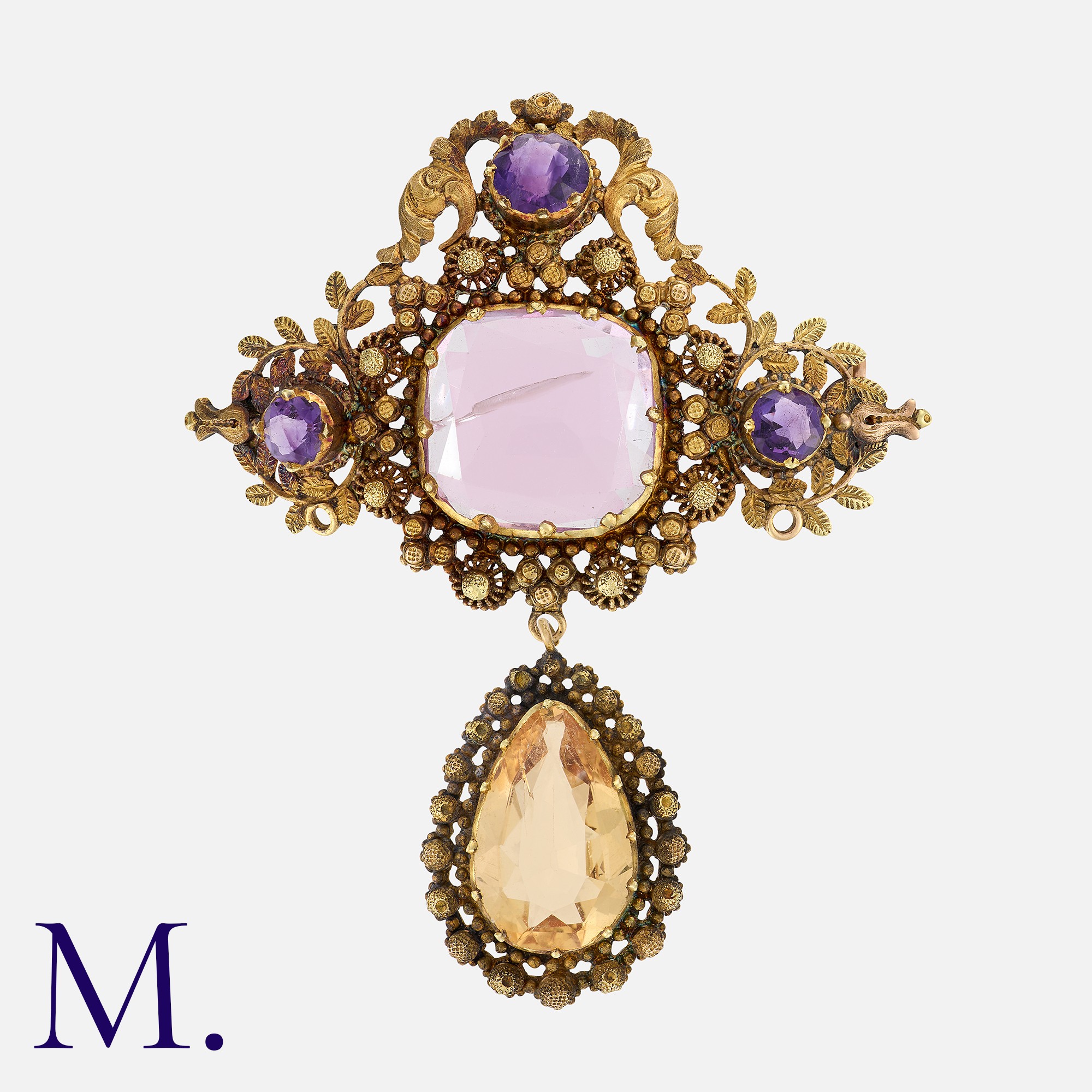 An Antique Cannetille Topaz and Amethyst Brooch, in yellow gold, set with a principal cushion cut pink topaz of approximately 2.85 carats, accented by three round cut amethyst, suspending an articulated pear shaped topaz drop. Unmarked, tests indicate 15 carat gold.