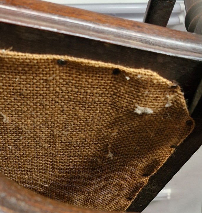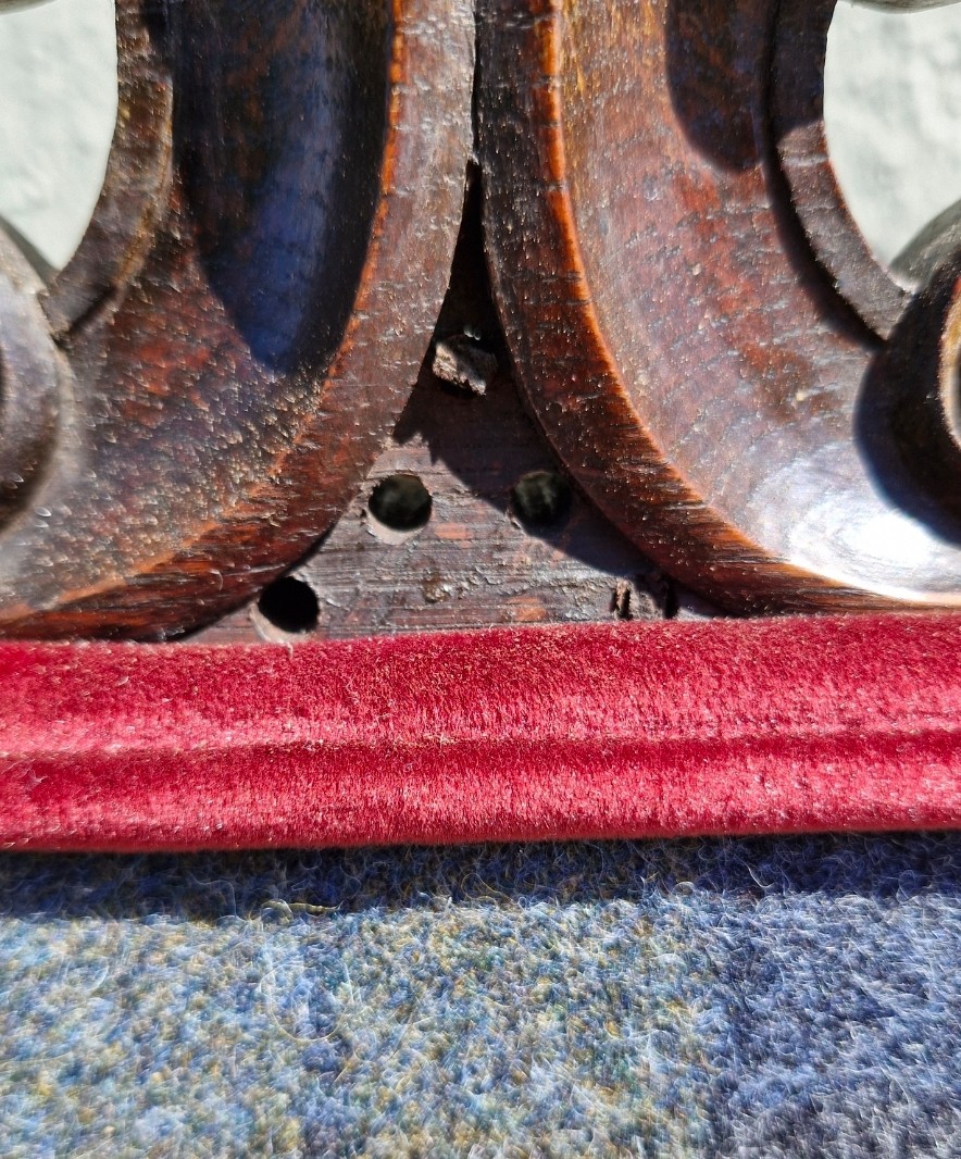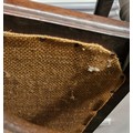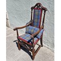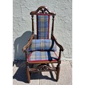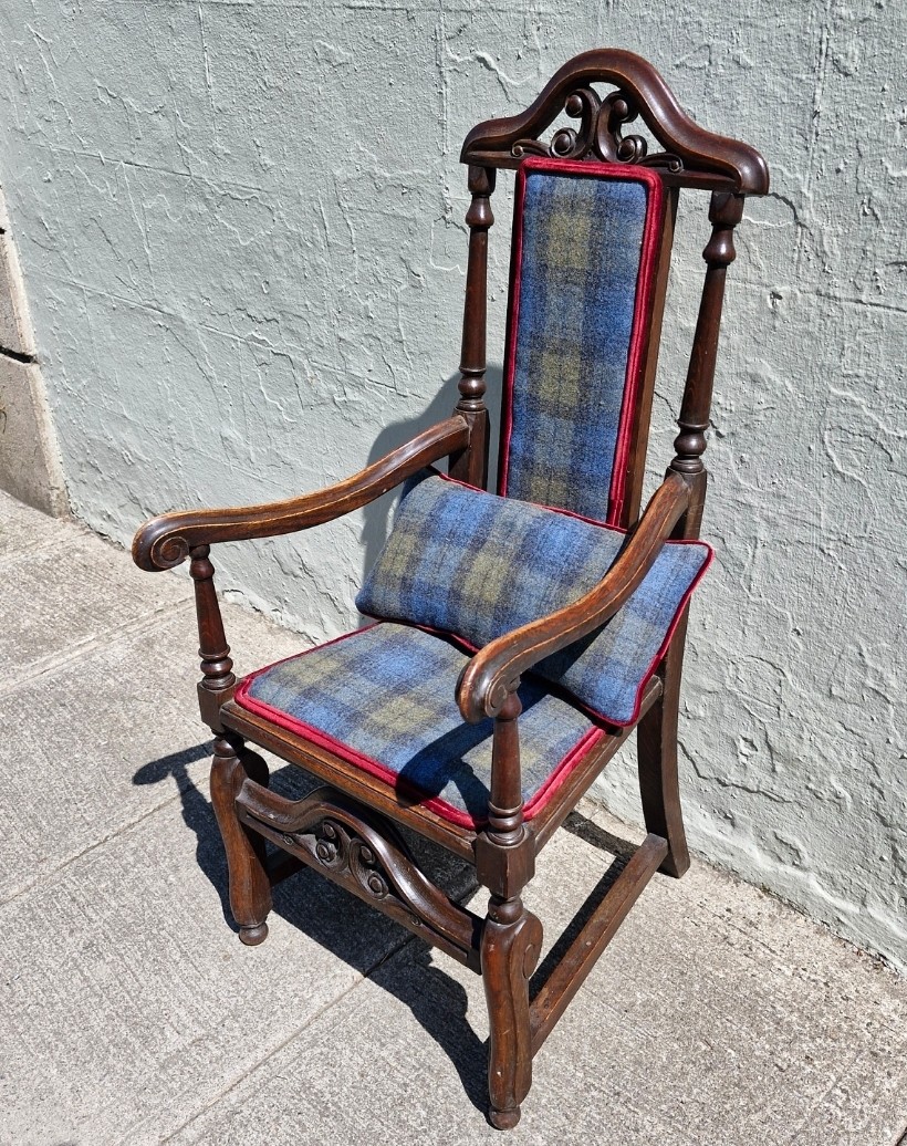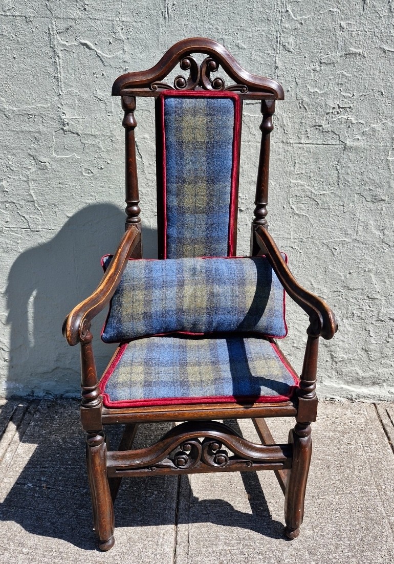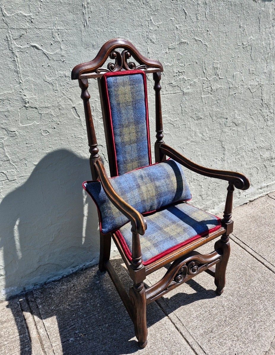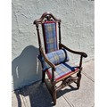 A Jacobean style mahogany carver armchair with high decorative back, arm rests and stretcher. Upholstered in Edinburgh woolen tartan.