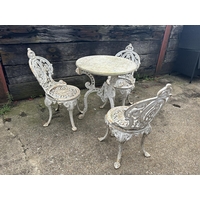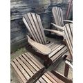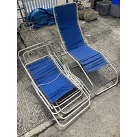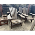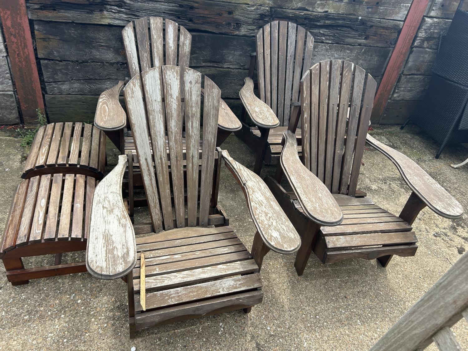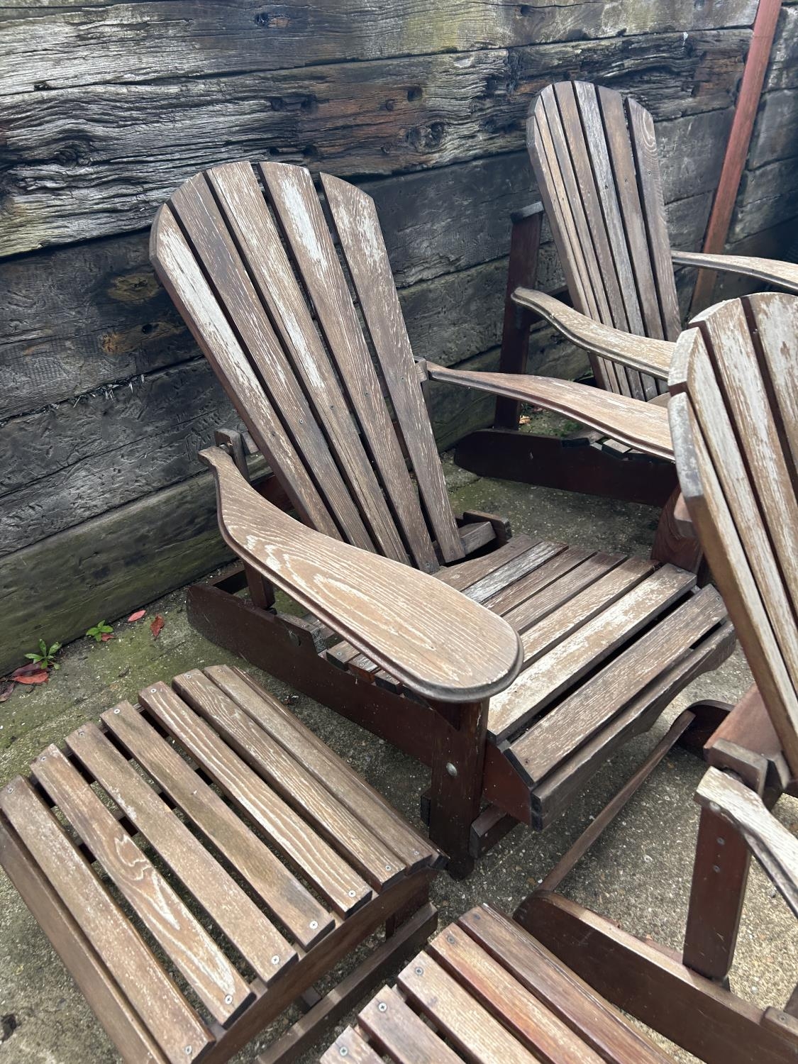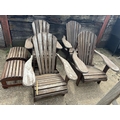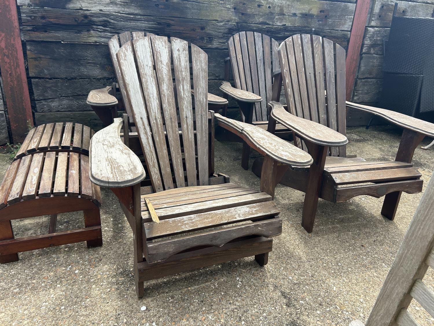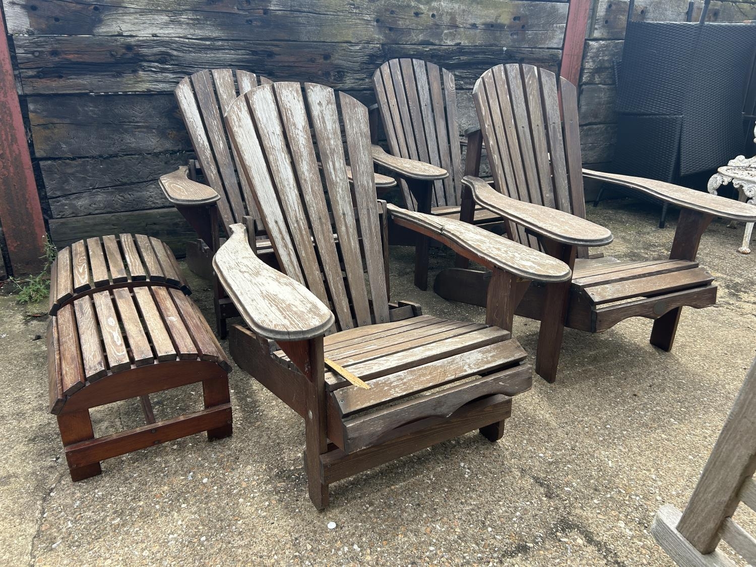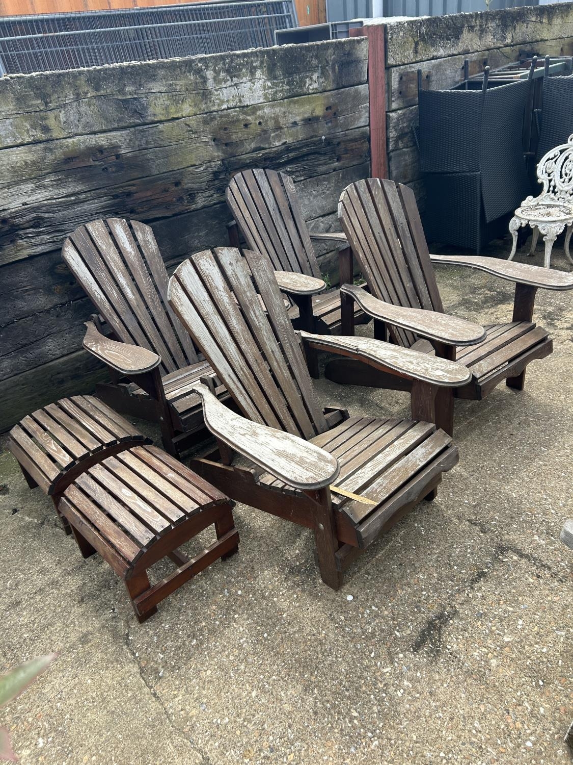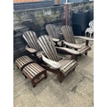 A set of four wooden sun lounger chairs with two stools