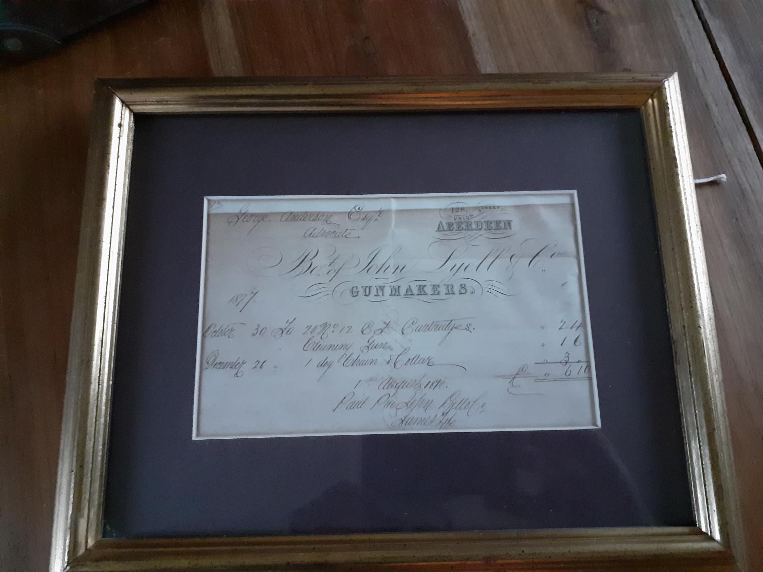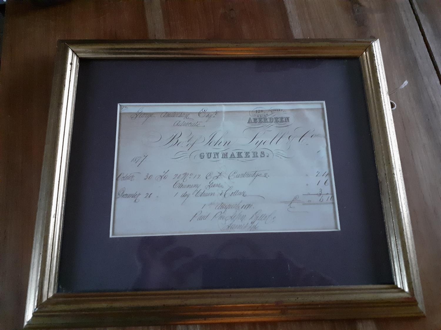 John & Lyell & Co Gunmakers Framed Receipt - 30th October 1877 addressed to George Anderson Esq.;