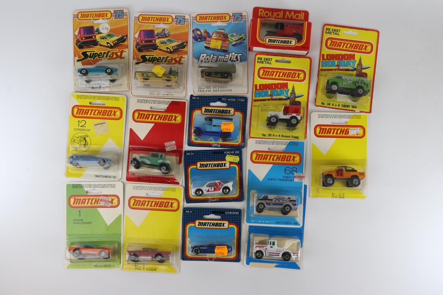 Matchbox 75, on open cards to include Pontiac Firebird, 57 Chevvy, Swamp Rat etc 15 models in total.