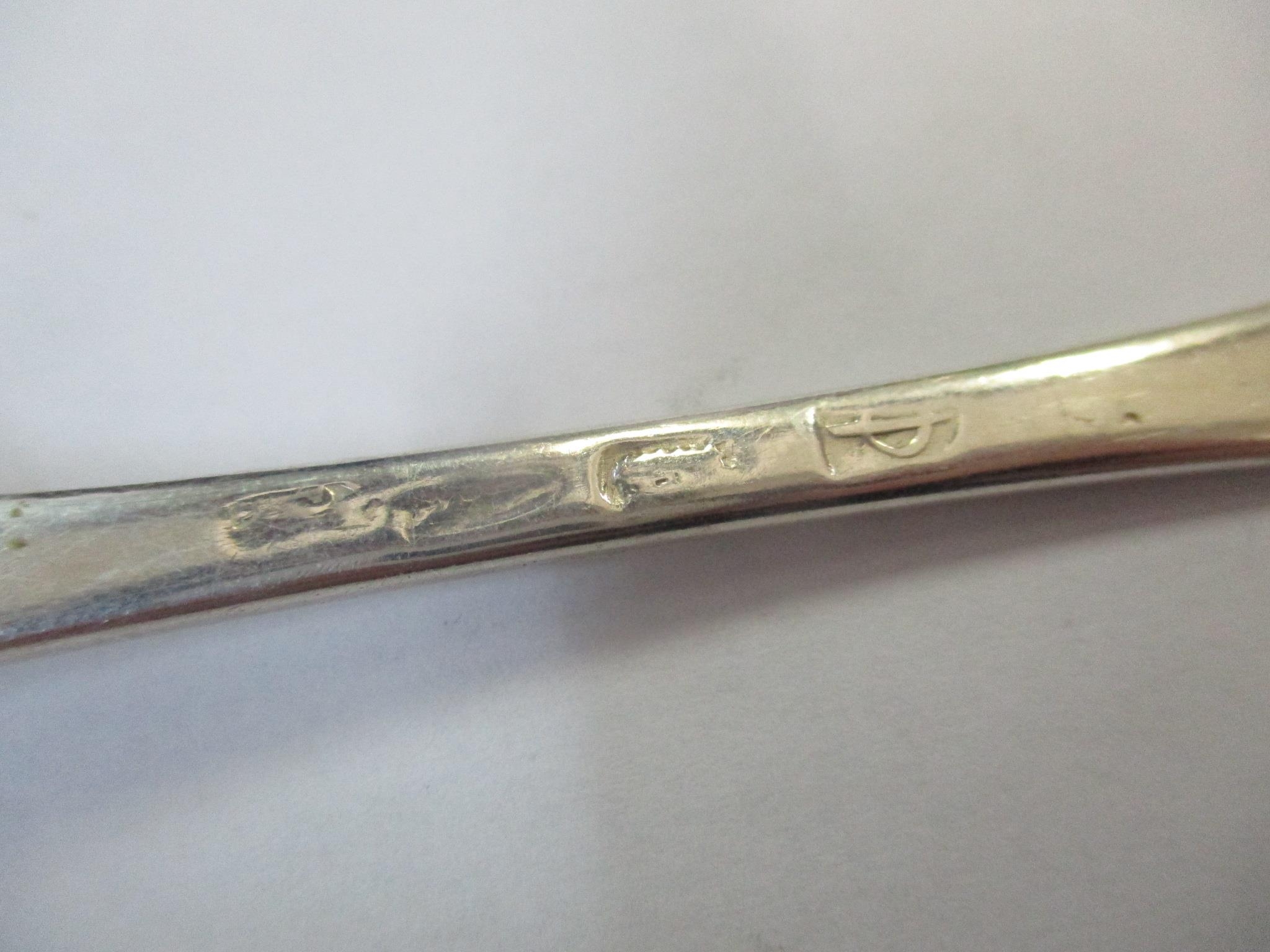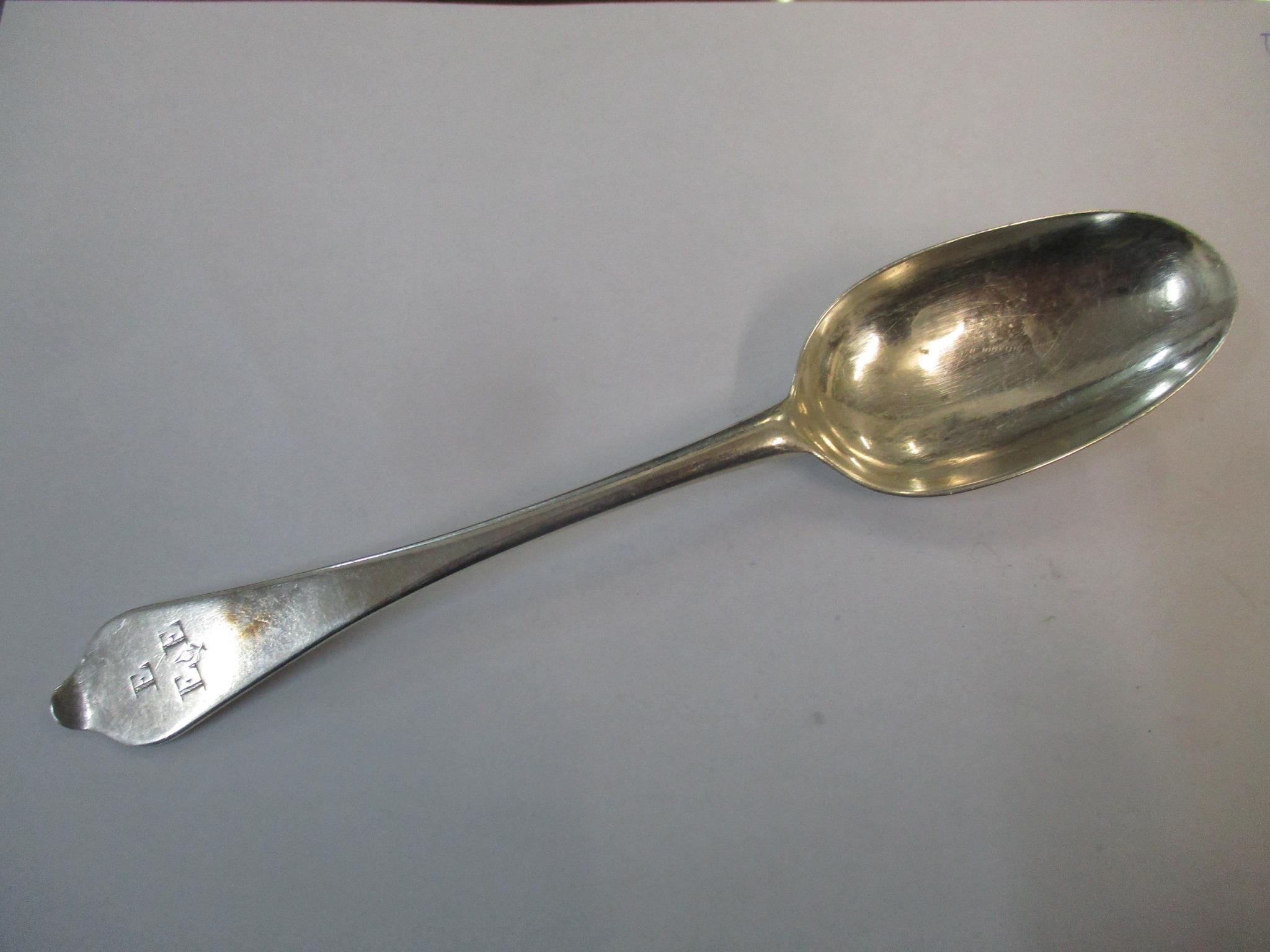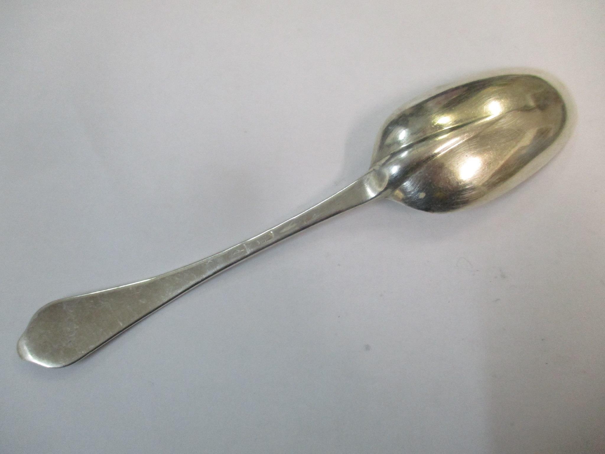 A Georgian silver hallmarked rat tail spoon with initials to the handle, 59.45g