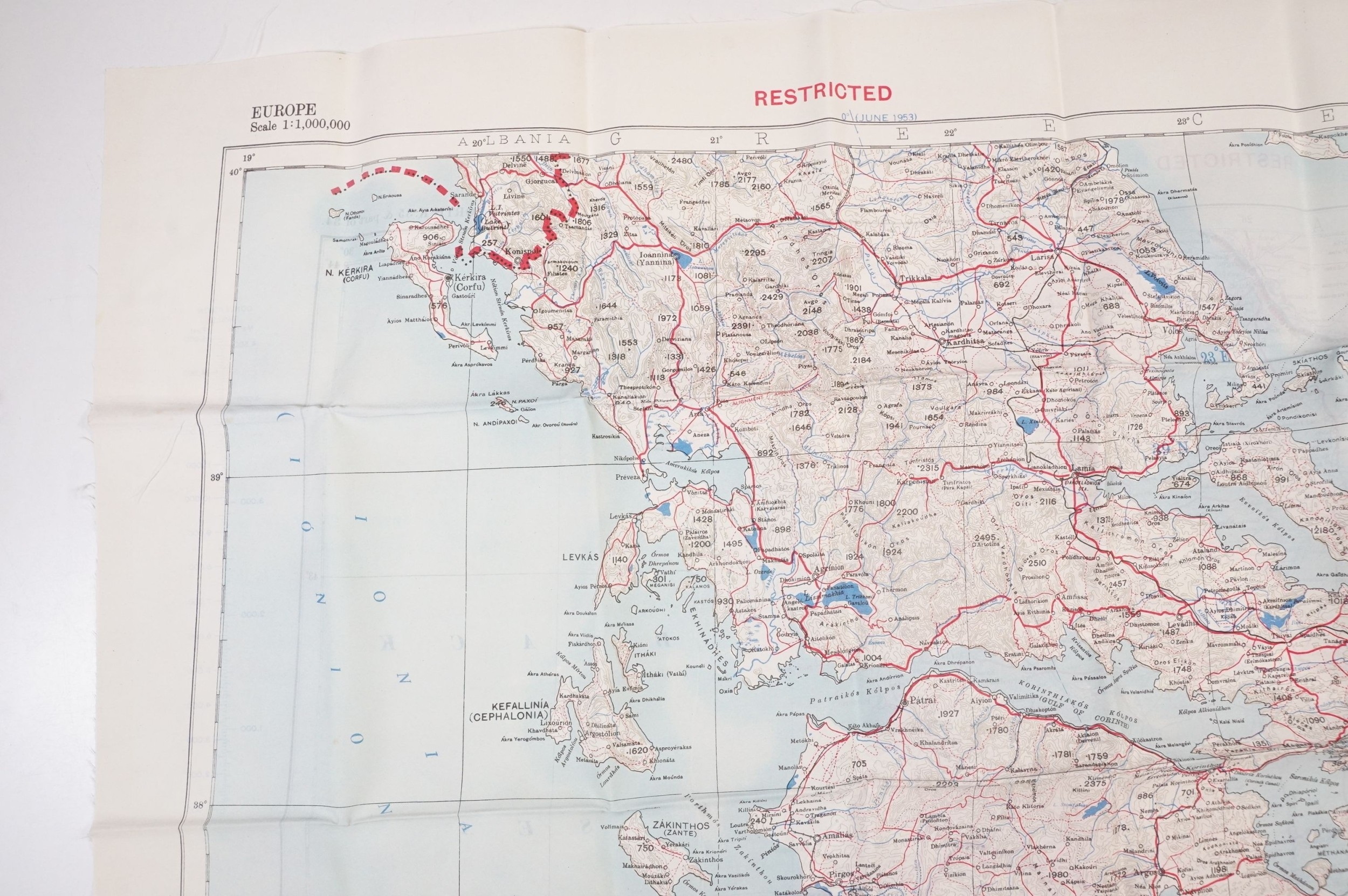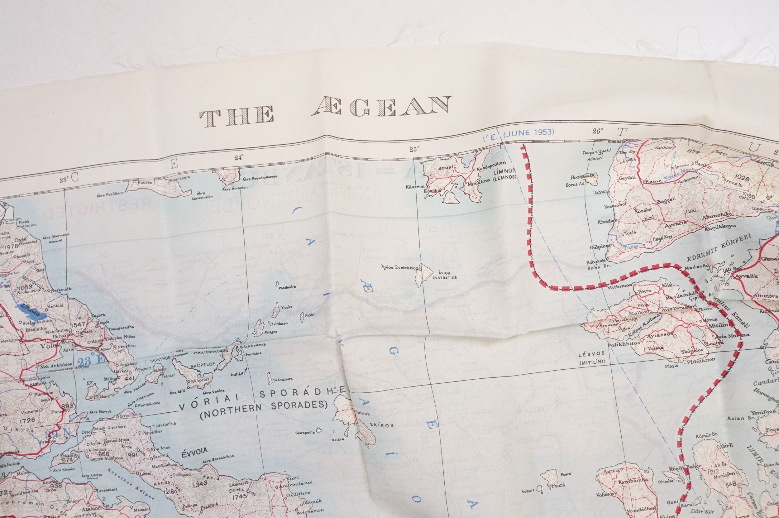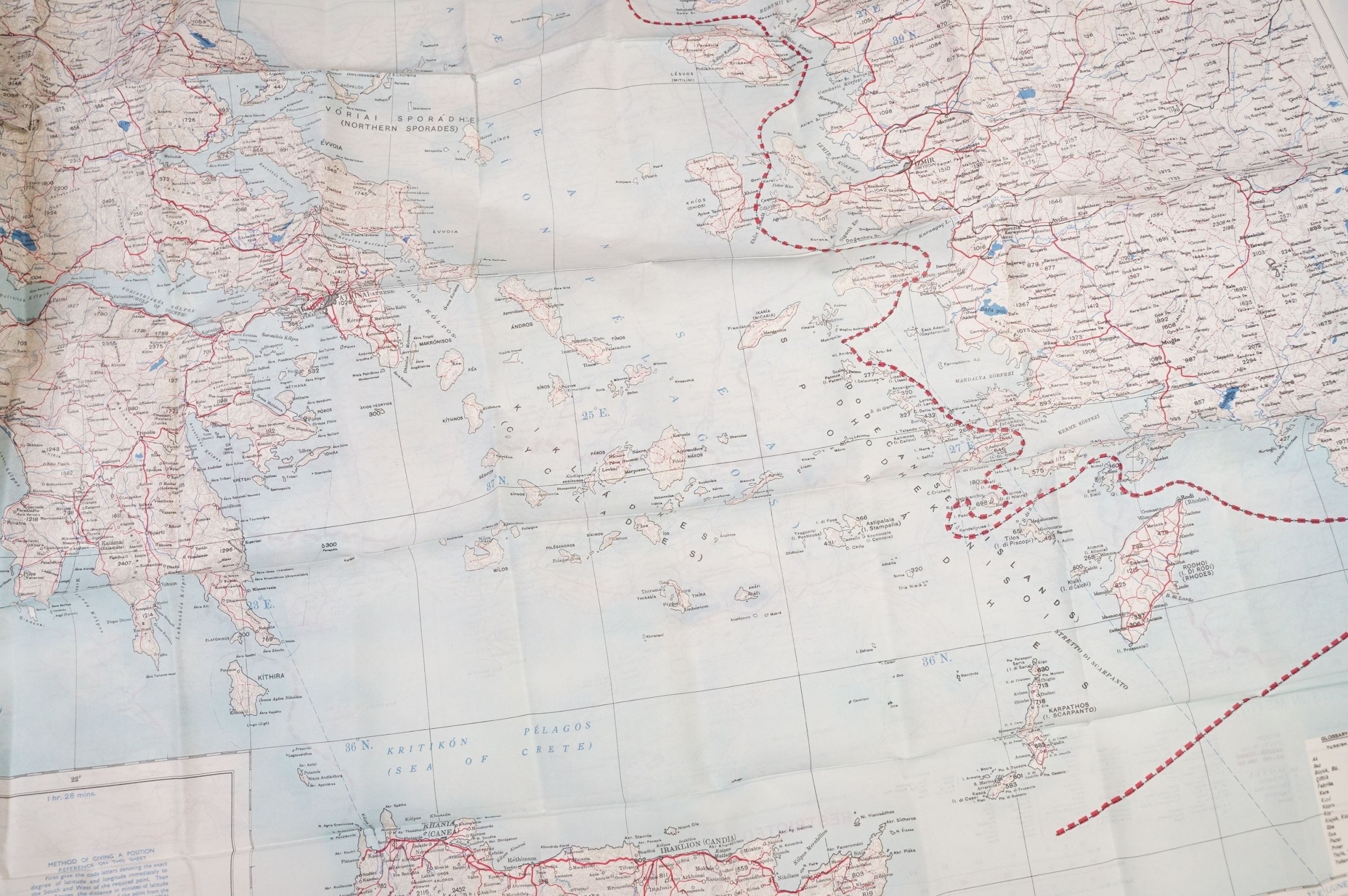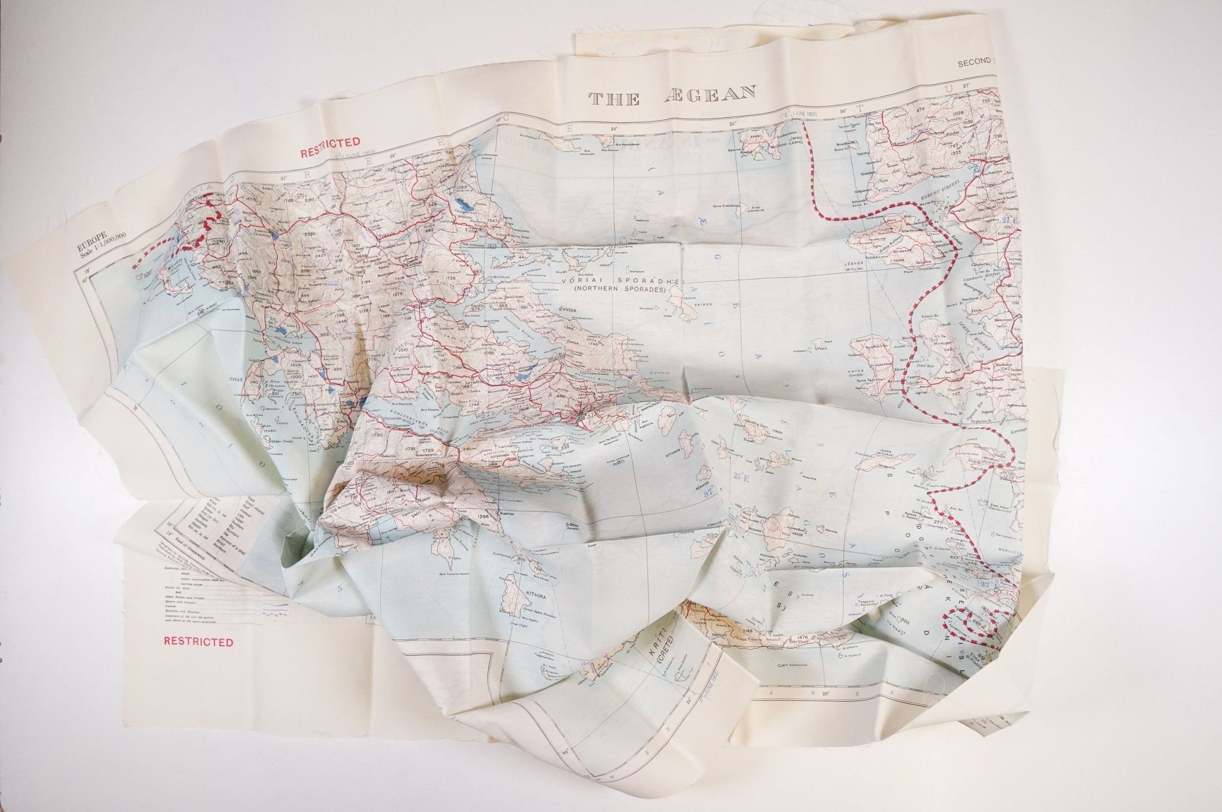 A Royal Air Force / RAF silk escape map covering Greece, Greek Islands, Corfu, Crete, Rhodes, Zante, Athens, Albania and the Aegean Sea.