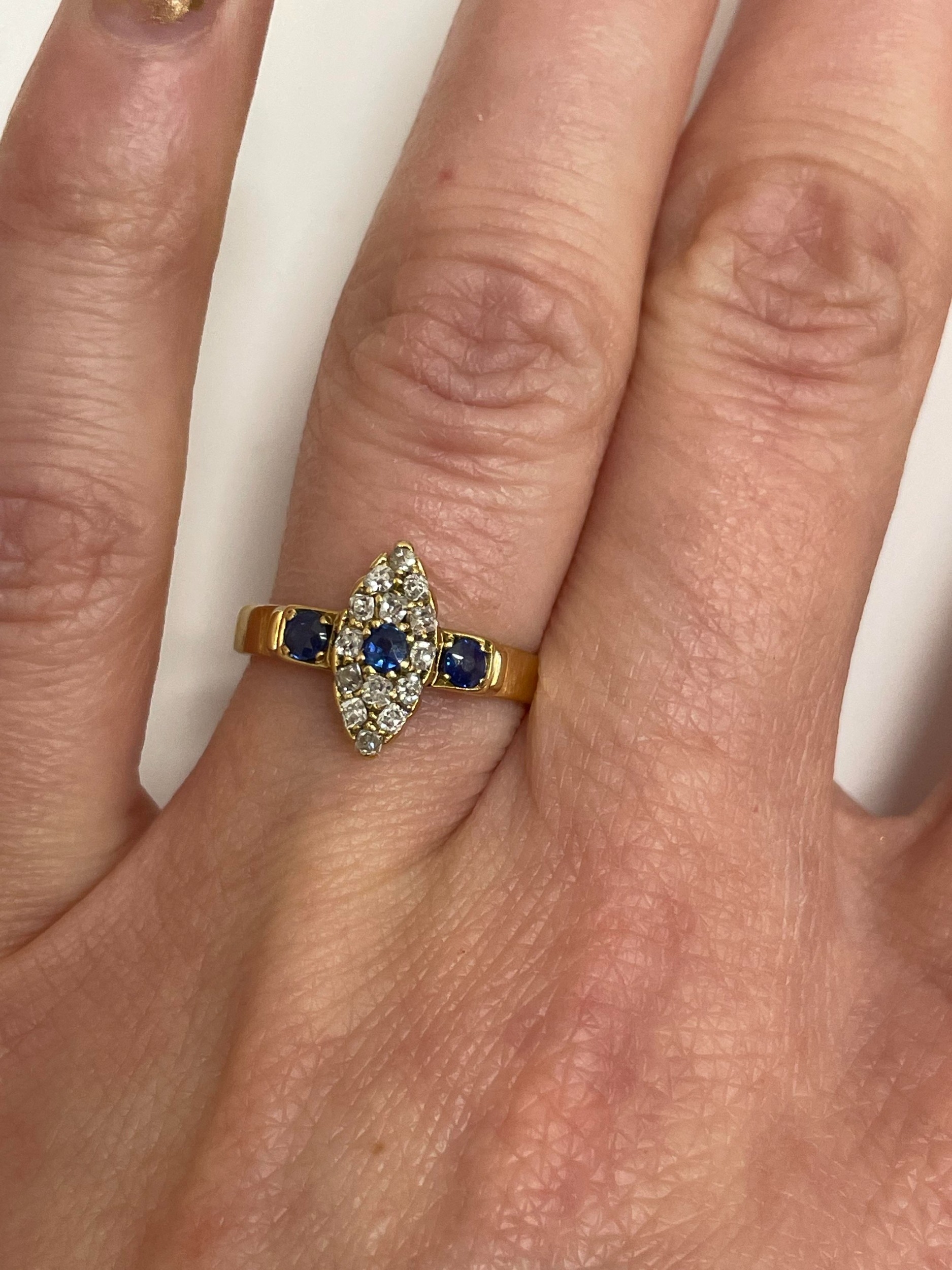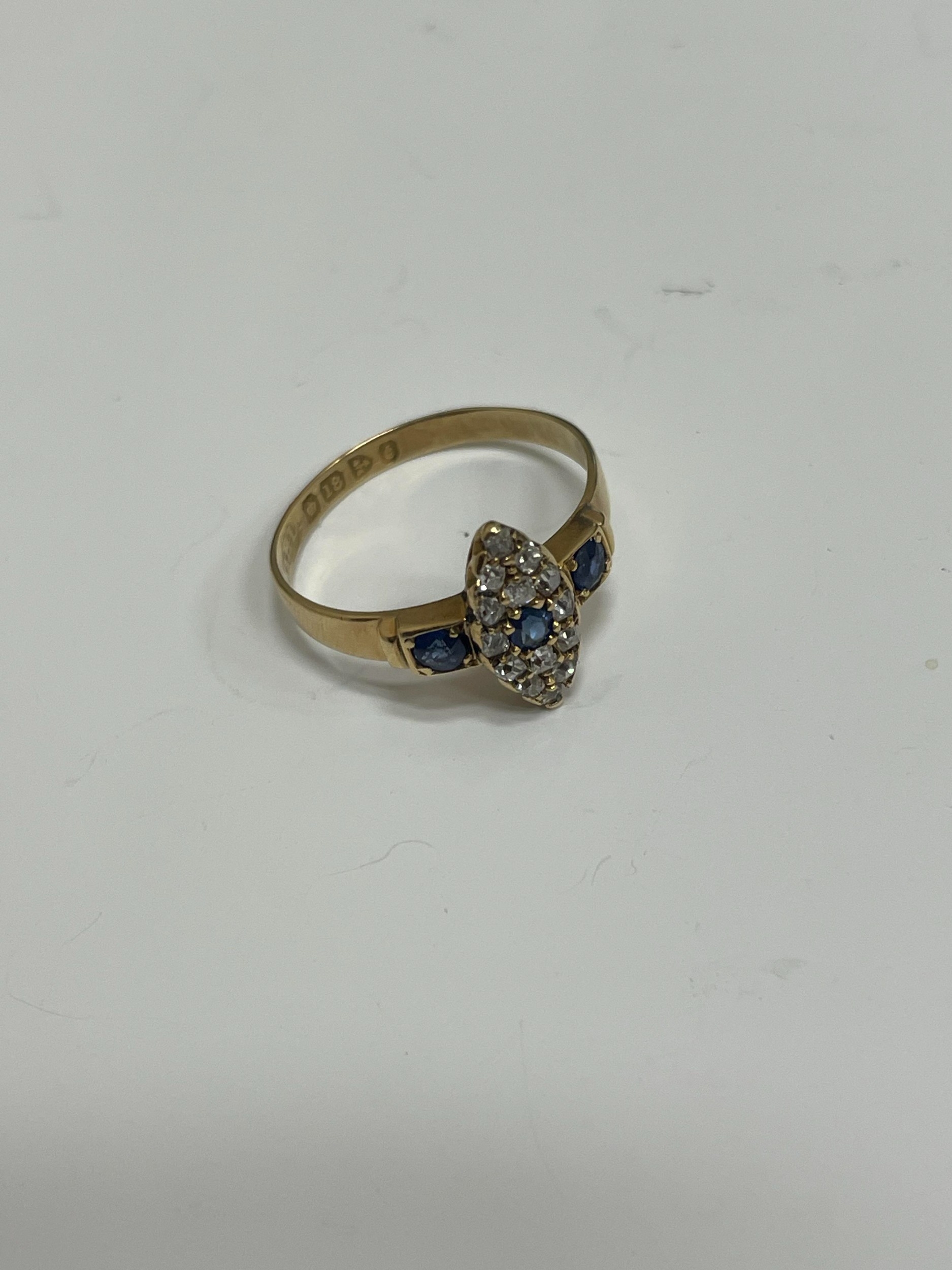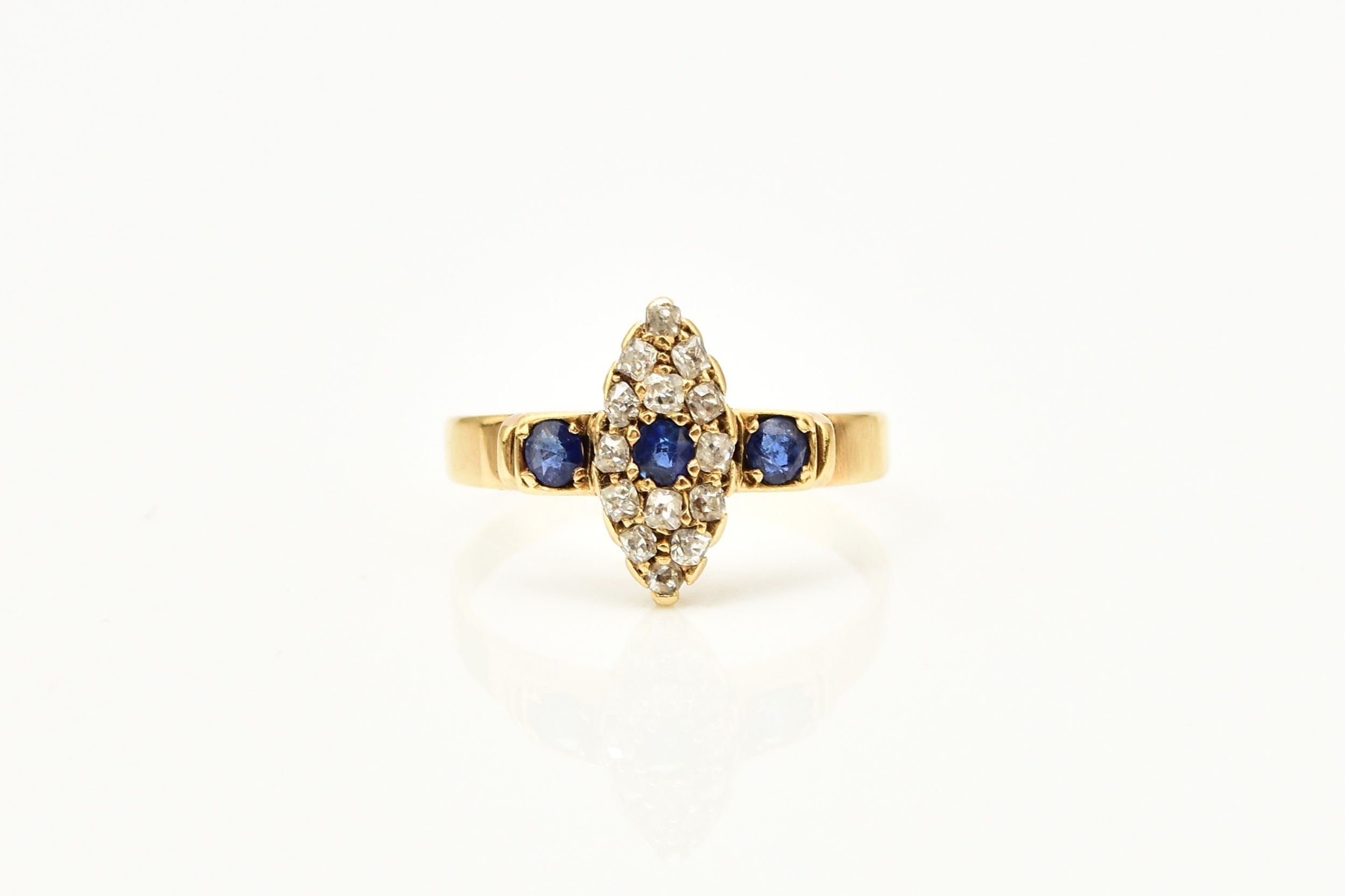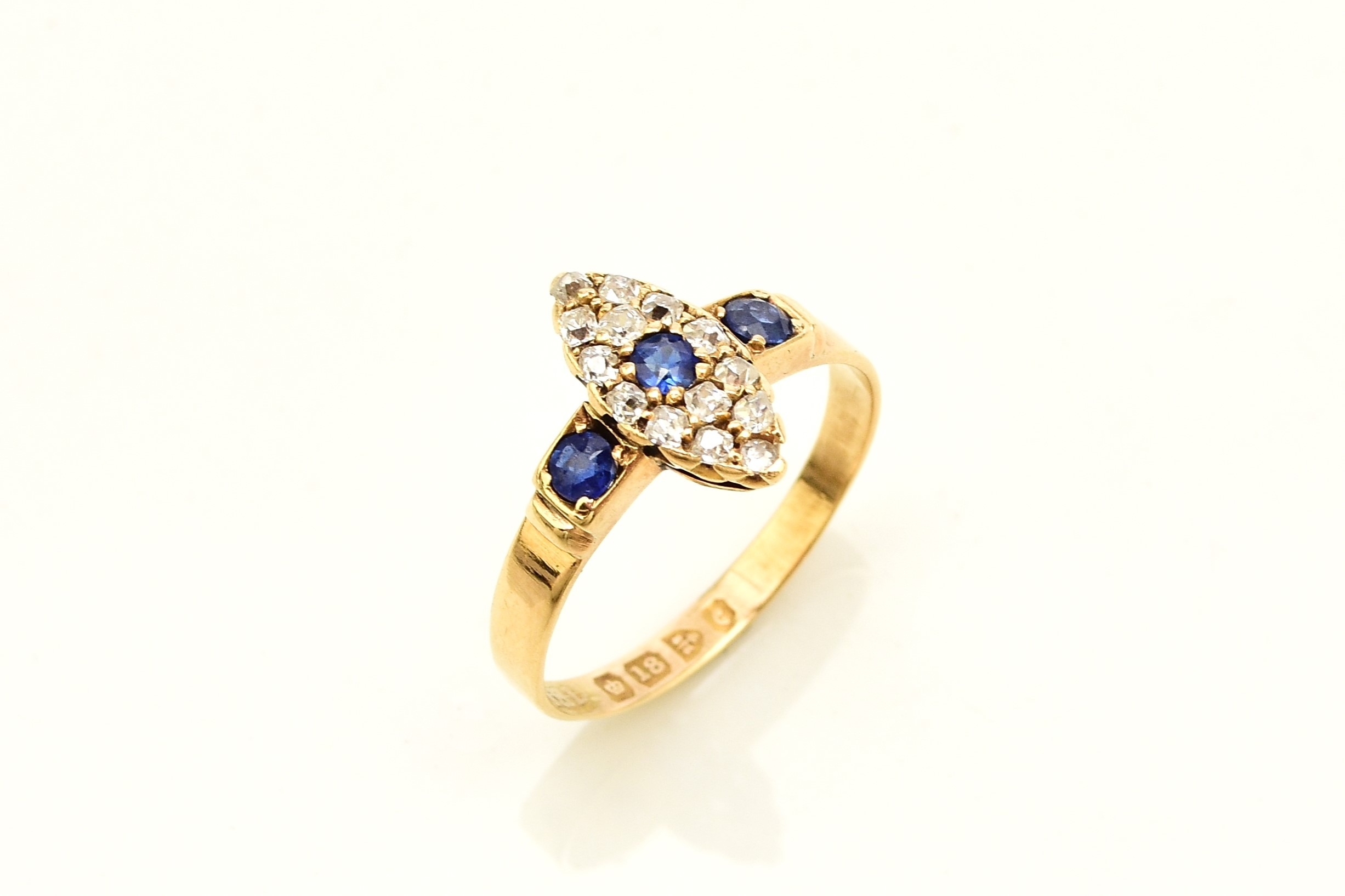 An 18ct gold Edwardian sapphire and diamond ring, designed as a central round cut sapphire claw set within a navette cluster of fourteen mine cut diamonds, flanked to each side by a single round cut sapphire, all claw set in yellow gold to yellow gold shank, ring size M 1/2, hallmarked Chester 1903, weight approx 2.2g Condition:Hallmarks clear, rubbed makers mark 'W & HL', central navette cluster measures approx 12mm x 5mm, general wear commensurate with age but no significant visible damage, refer to images
