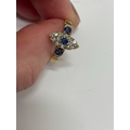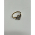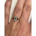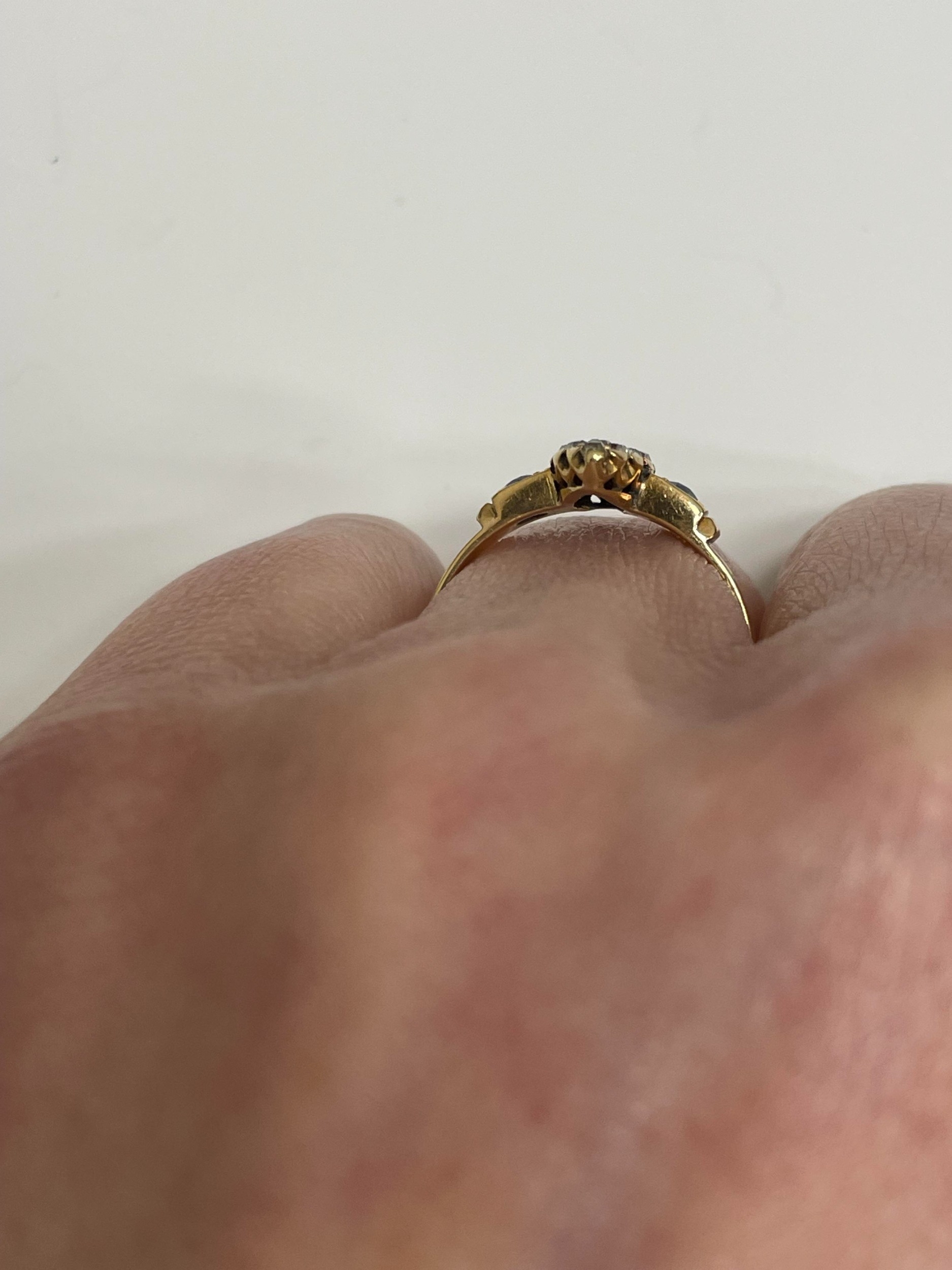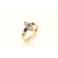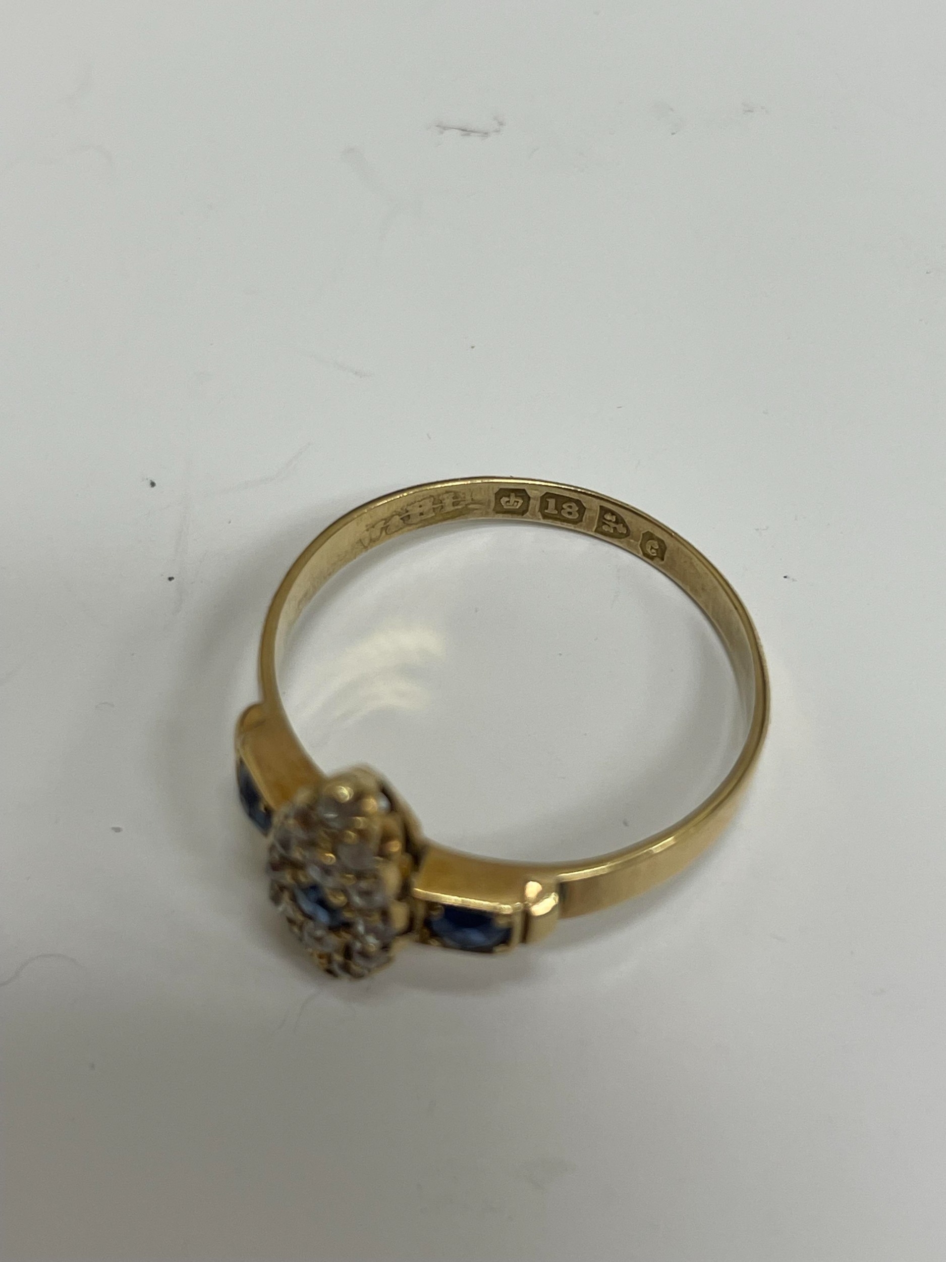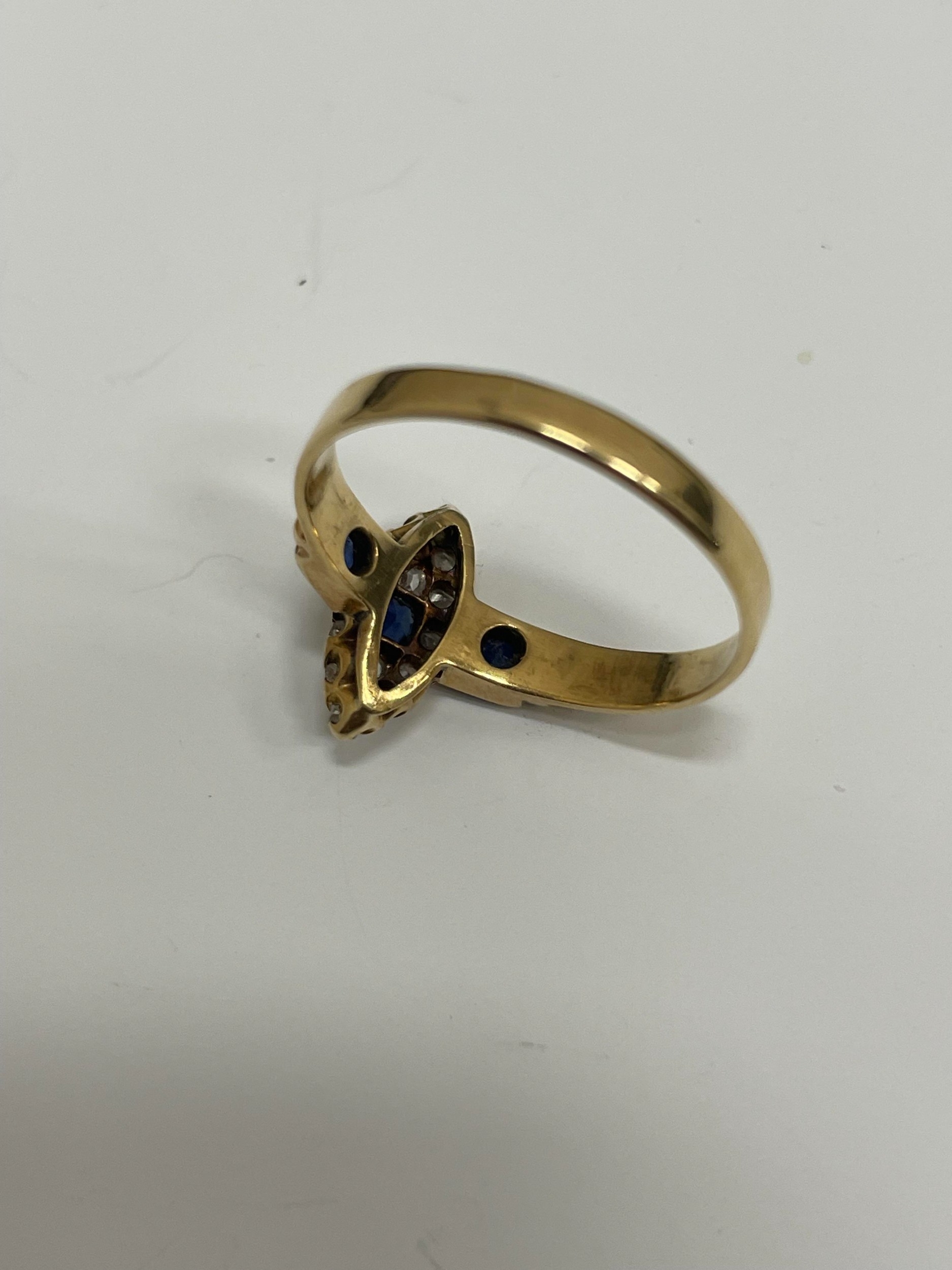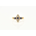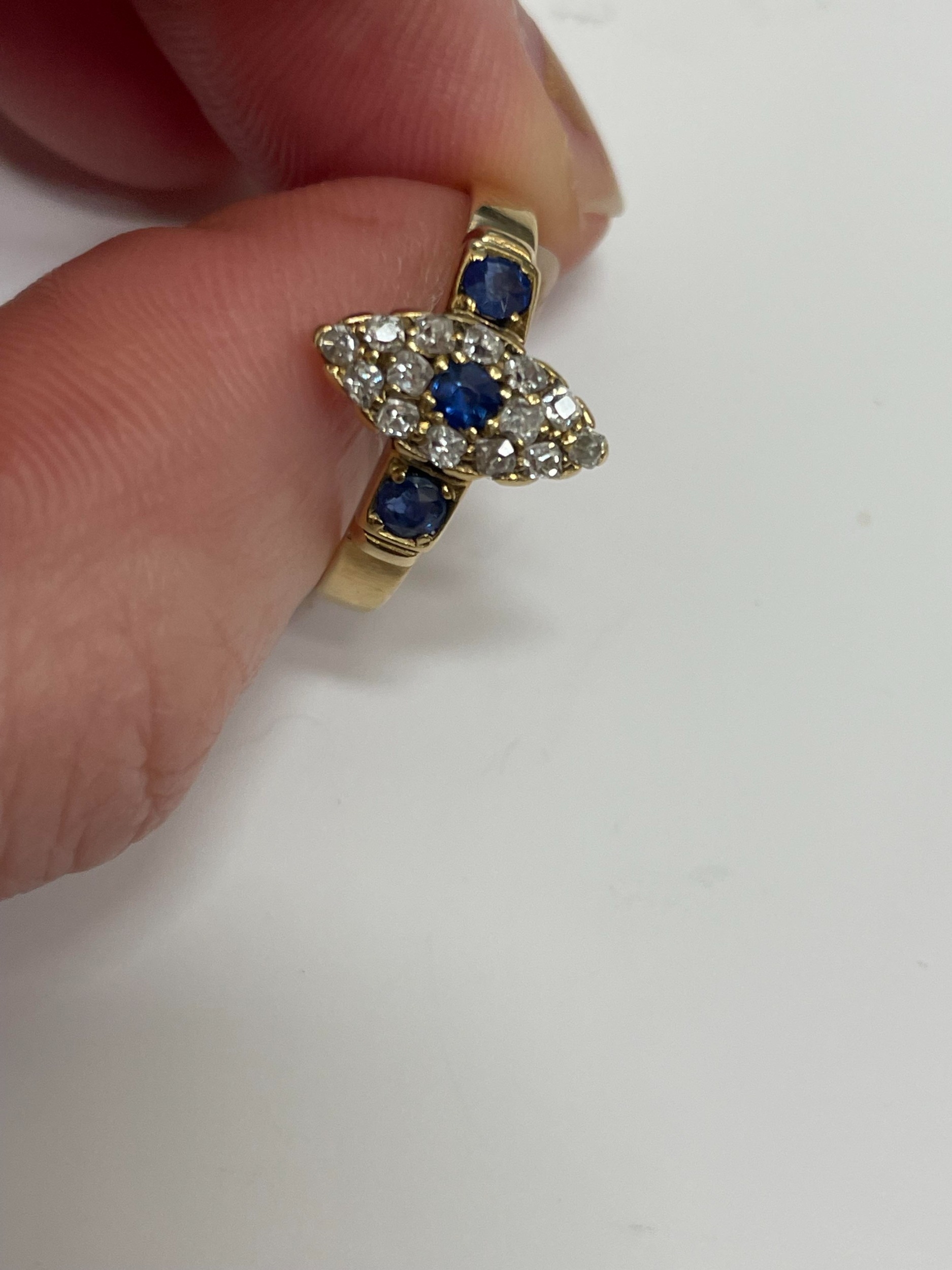 An 18ct gold Edwardian sapphire and diamond ring, designed as a central round cut sapphire claw set within a navette cluster of fourteen mine cut diamonds, flanked to each side by a single round cut sapphire, all claw set in yellow gold to yellow gold shank, ring size M 1/2, hallmarked Chester 1903, weight approx 2.2g Condition:Hallmarks clear, rubbed makers mark 'W & HL', central navette cluster measures approx 12mm x 5mm, general wear commensurate with age but no significant visible damage, refer to images