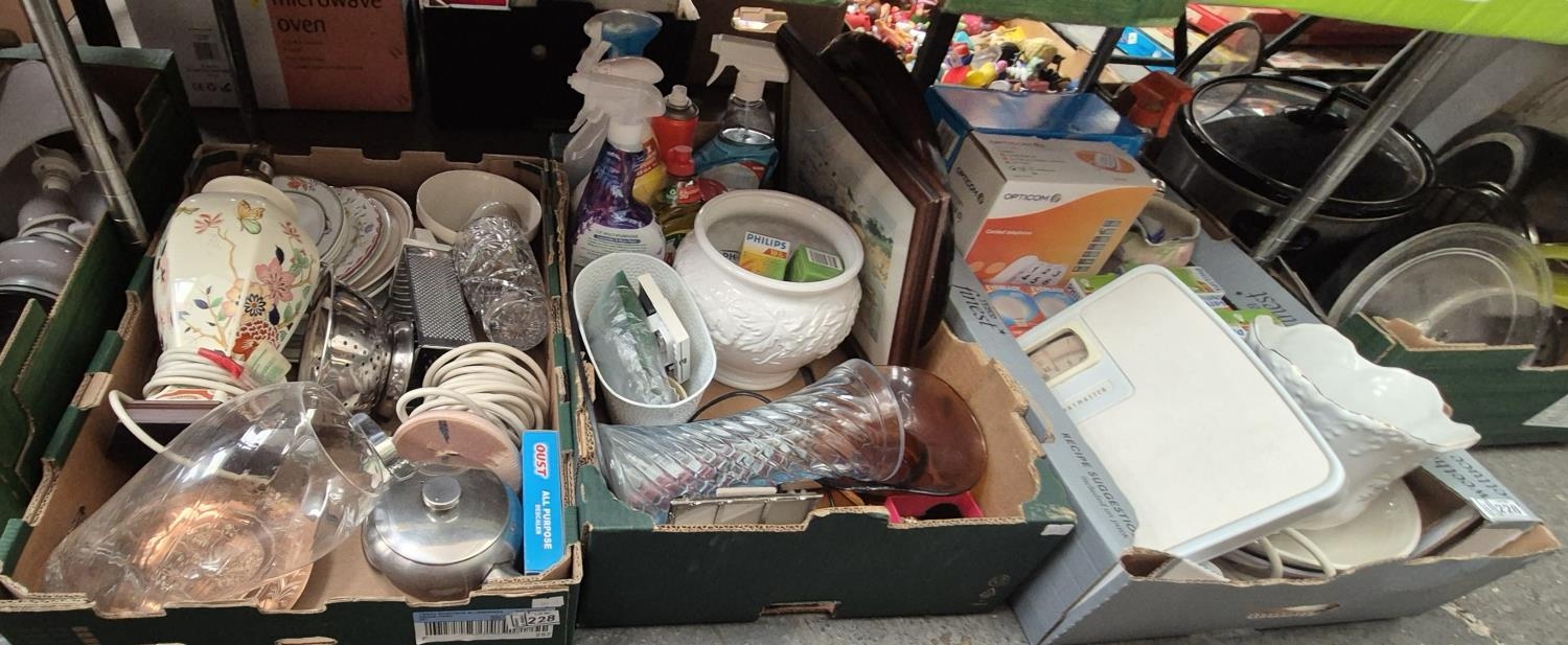 3 Boxes containing lamps, home items, light bulbs, ceramics etc