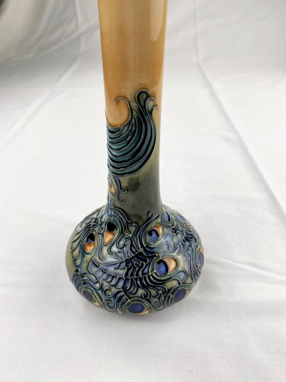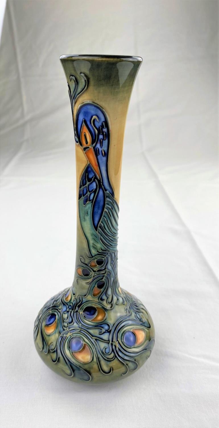 A Moorcroft vase with squat body & tall slender neck decorated with a peacock impressed & monogrammed height 20cm (seconds line in silver)