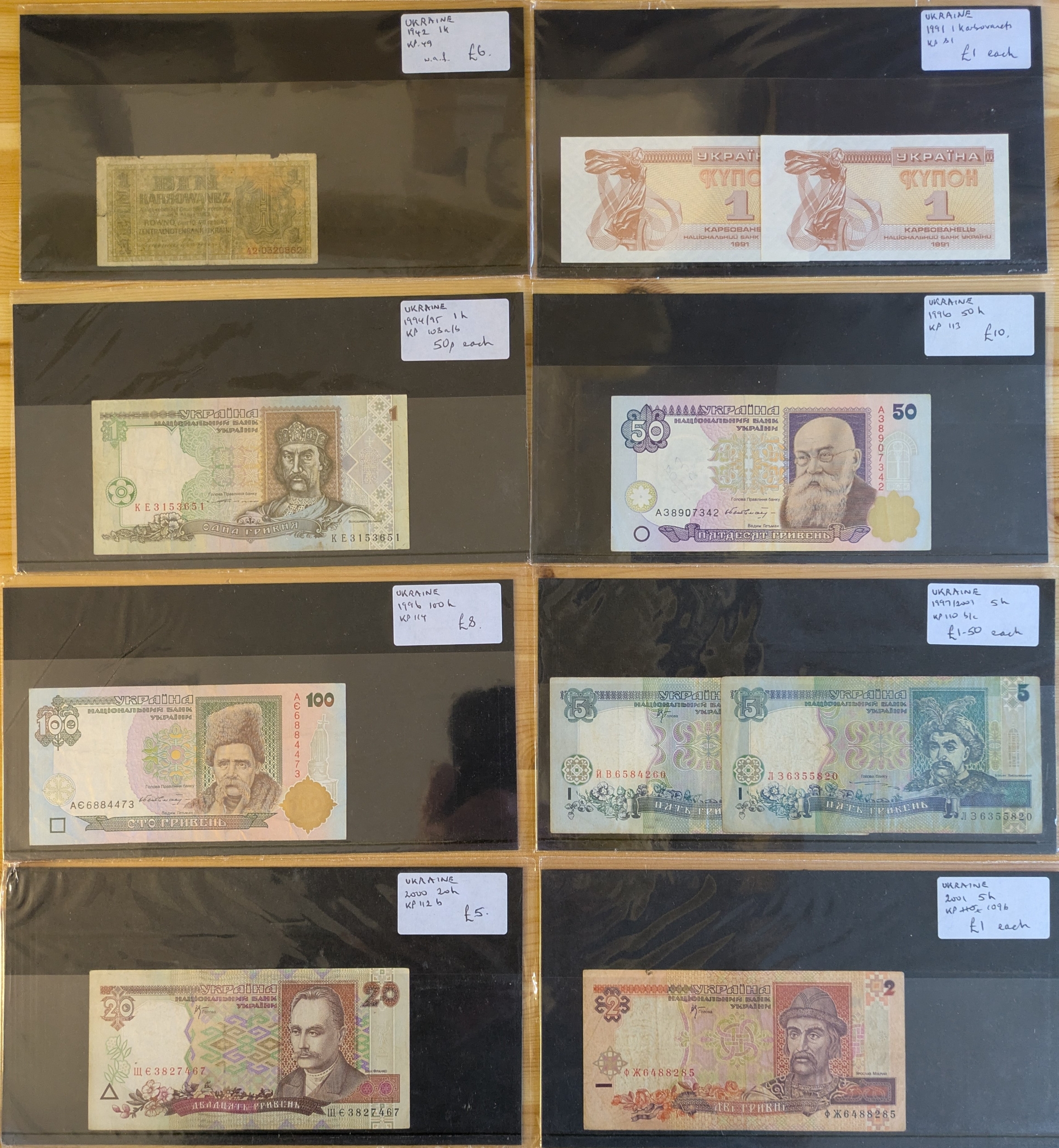 BanknotesUkraine; 1942-2001 seln. of eight different (plus 2 duplicates), priced retail at £35½.
