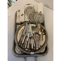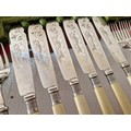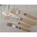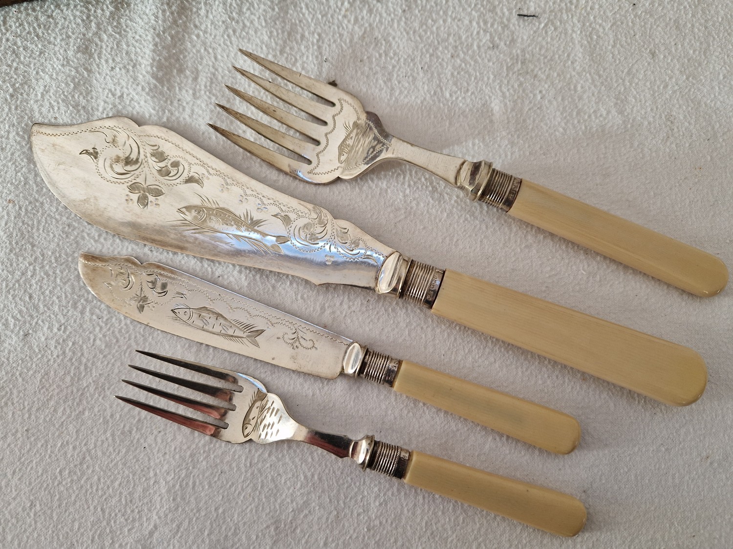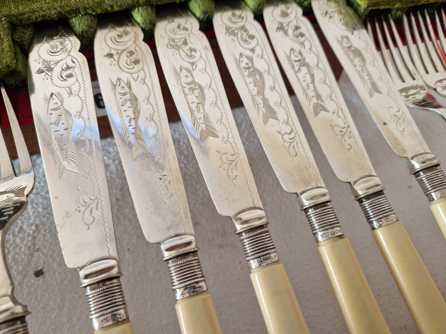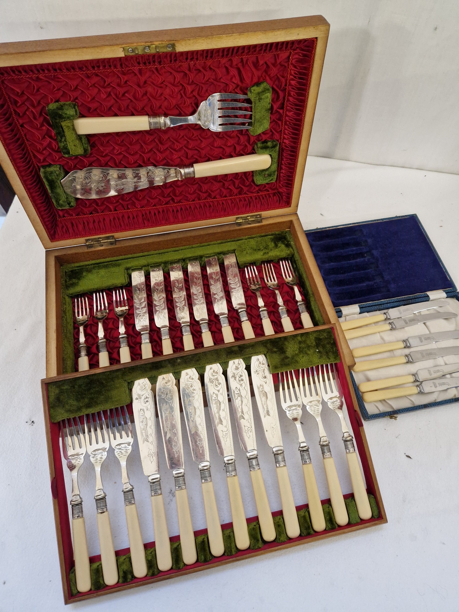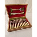 Oak canteen of Sheffield 1899 silver collared, bone handled 6 place fish serve and 6 place hors d’oeuvres serve plus a set of 6 bone handled butter knives