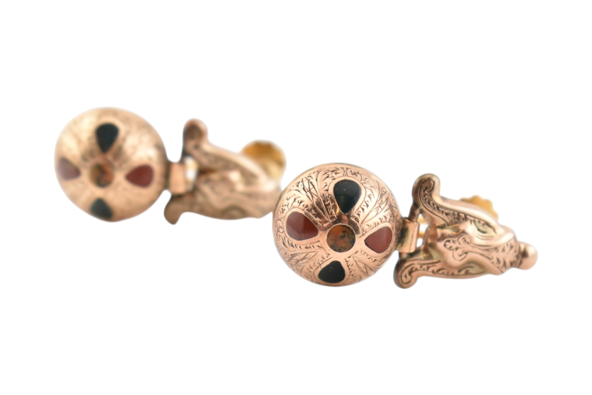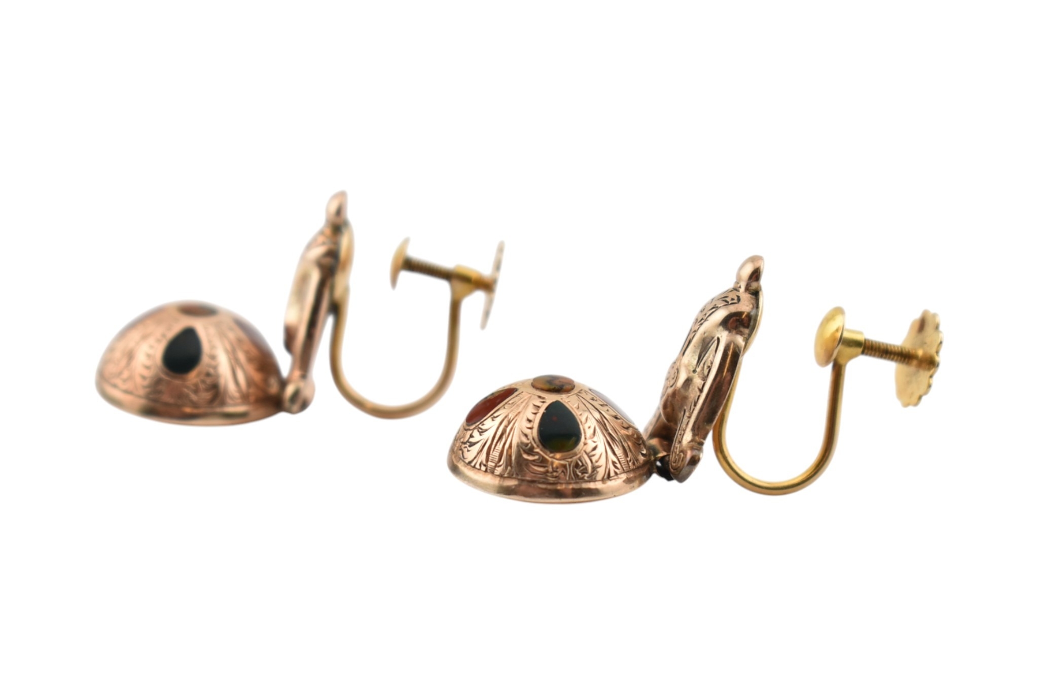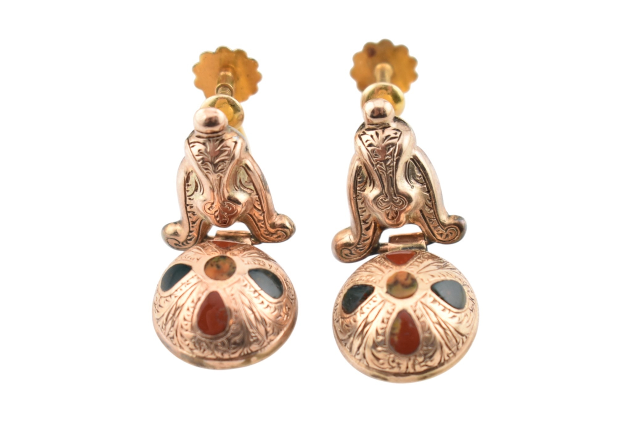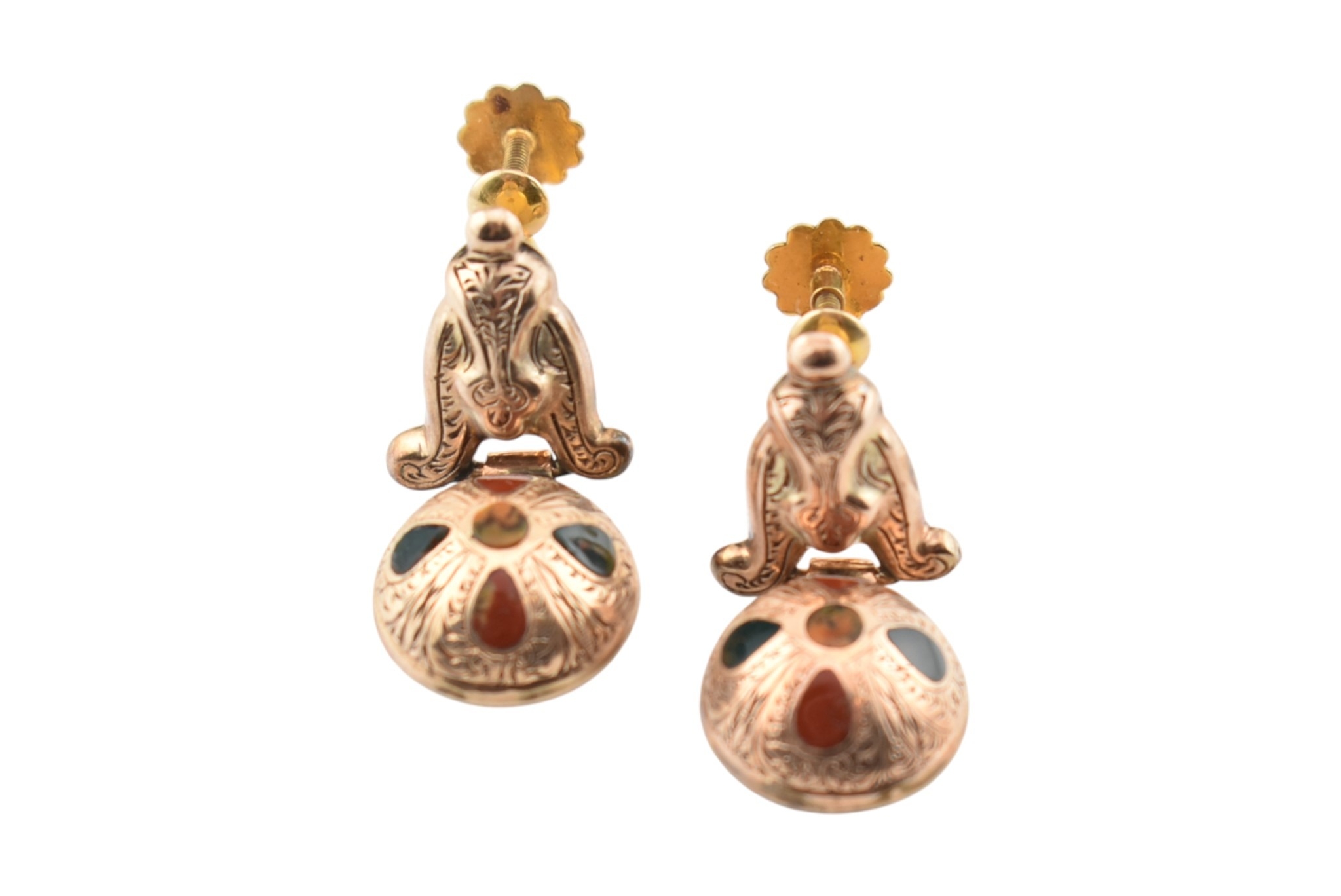 Pair of 19th-century gold pendant earrings. The earrings set with stone specimen samples with scroll decoration. The earrings being converted to screw backs. Weight 4.7g. Measures 2.6cm.