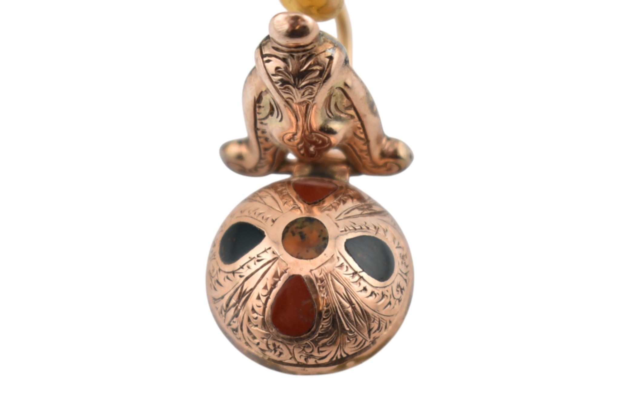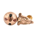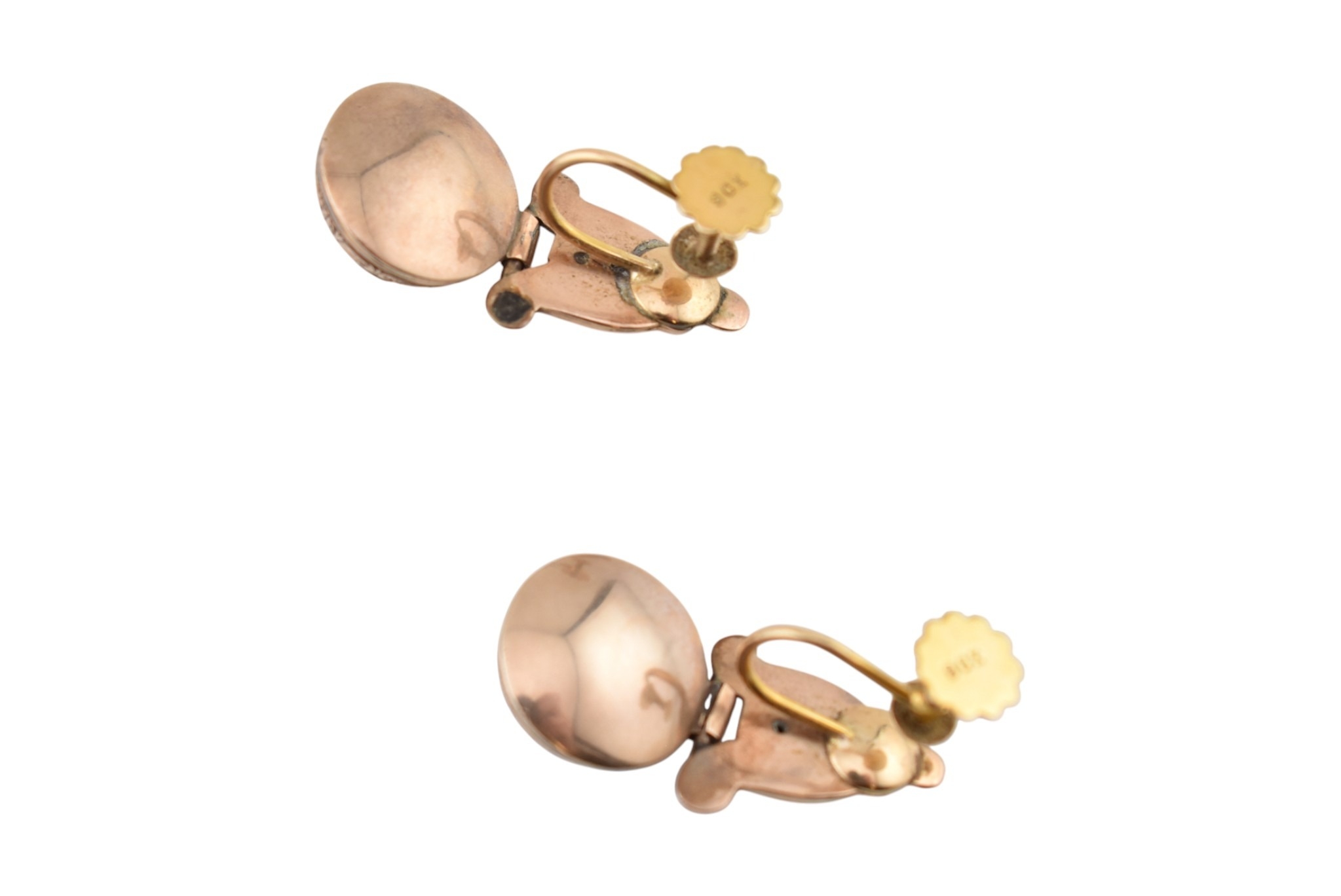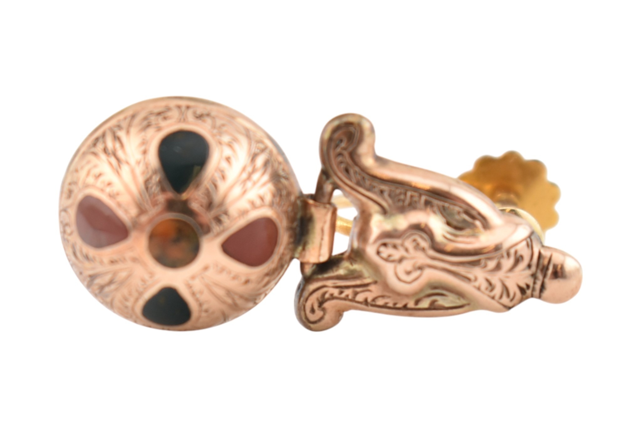 Pair of 19th-century gold pendant earrings. The earrings set with stone specimen samples with scroll decoration. The earrings being converted to screw backs. Weight 4.7g. Measures 2.6cm.