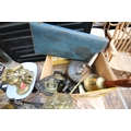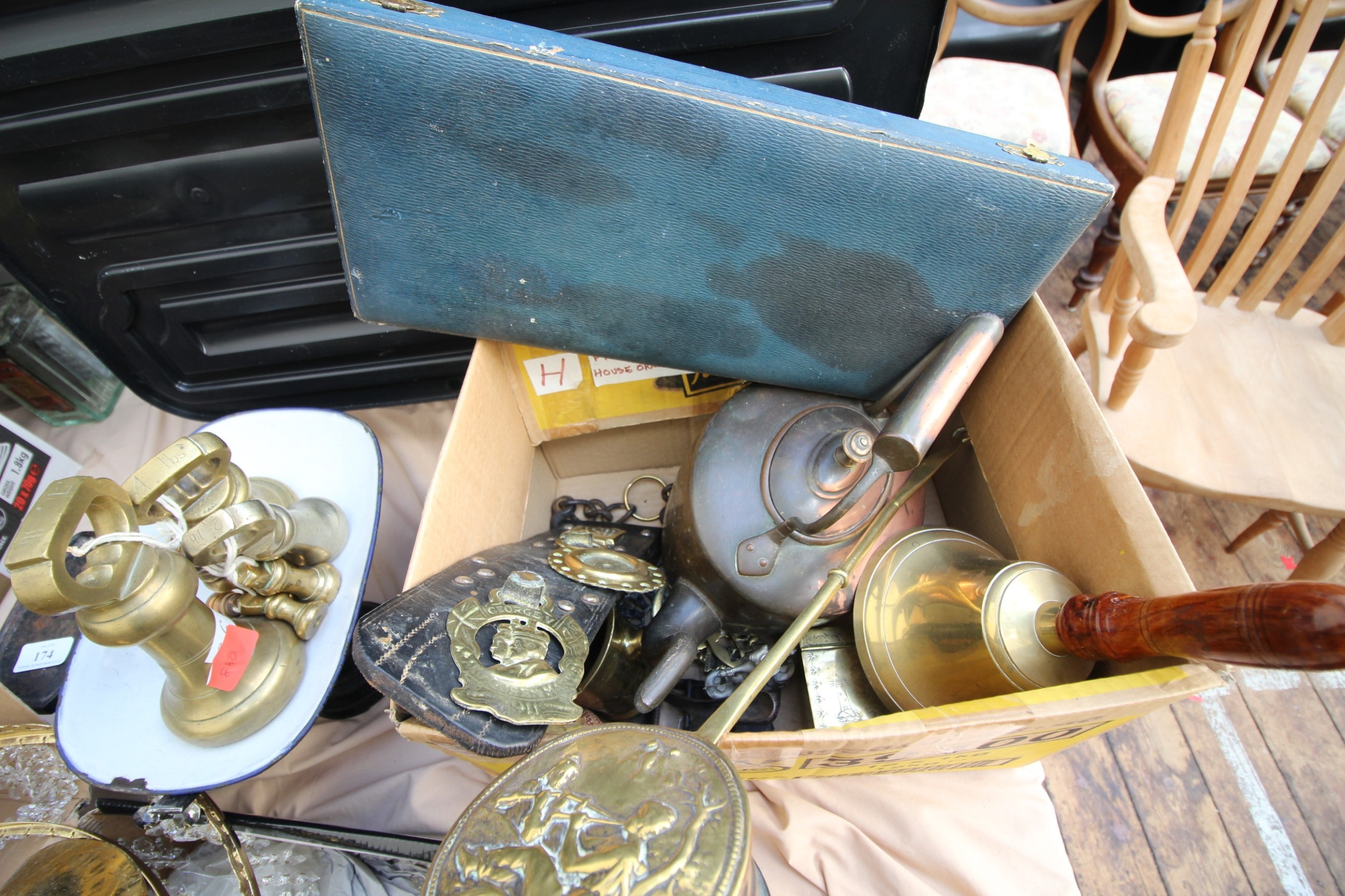 Collection of copper items including antique kettles, chestnut roaster, school bell, mortar and pestle and horse brasses together with other items