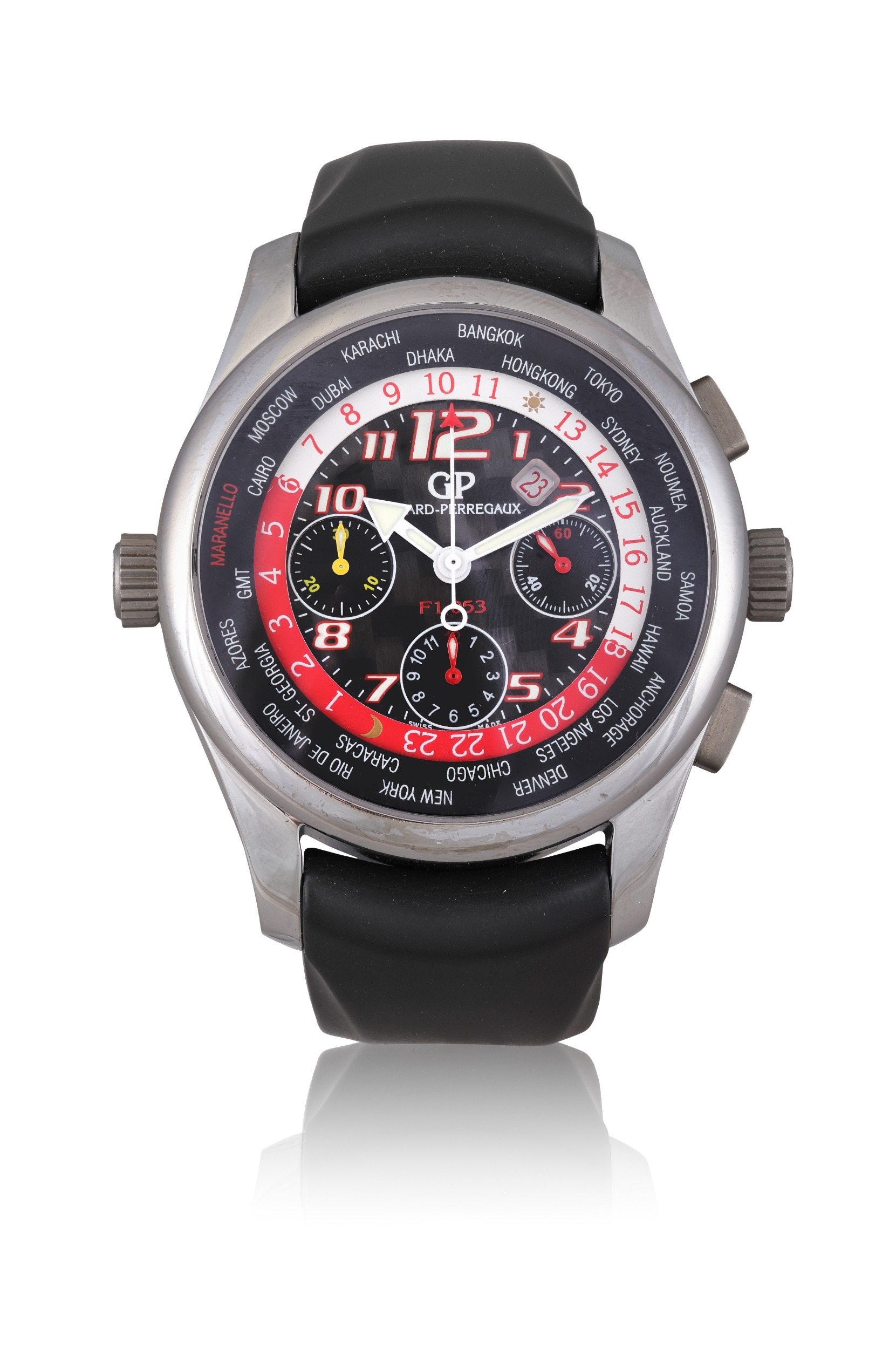 GIRARD-PERREGAUX FERRARI F1, REF. 49800, TITANIUM A sporty titanium automatic chronograph wristwatch with world time indication, produced in collaboration with Ferrari. Year: Circa 2000s Dial: Black multi-layer dial with applied Arabic numerals and luminous indexes, outer world time chapter ring with city indications, inner 24-hour ring in red, three subsidiary registers (30-minute counter, running seconds and date indication), GP signature and Ferrari F1 logo, broad luminous hands including arrow-tipped GMT hand Calibre: Automatic, cal. 3387, 67 jewels Case: Titanium, No. 5, engraved Ferrari F1 053, display caseback Dimensions: 42 mm Gross Weight: 105.25 g approx. Bracelet/Strap: Girard-Perregaux rubber strap with GP folding clasp Accessories: None Signature: Dial, case and movement signed