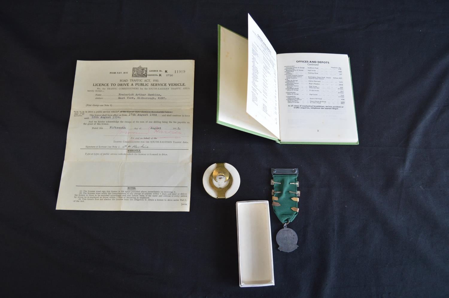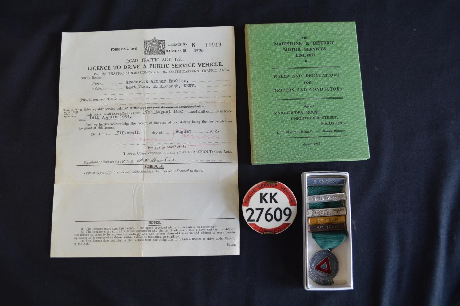1933 paper licence to drive a Public Service Vehicle together with Public Service Vehicle driver badge No. KK27609, Rules & Regulations for Drivers & Conductors Handbook and 1970's National Safe Driving Award with five year bars