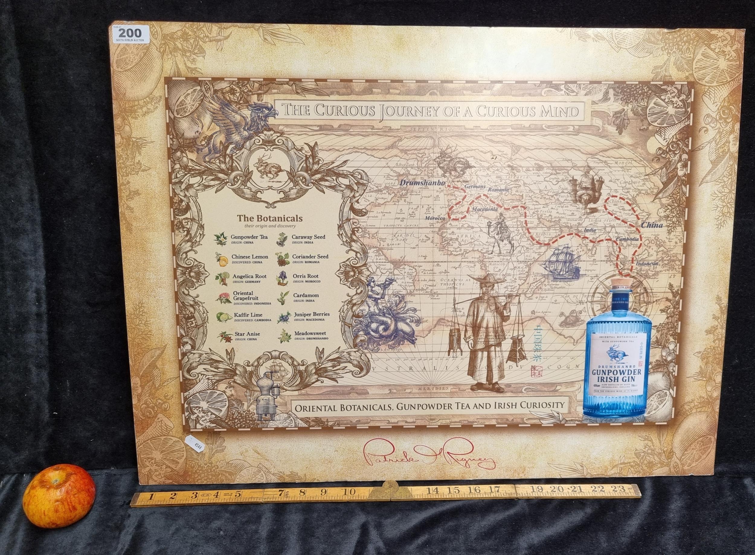 Advertising sign for Drumshanbo Irish gin 'The Curious Journey of a Curious Mind' in the style of an Age of Exploration map.