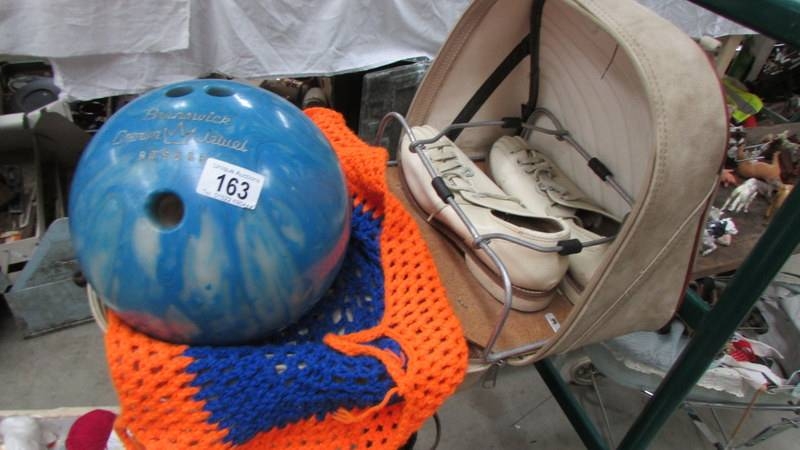 A pair of size 8 bowling shoes and a Brunswick 'Crown Jewel' bowling ball with bag. (Collect only)