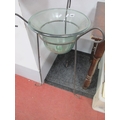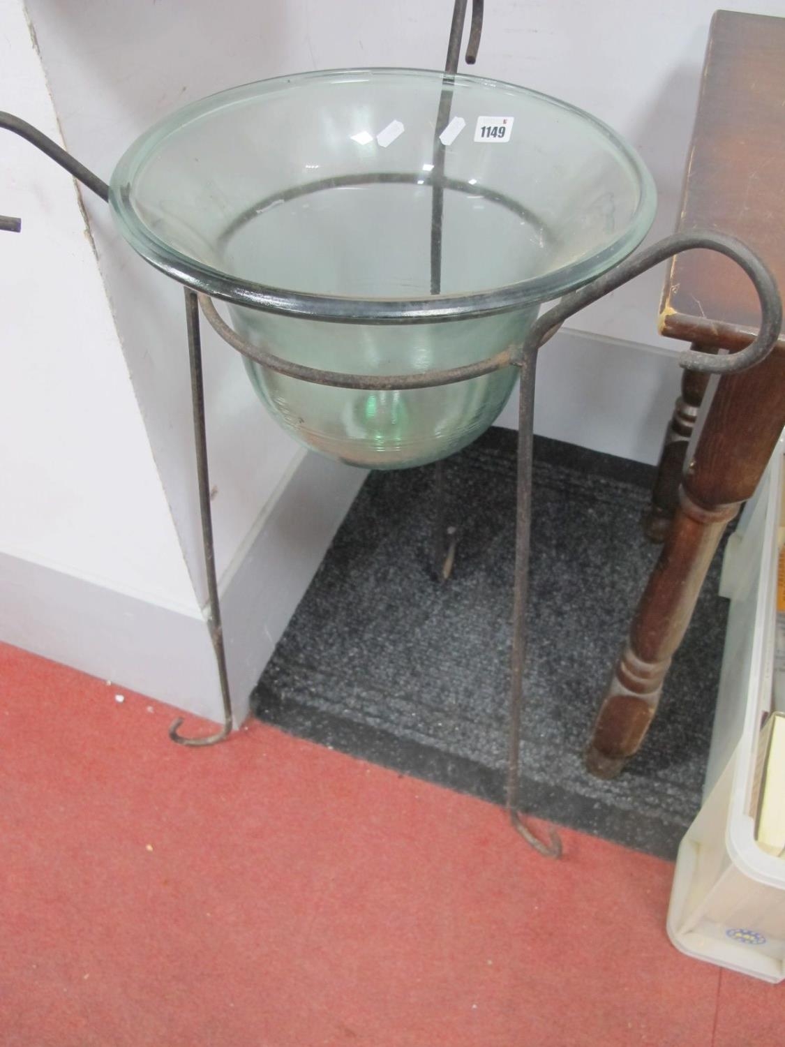 A Jardiniere Stand, with a glass bell bowl, on a wrought iron stand.