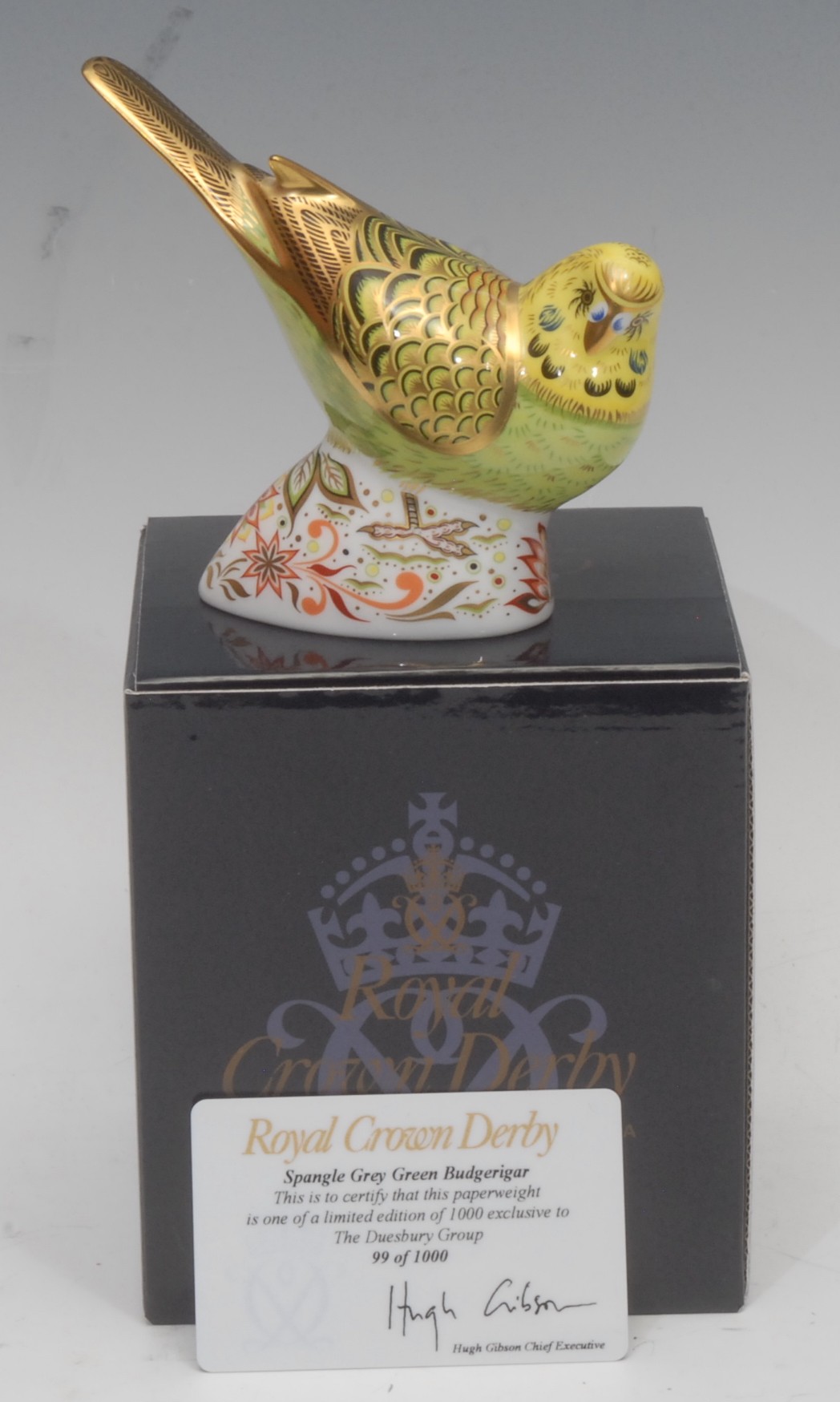 A Royal Crown Derby paperweight, Spangle Grey Green Budgerigar, exclusive to The Duesbury Group, limited edition 99/1,000, gold stopper, 11cm, printed mark in red, certificate, boxed