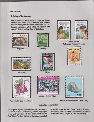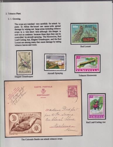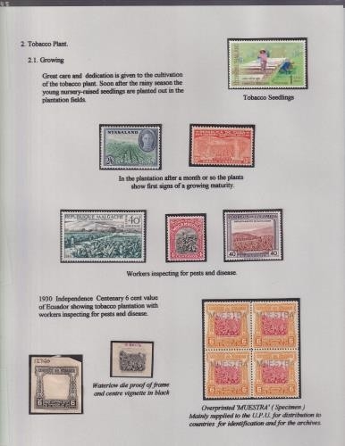 TOBACCO THEMATIC - Fabulous 54 page exhibit. Presented in the highest order with much useful early material (100's) noting USA 1893 Columbus issues to 15c mint. Ecuador waterlow die proofs (2) 1855 Entire written by a Snuff manufacturer. 1865 Gorgeous Petite Ornate Entire from a Pipe Manufacturer. Victoria 1895 Ornate Advert Card, Wartime Tobacco Cards FU (4) USA Advert Covers FU and much more. Scans advised. Excellent quality.