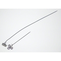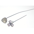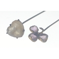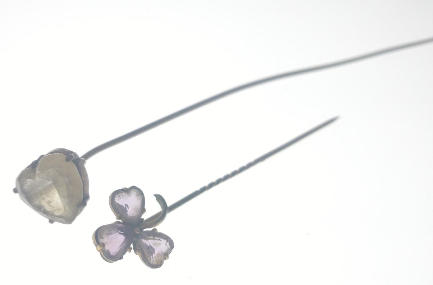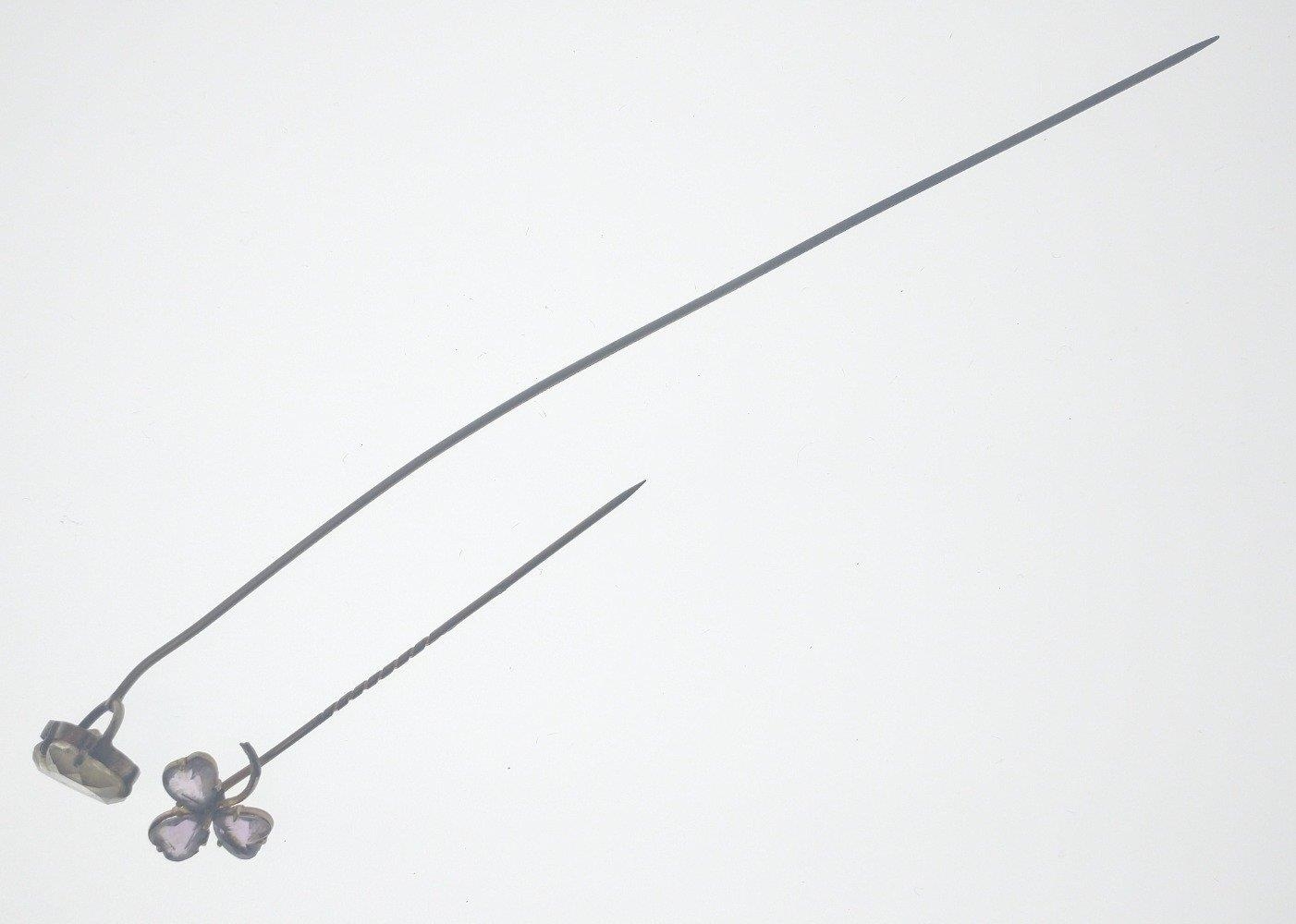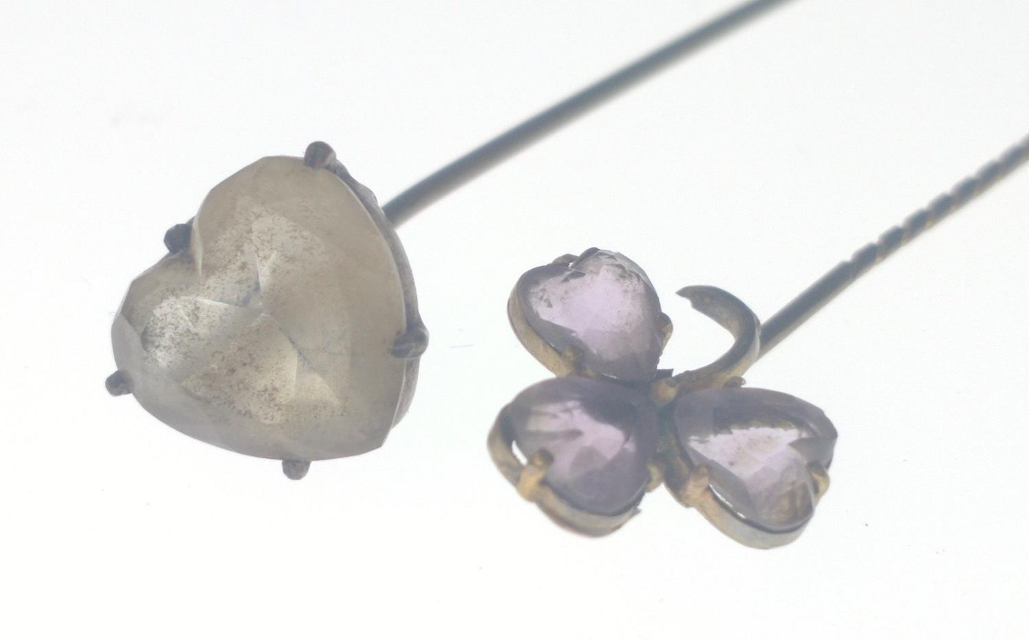 A VICTORIAN large 'yellow metal' hat pin with a heart shaped white stone inset 17.5cm long approx weight 3.50g approx, with also a small VINTAGE 'yellow metal' pin brooch in floral form with 3 small amethyst love heart shaped petals 7.5cm long approx weight gross 1.90g approx