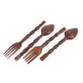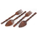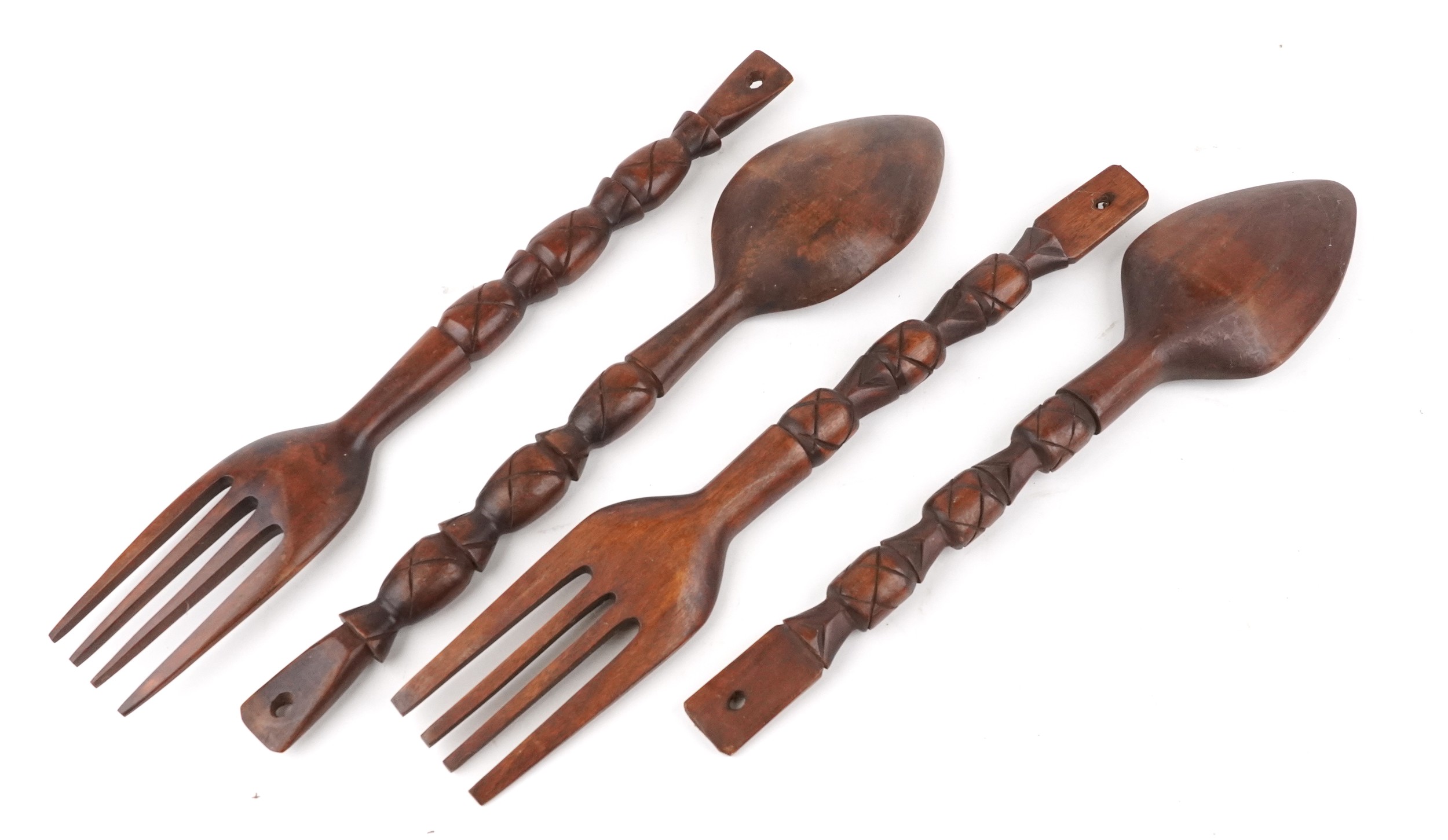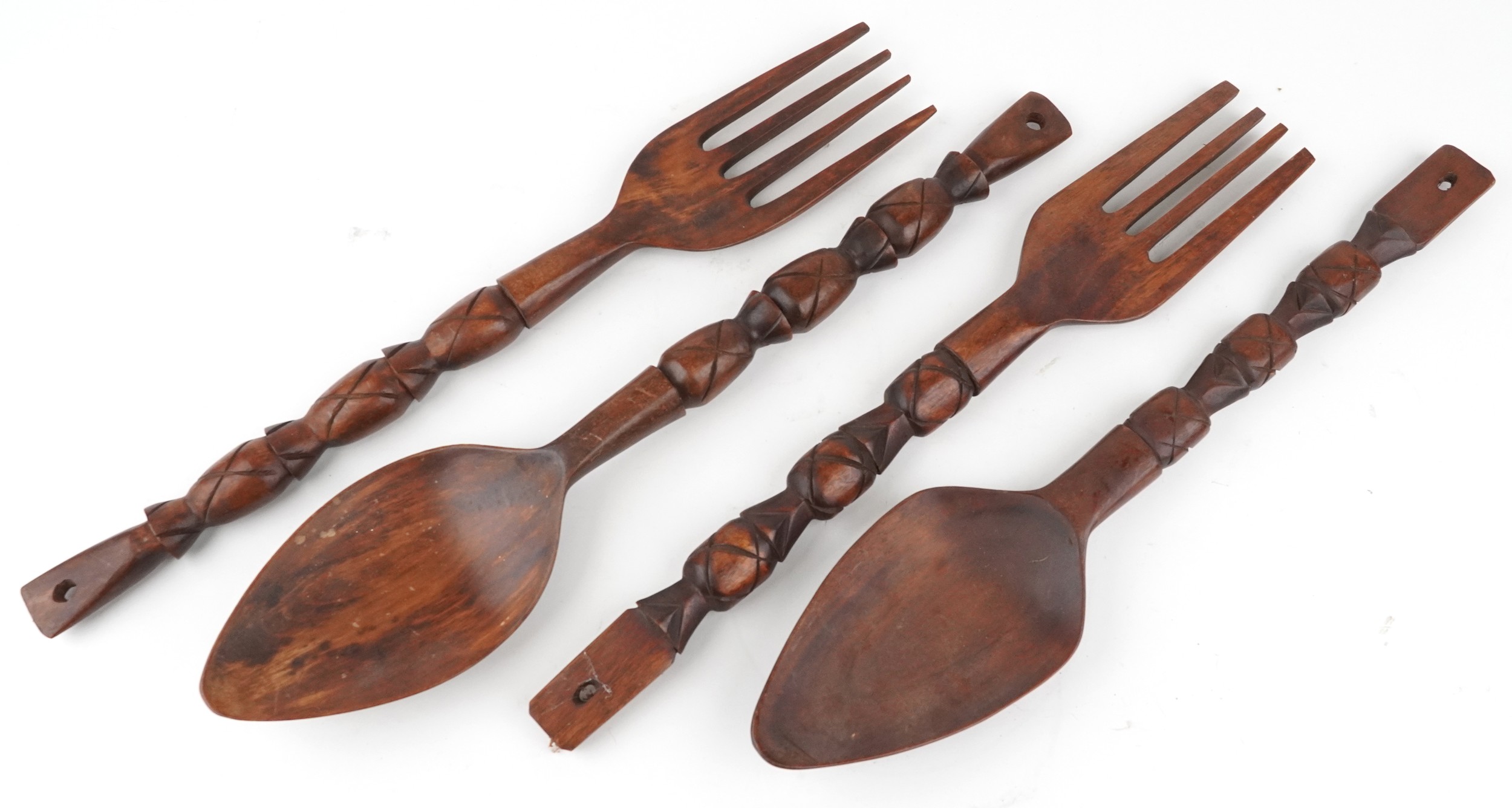 Four large carved softwood decorative forks and spoons, 69cm in length.