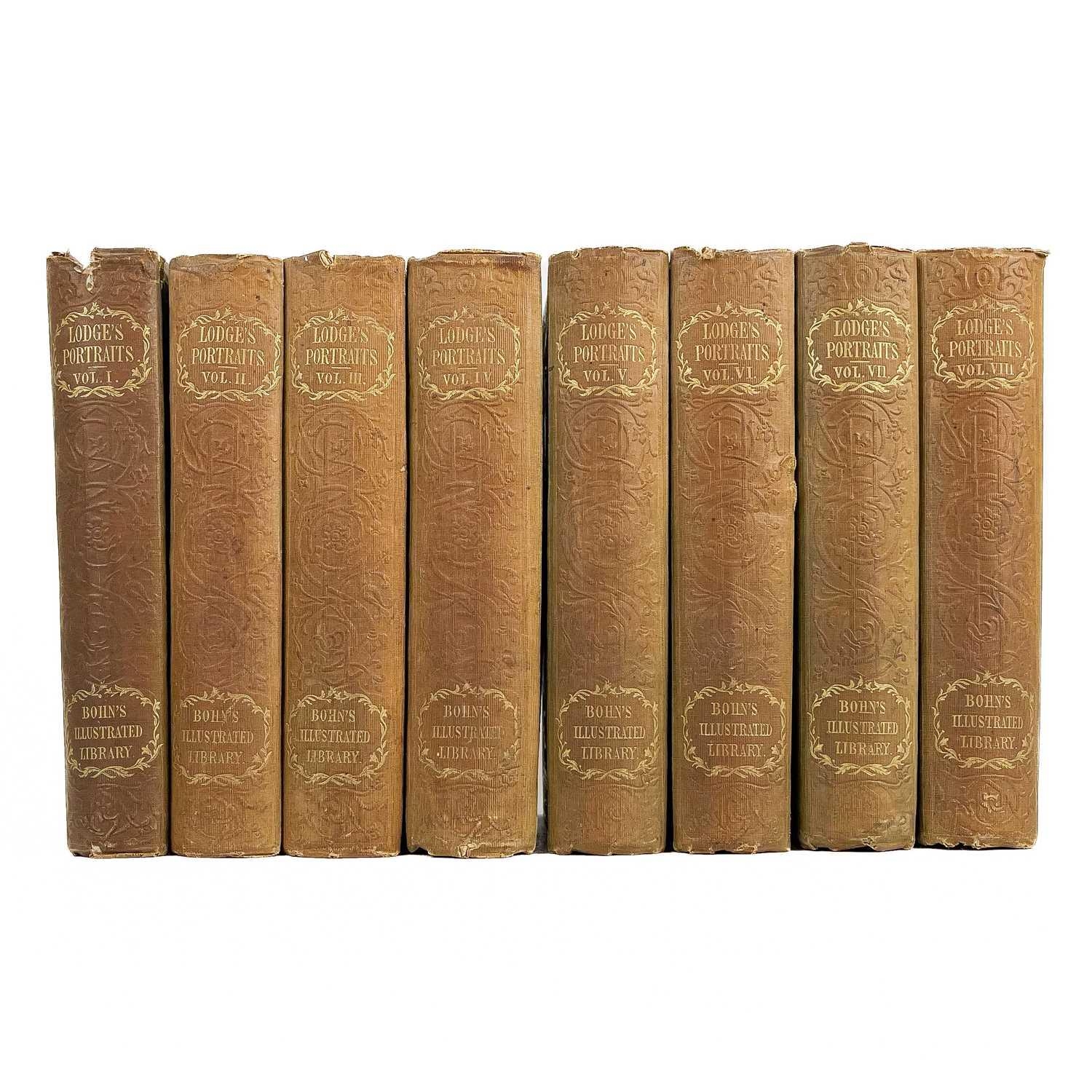 EDMUND LODGE (1756-1839) Portraits of illustrious personages of Great Britain 8 vols; Henry G. Bohn, York Street, Covent Garden; original cloth boards with highly-decorative embossed decoration; adverts to endpapers and paste-down; 1849-1850.