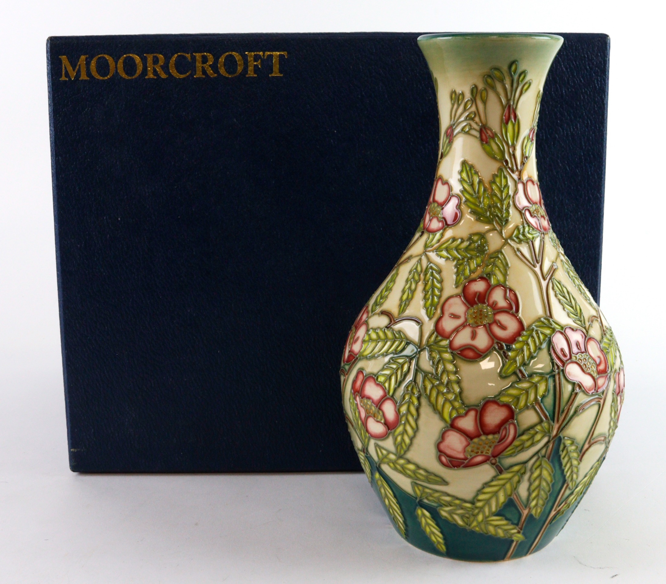 Moorcroft vase (pattern unknown, dated 7-5-03, makers marks to base, height 20cm approx., contained in a Moorcroft box