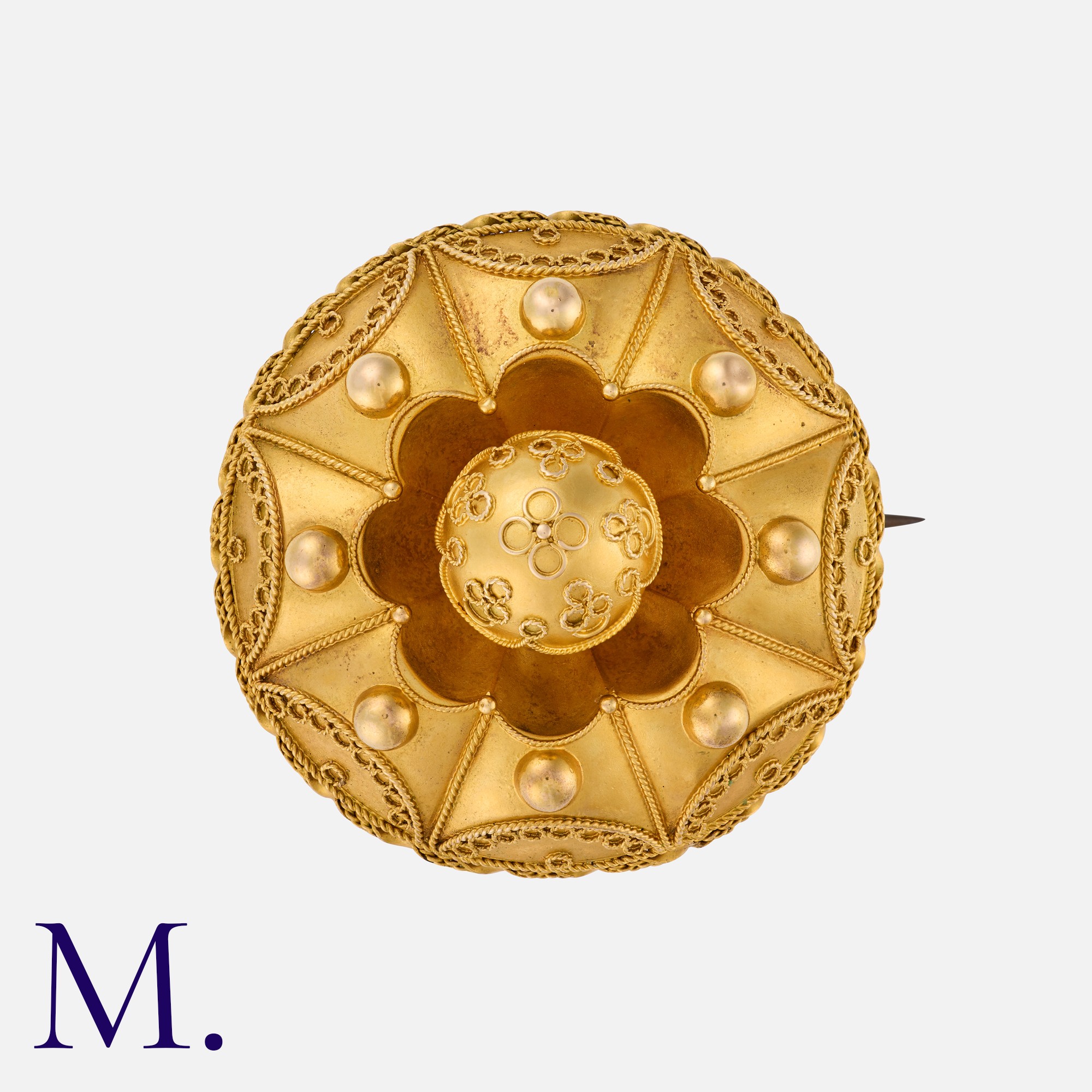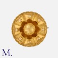 A Victorian, Etruscan Revival Brooch in yellow gold, of domed, circular form, with wirework and beading detail, featuring a glass locket back. Unmarked but tests indicate 15 carat gold.