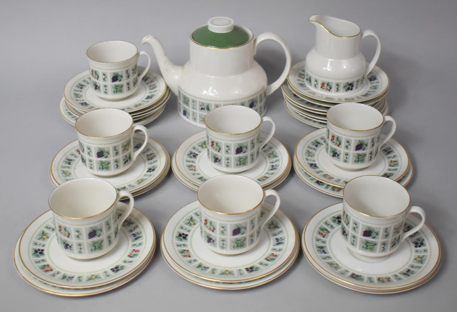A Royal Doulton Tapestry Pattern Tea Set to comprise Teapot, Seven Cups, Saucers, Side Plates Jugs Etc