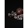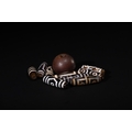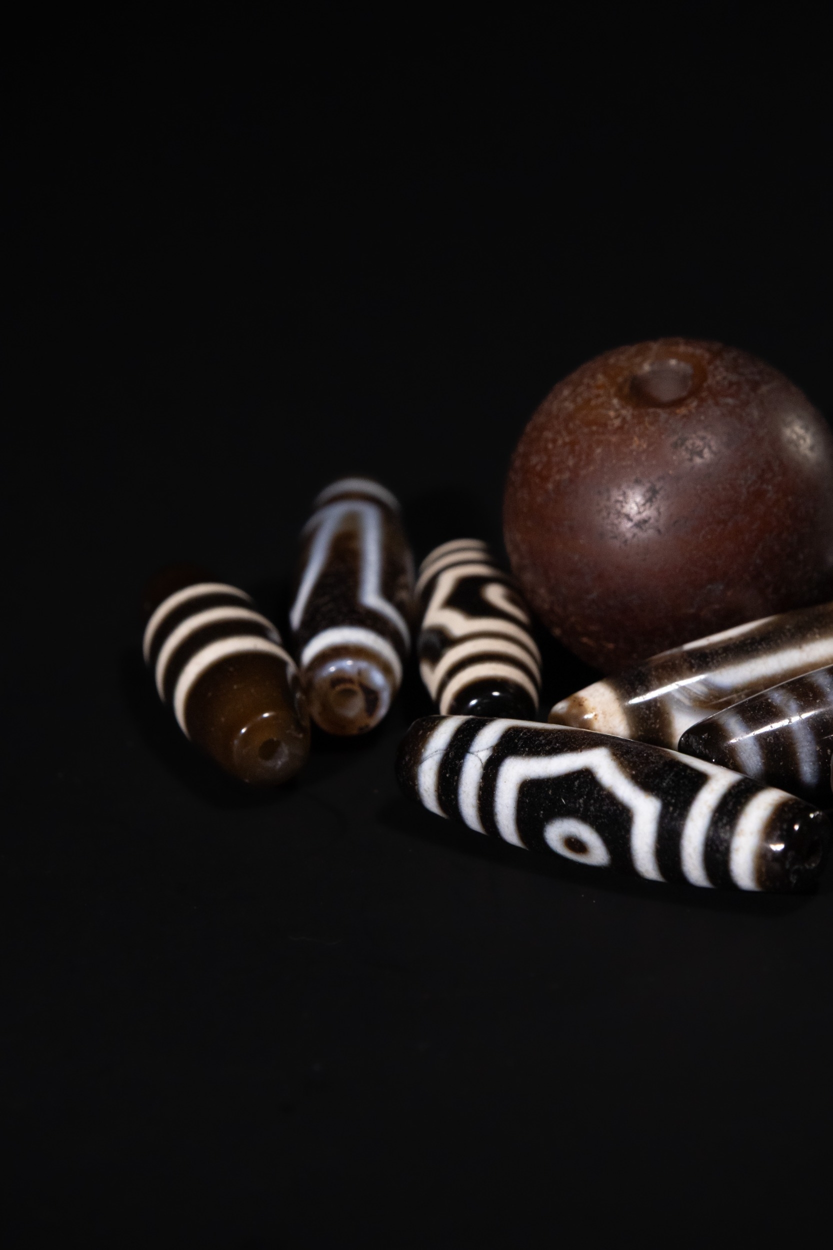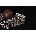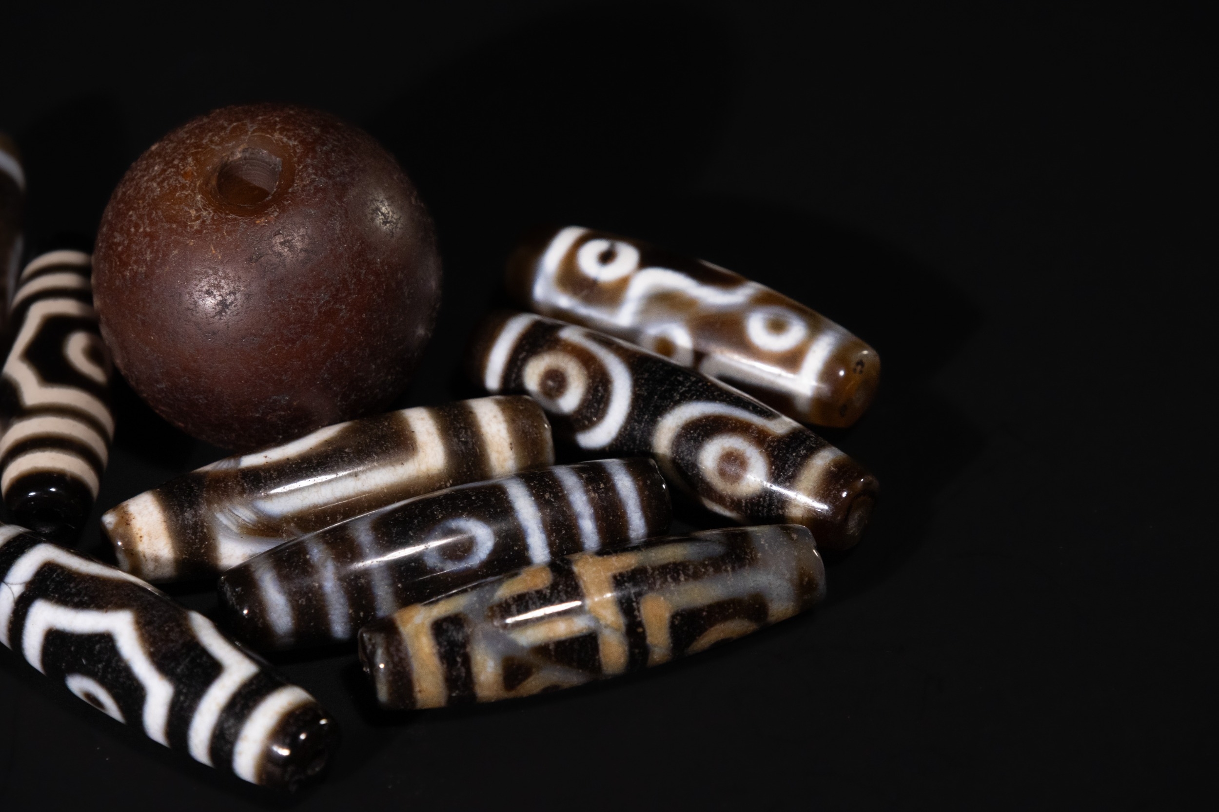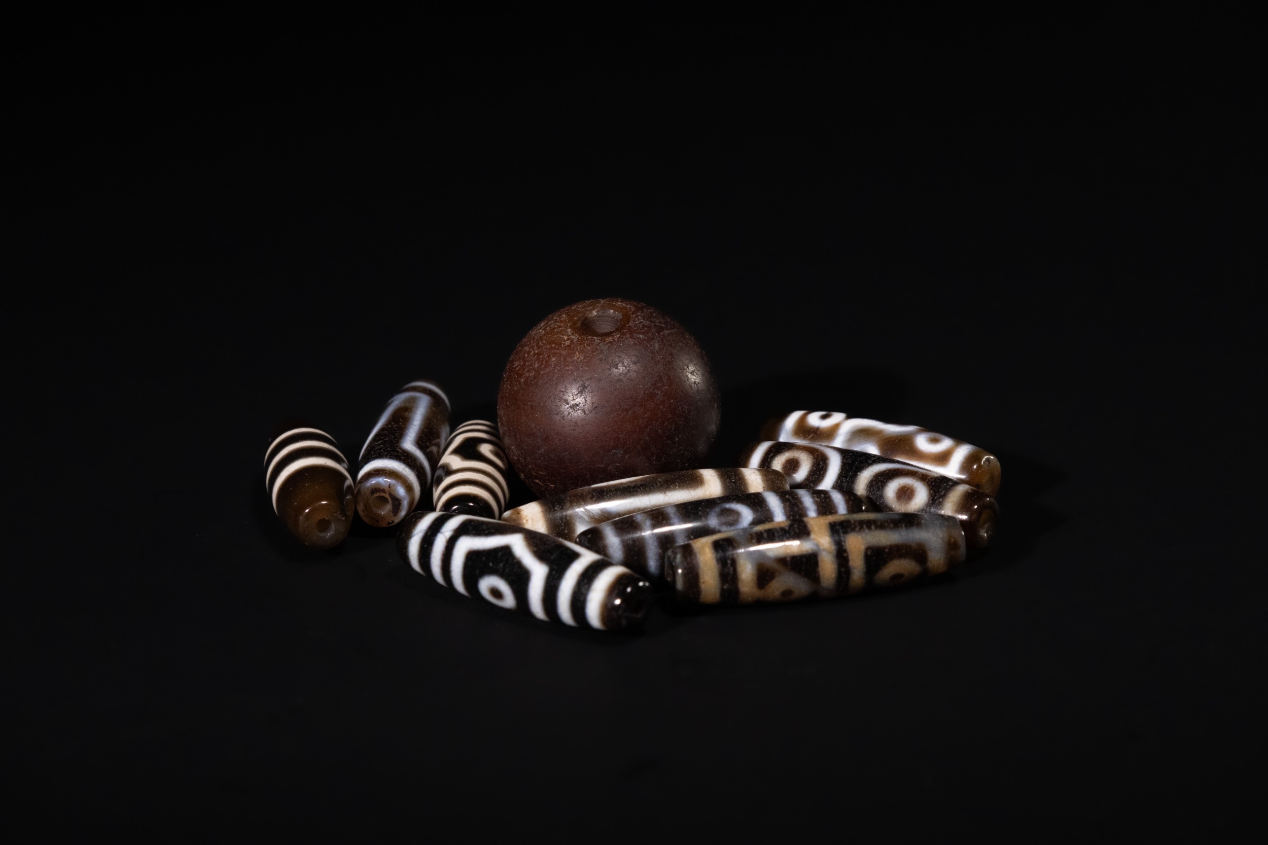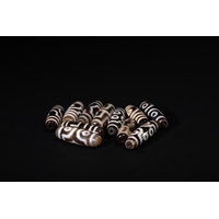 A Lot of Ten Tibetan Agate Dzi Beads, including Three-Eyed Motifs - A collection of ten Tibetan Agate Dzi beads. Comprising one large, spherical, matte dark brown bead and nine elongated, cylindrical or barrel-shaped beads. The smaller beads are crafted from polished, translucent banded agate, featuring intricate black and white (or dark brown and cream) 'eye' patterns, concentric circles, and geometric designs characteristic of Dzi beads. All beads are centrally drilled.