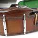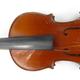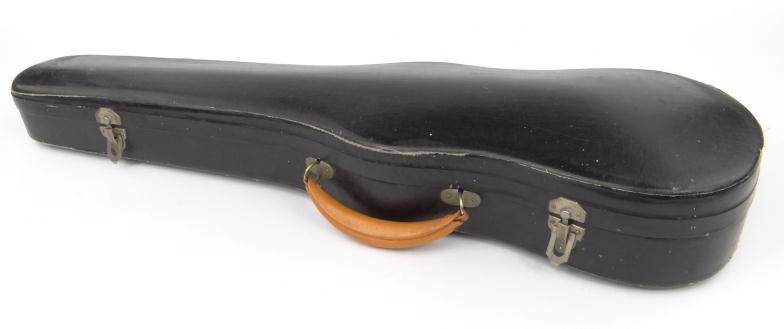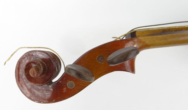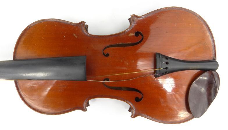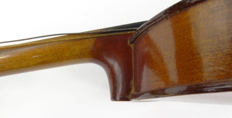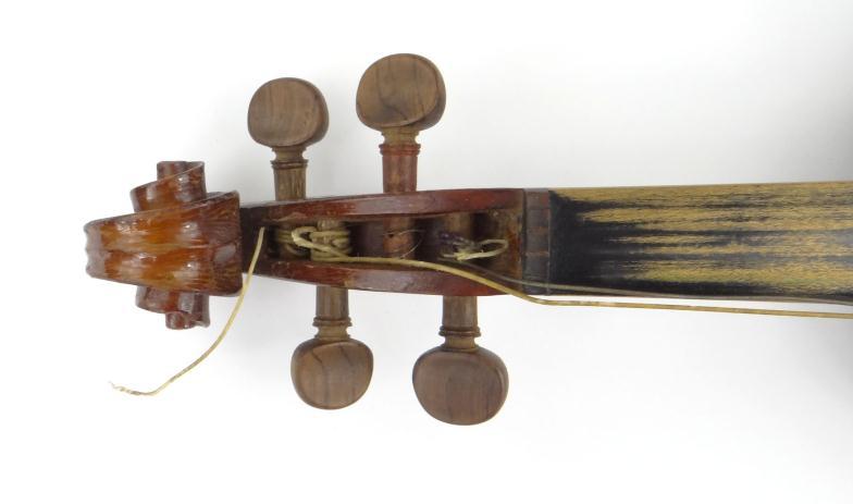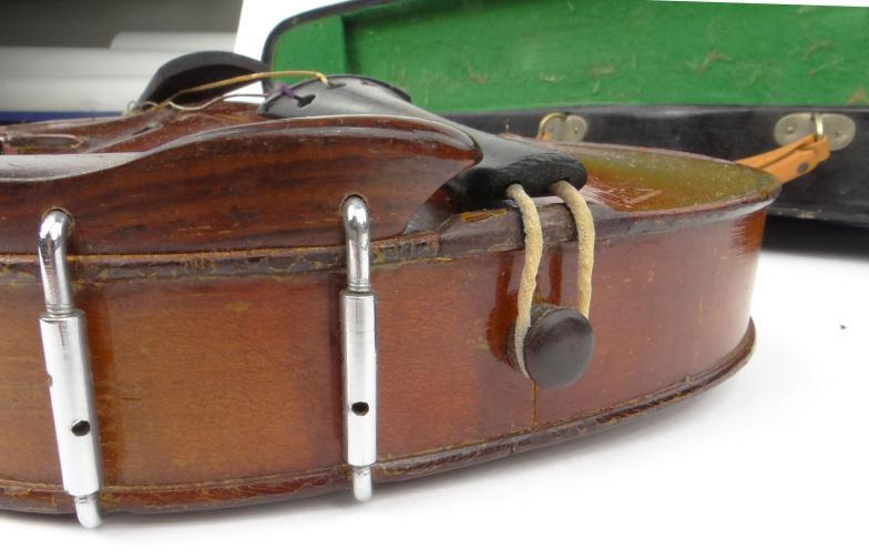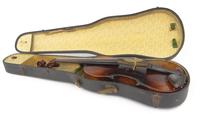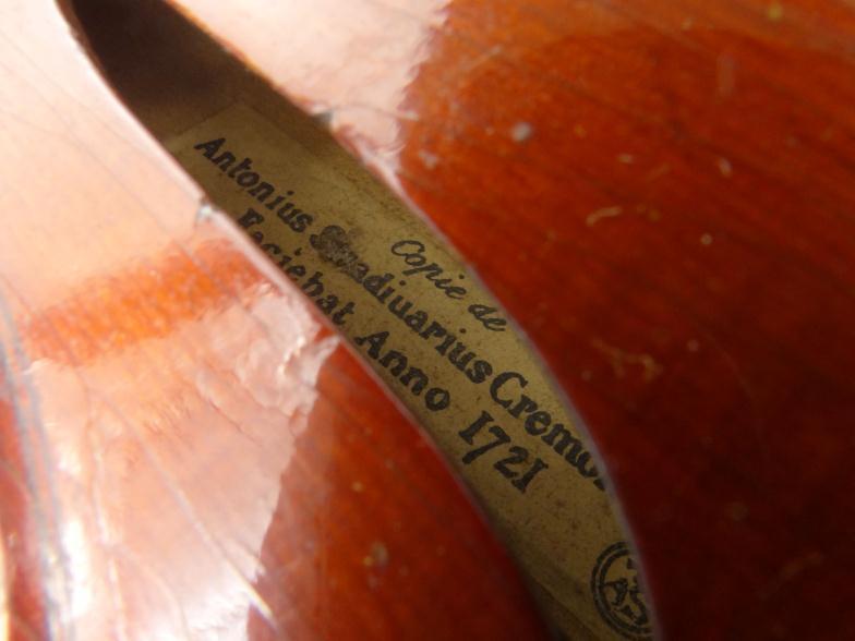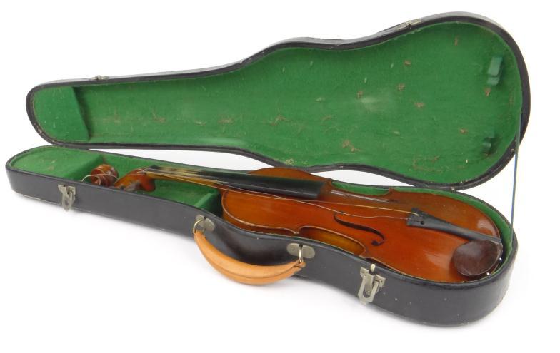 Old wooden Stradivarius copy violin with two piece back and ebonised fittings, housed in a baize lined case, the violin body 33.5cm in length