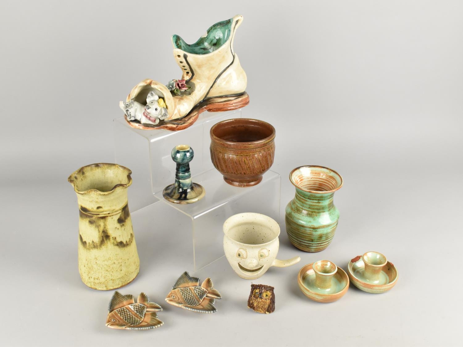 A Collection of Studio and Other Pottery to Comprise Vases, Shoe Ornament, Wade Fish Dishes etc (Various Condition)