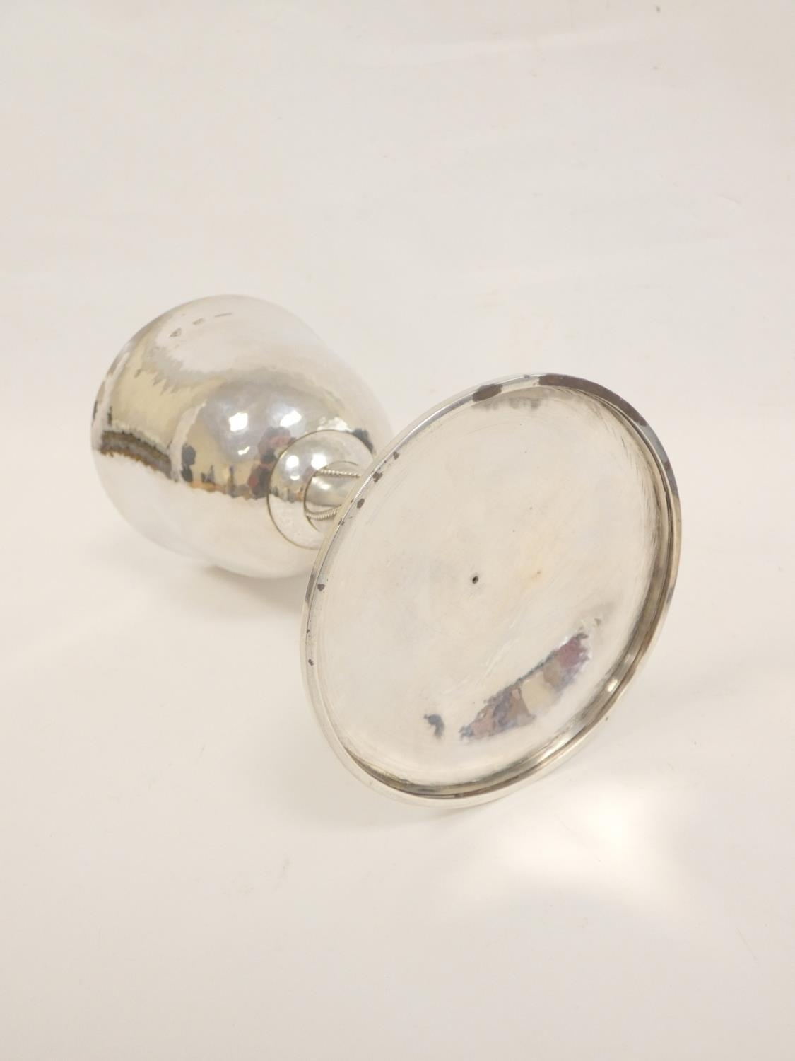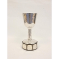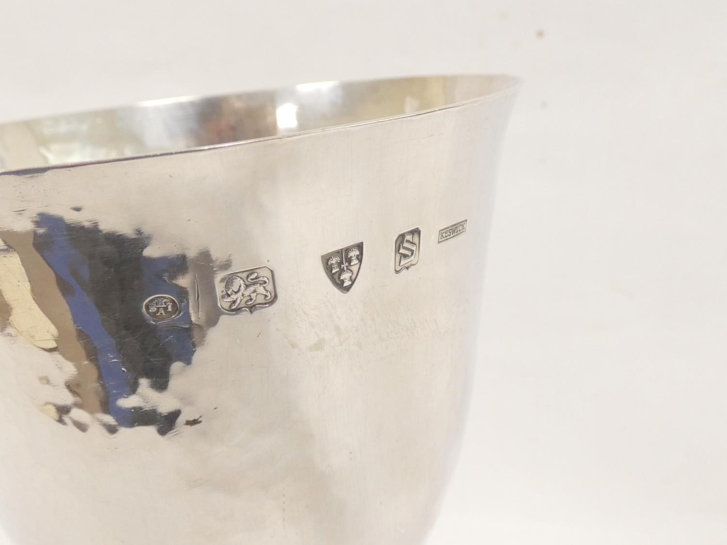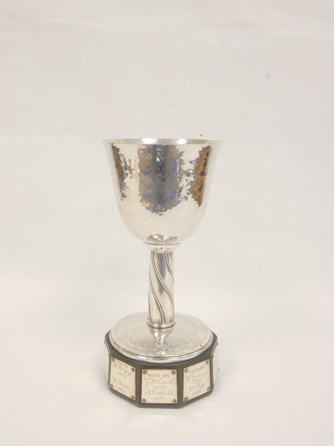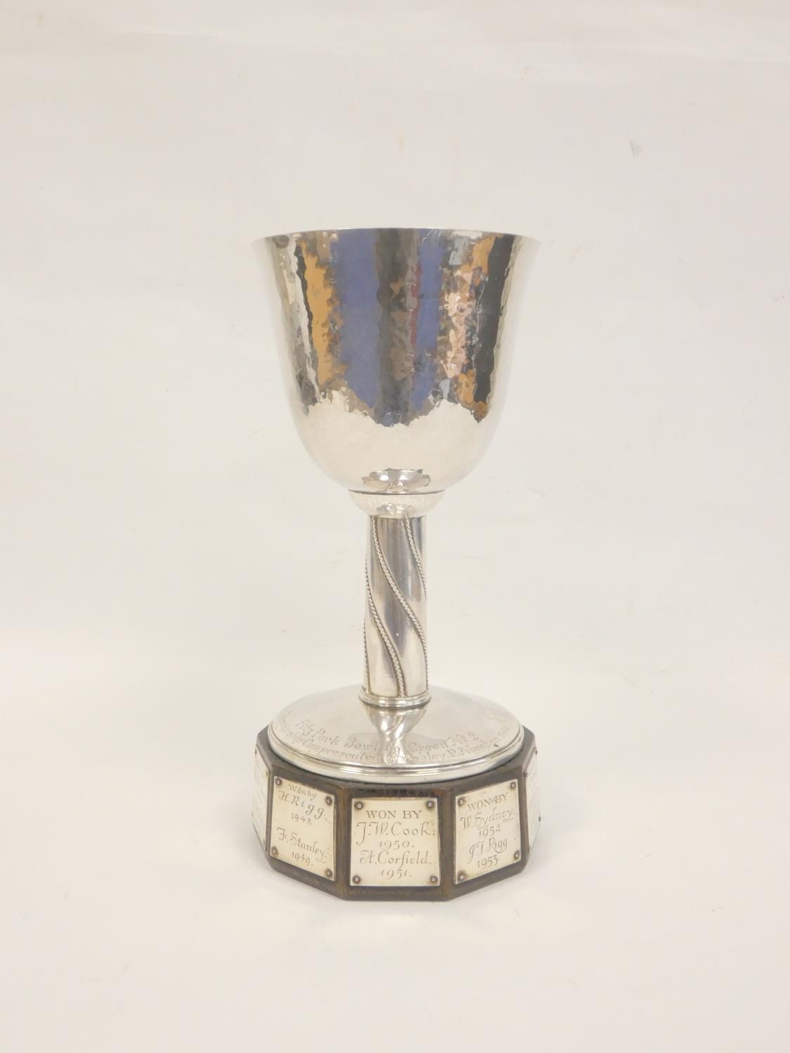 Keswick School of Industrial Arts (KSIA) silver goblet of bell form having slightly tapering stem with applied ropework wire decoration, on spreading foot inscribed ''Fitz Park Bowling Green no. 2, presented by Ashley Graham 1944'' on inscribed plinth. Hallmarked Keswick, Chester 1943. 20.6cm 467g.