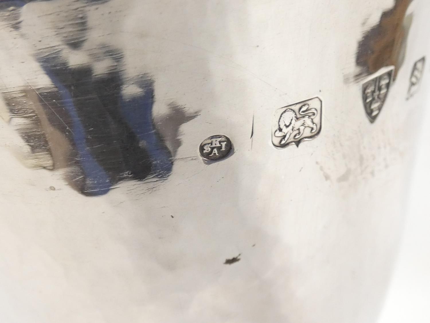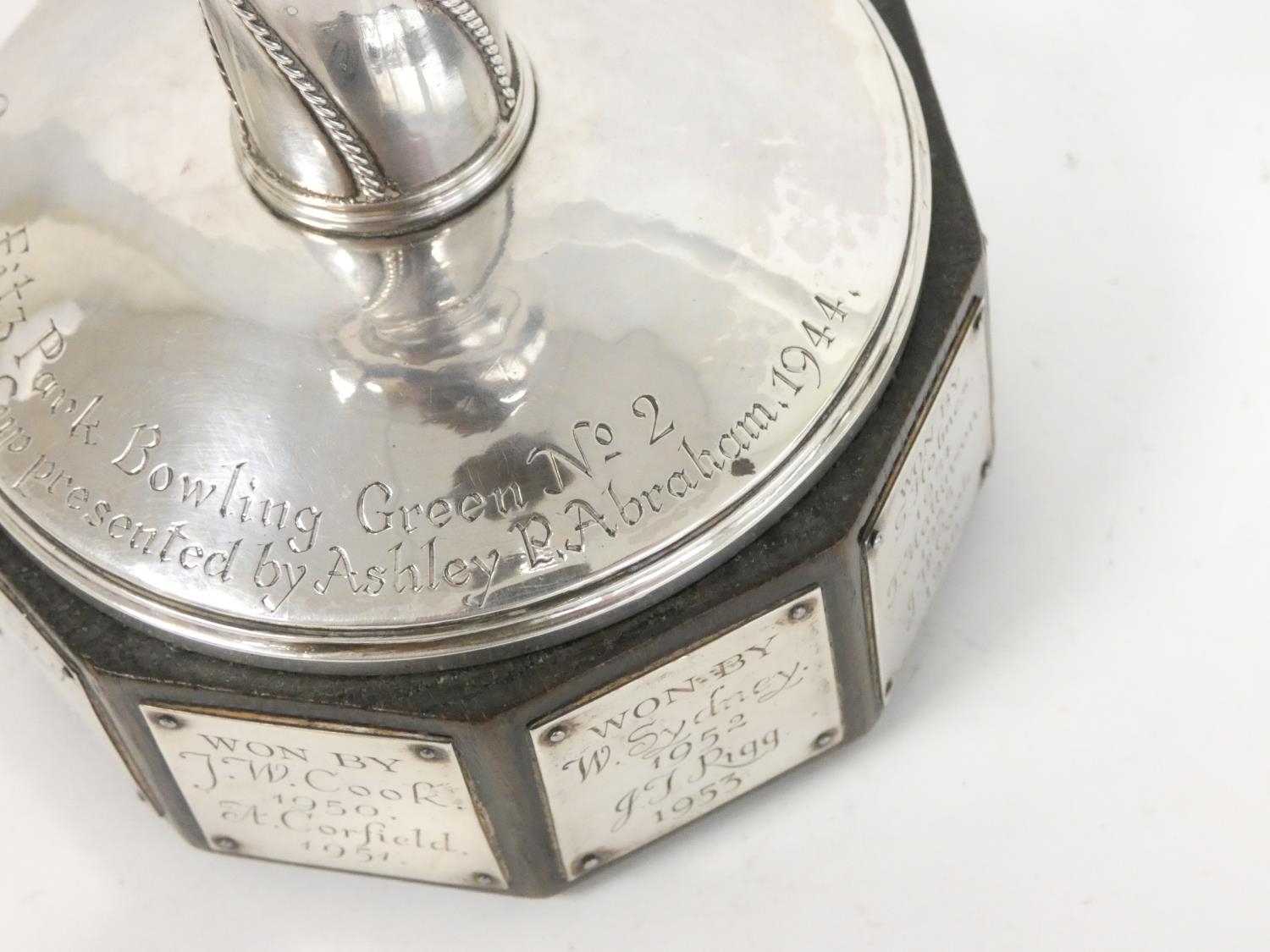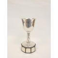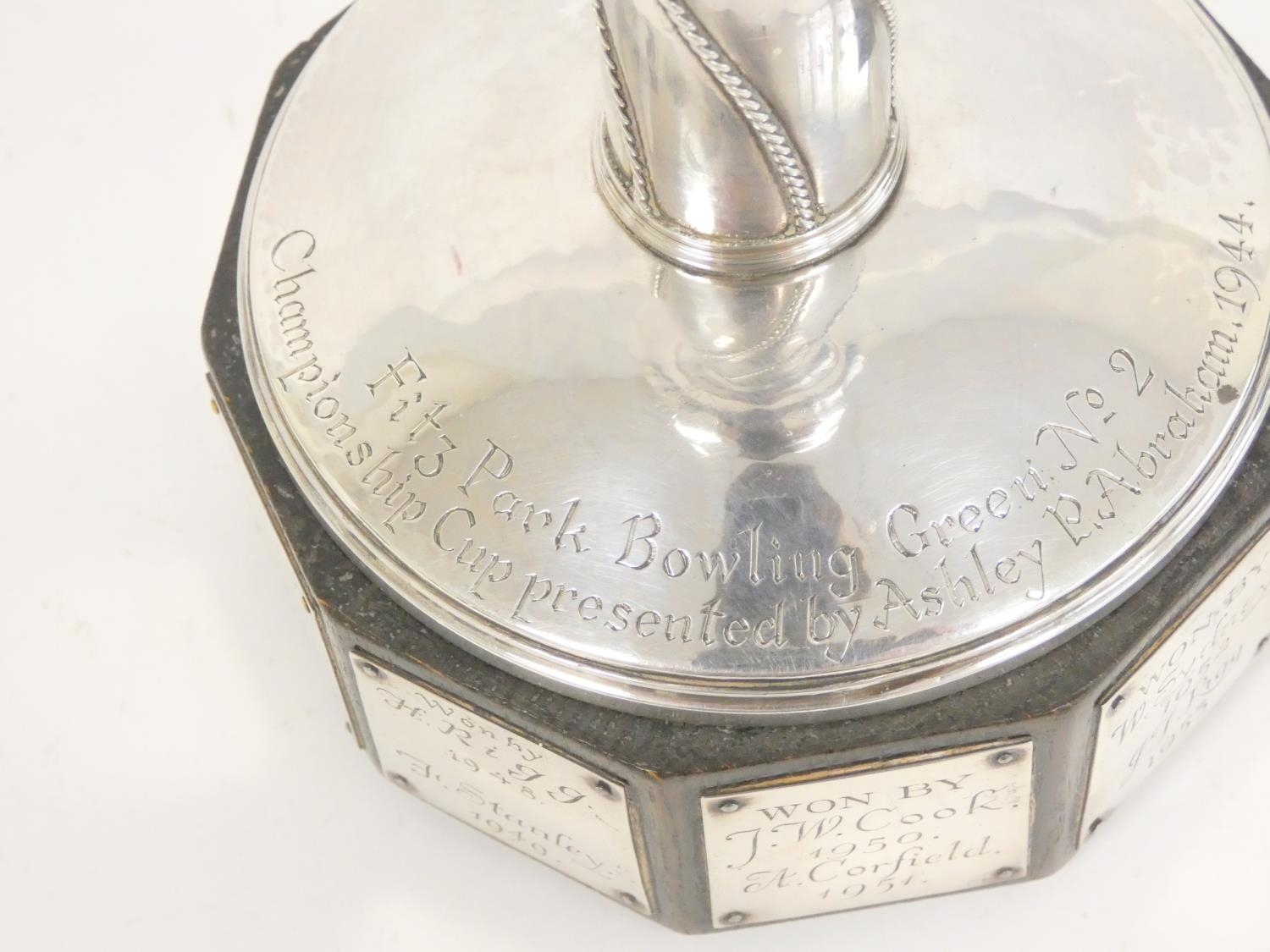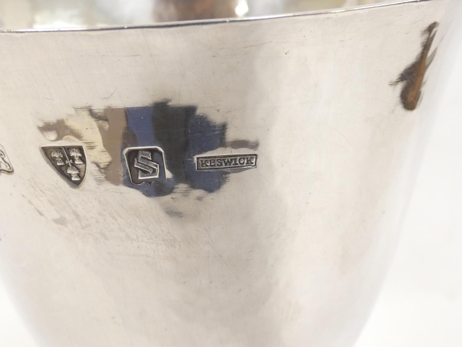 Keswick School of Industrial Arts (KSIA) silver goblet of bell form having slightly tapering stem with applied ropework wire decoration, on spreading foot inscribed ''Fitz Park Bowling Green no. 2, presented by Ashley Graham 1944'' on inscribed plinth. Hallmarked Keswick, Chester 1943. 20.6cm 467g.