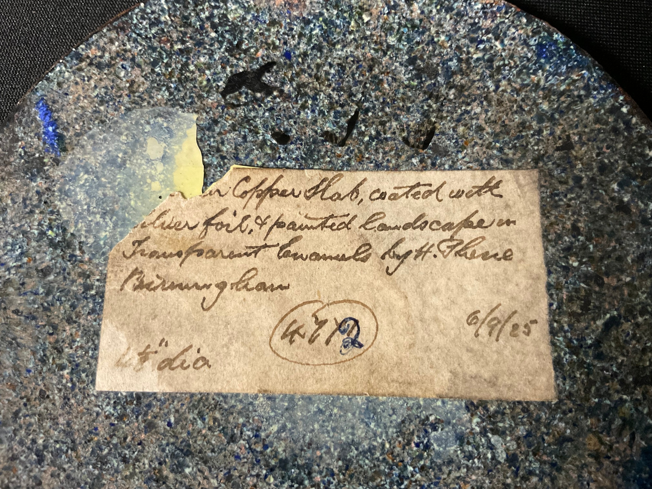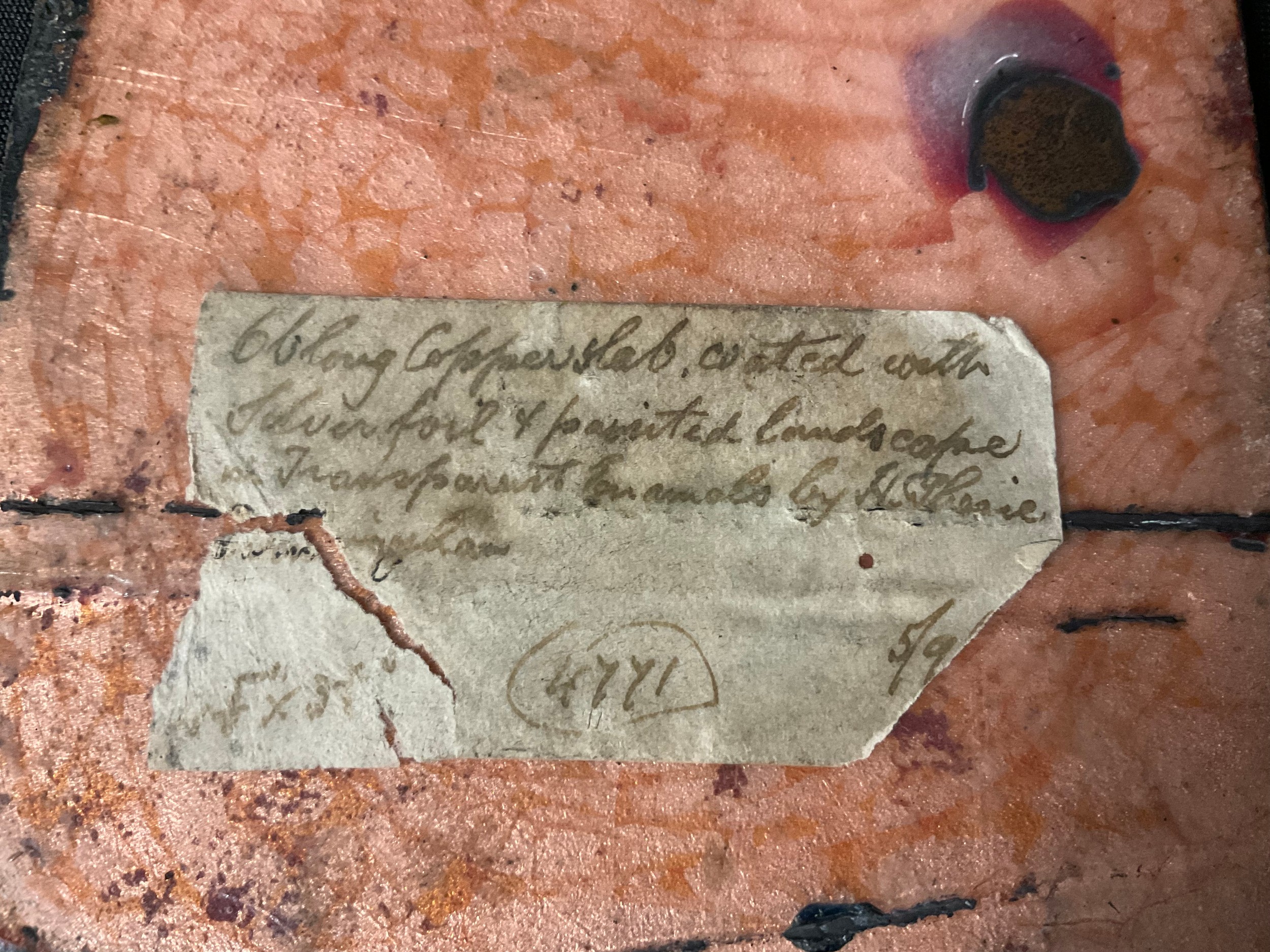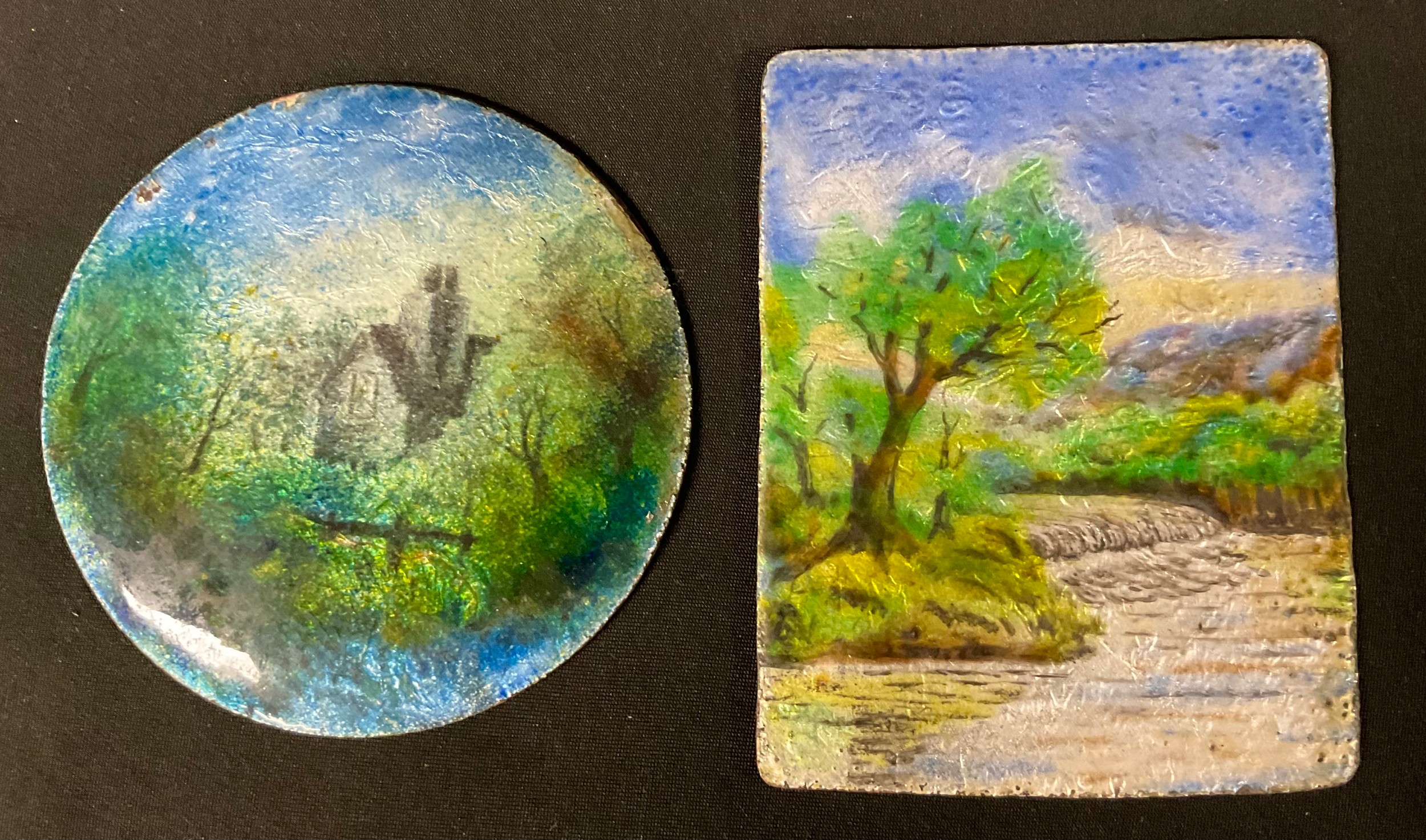 A pair of Arts and Crafts copper and enamel plaques, decorated with painted landscapes, by H. Claire, labels to the reverse (2)