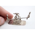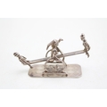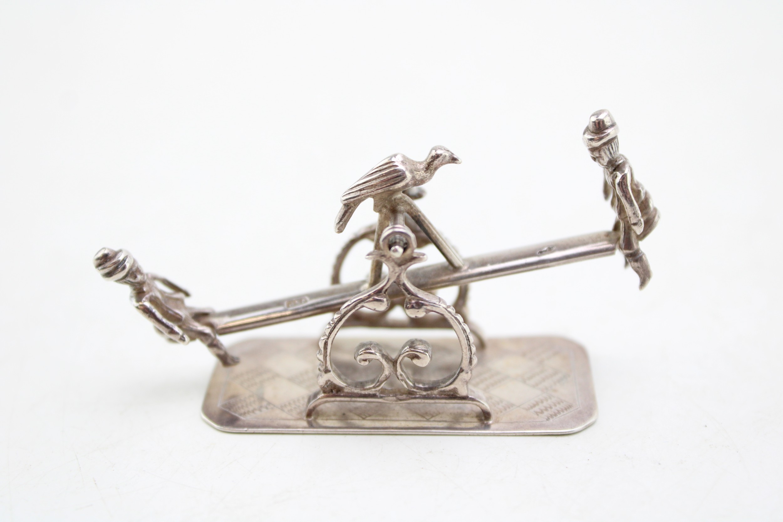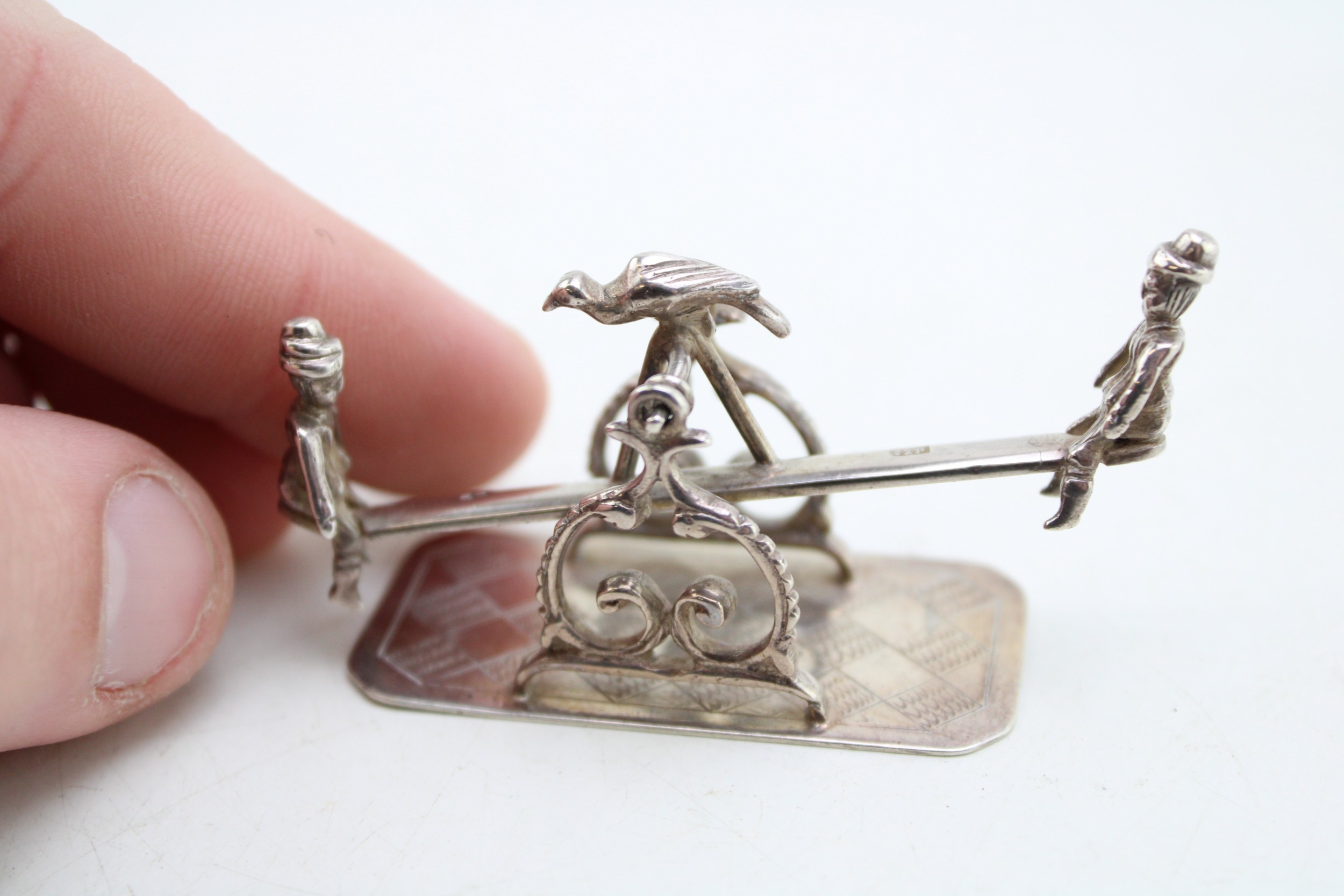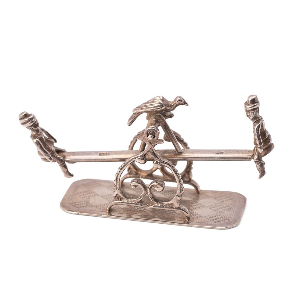 A turn of the 20th century Dutch silver model of a see-saw, fully balanced and movable with a child at either end, with a bird perched on the centre, on engraved rectangular base, Dutch sword hallmark to both stand and beam, 65.4mm long, 0.65toz, 20.6g.