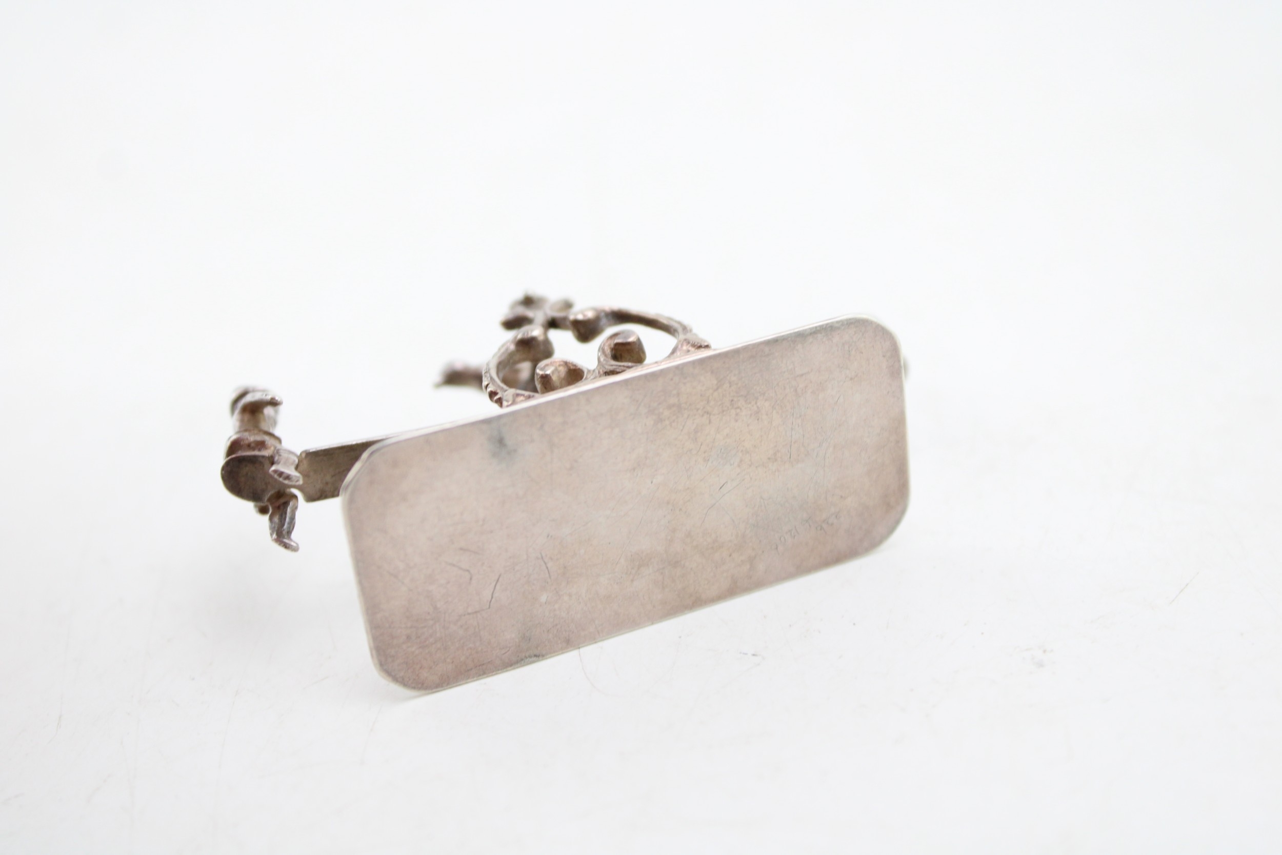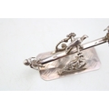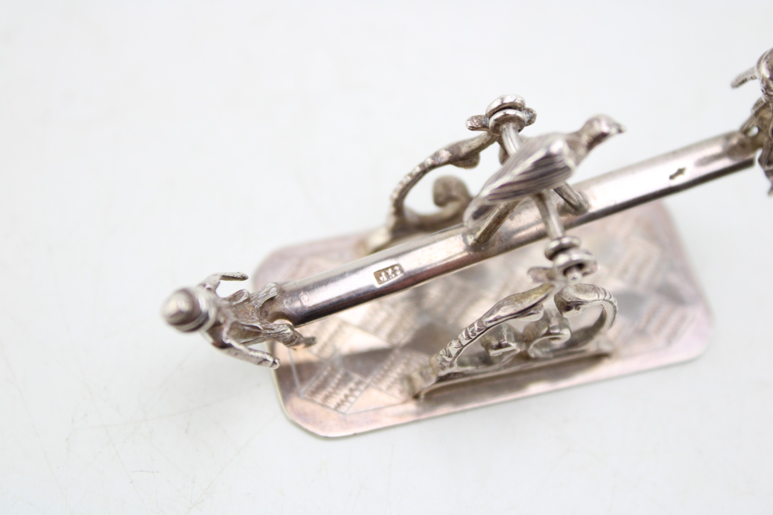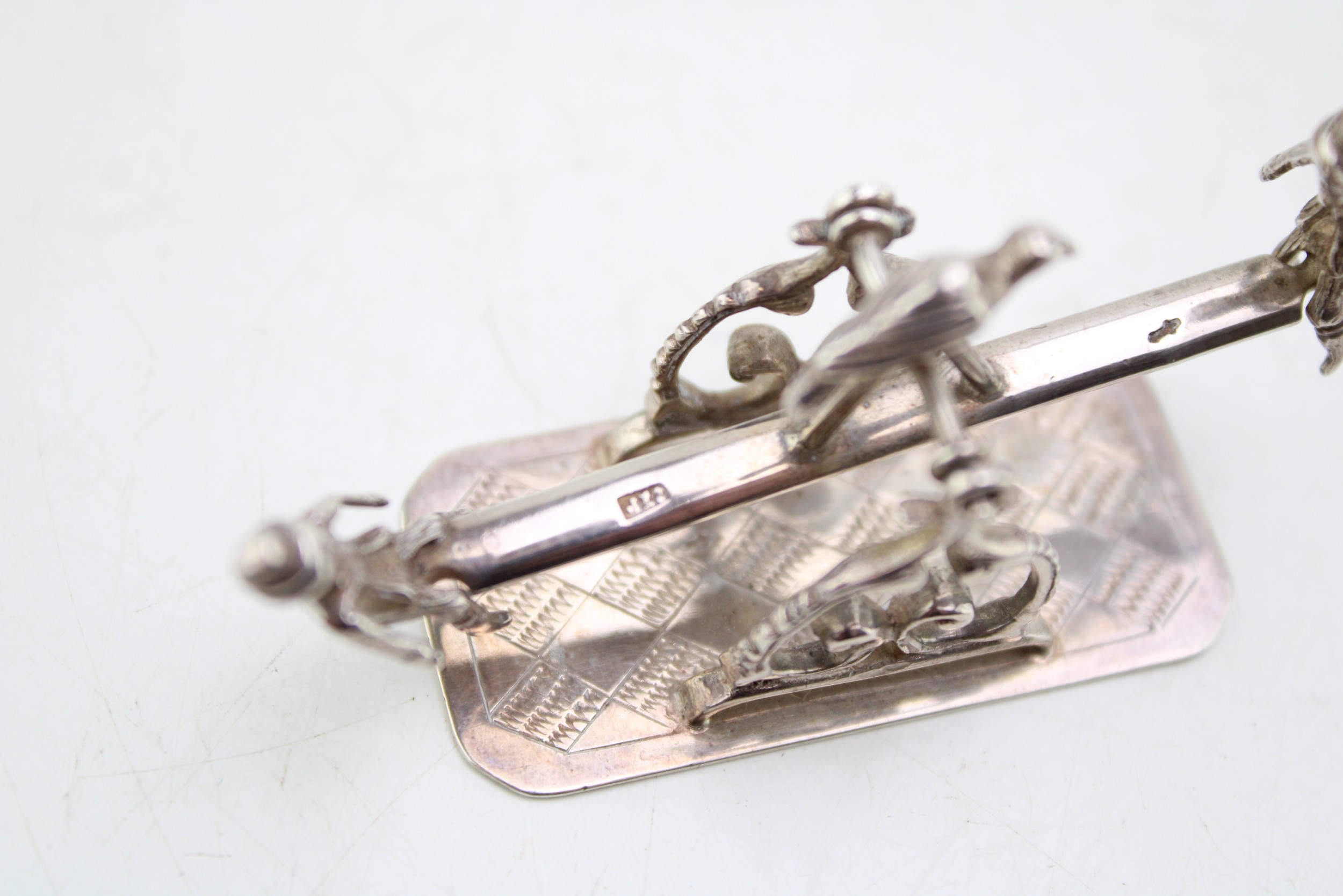 A turn of the 20th century Dutch silver model of a see-saw, fully balanced and movable with a child at either end, with a bird perched on the centre, on engraved rectangular base, Dutch sword hallmark to both stand and beam, 65.4mm long, 0.65toz, 20.6g.