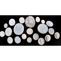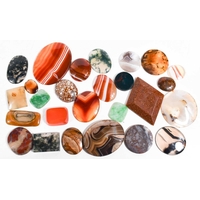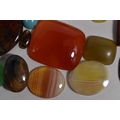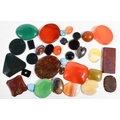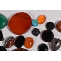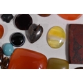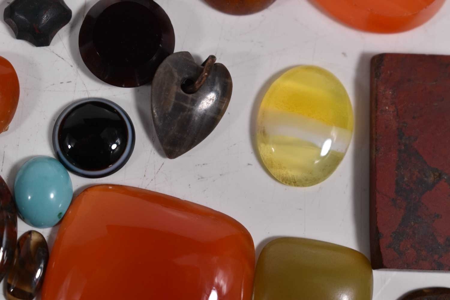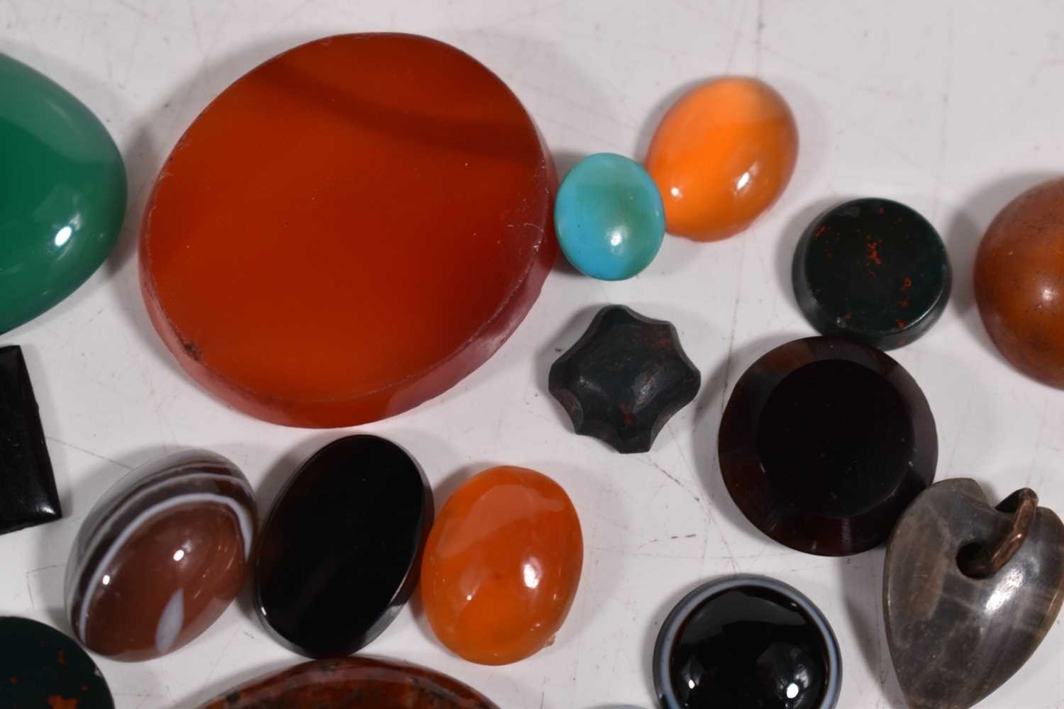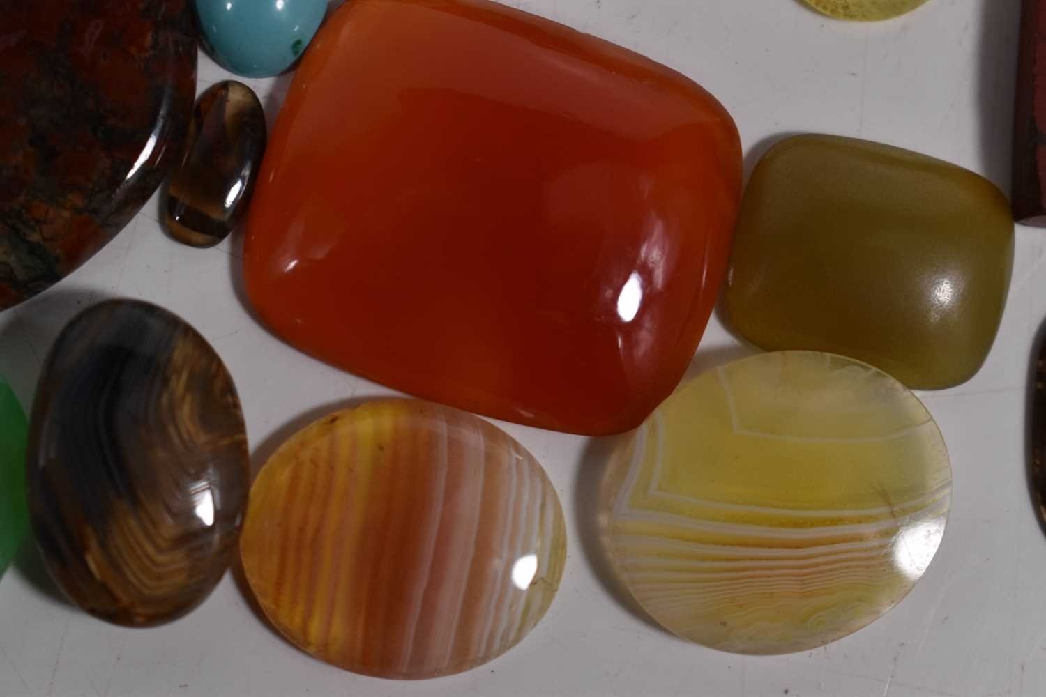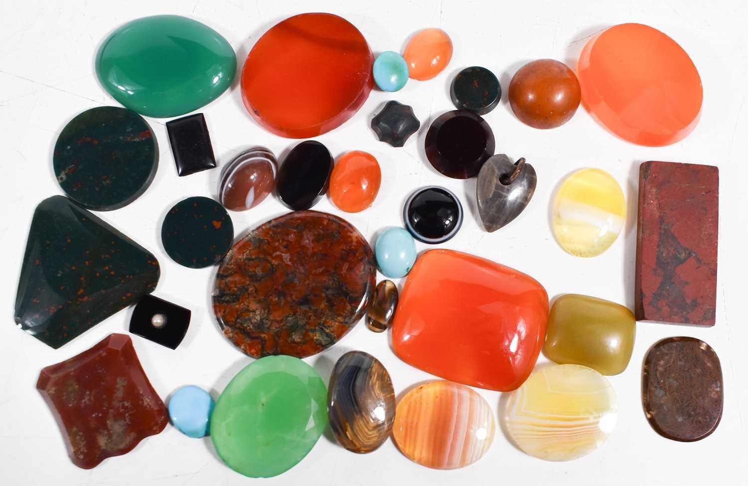 A selection of 19th century and earlier specimen agate plaques and cabochons, unmounted and unengraved, to include carnelian, jade, bulls eye agate, turquoise, red jasper and other examples.