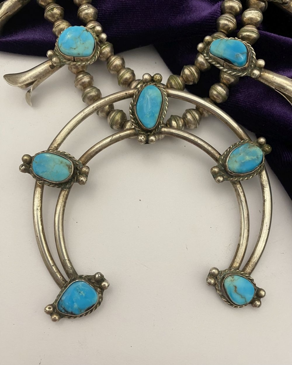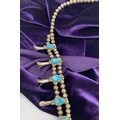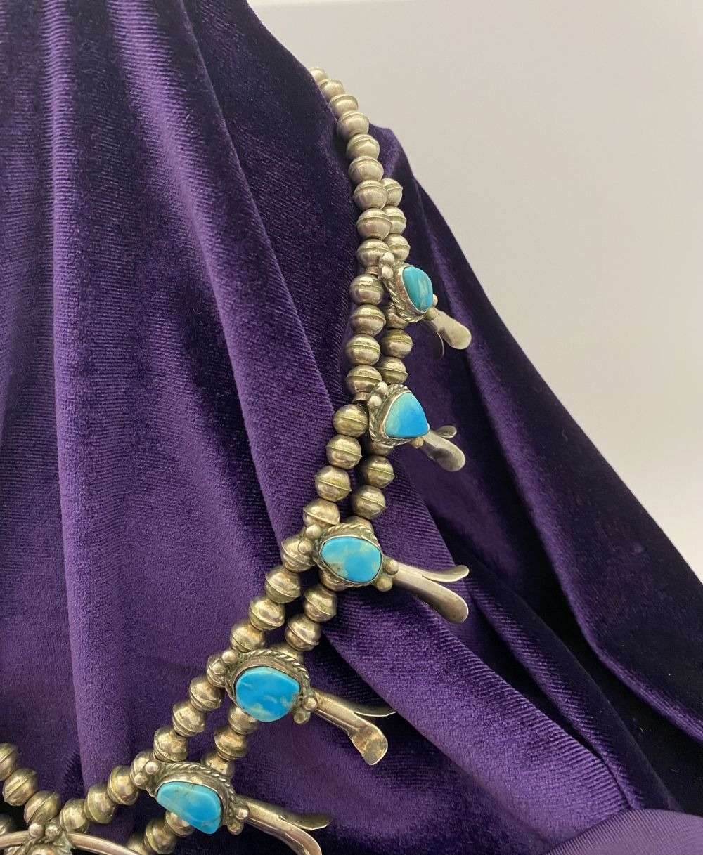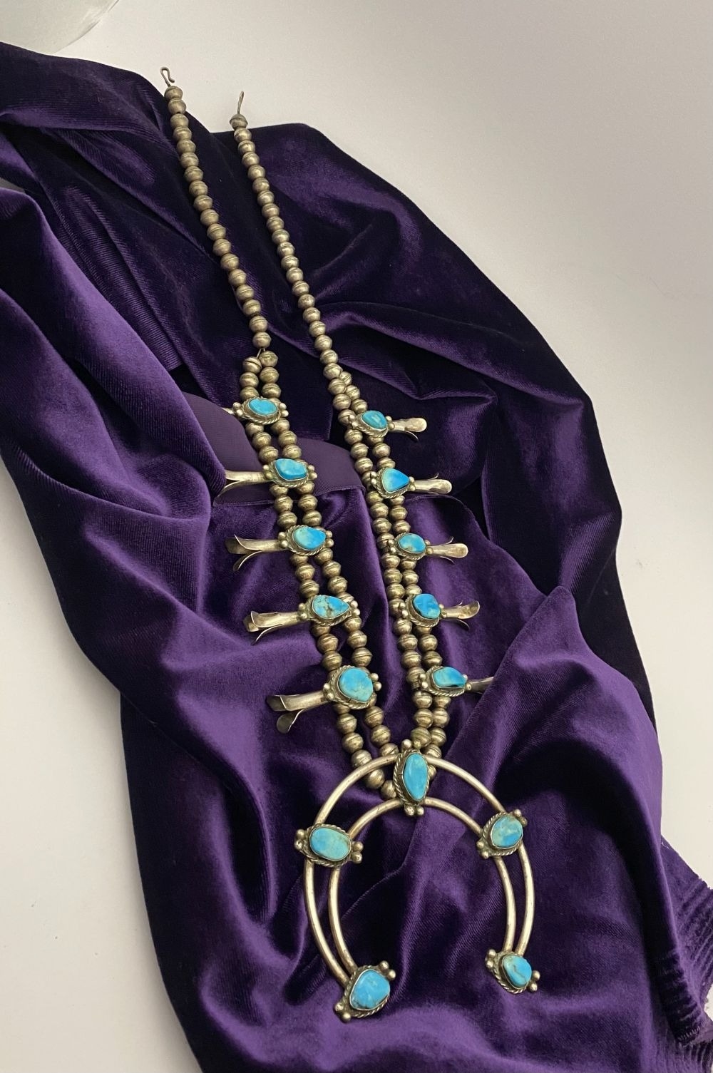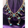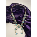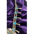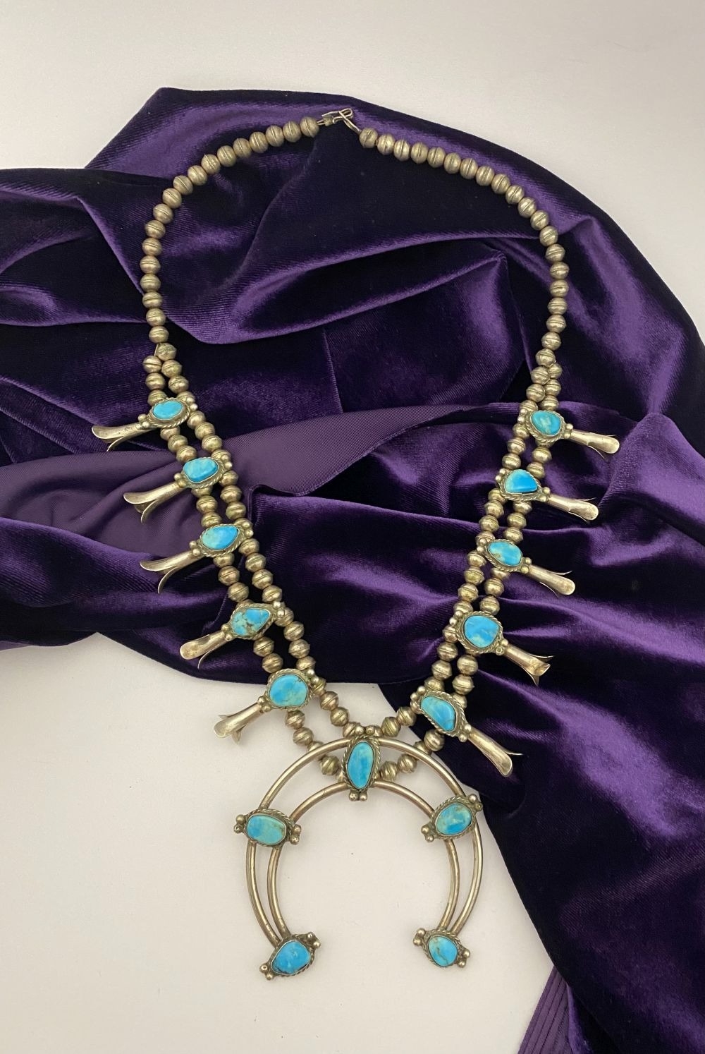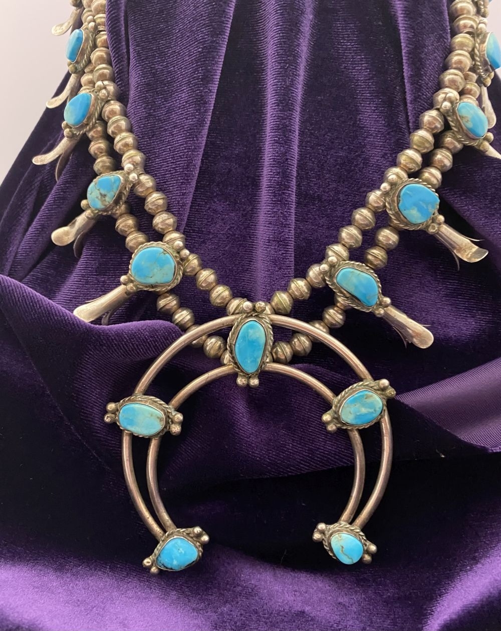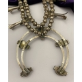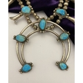 A VINTAGE NAVAJO STERLING SILVER TURQUOISE SQUASH BLOSSOM NECKLACE, with two rows of beads to necklace and double horseshoe pendant, both set with fifteen turquoise cabochons in bezel setting, surrounded by rope border with pair of beads to either end. Dimensions: 37cm long from clasp to end of pendant when closed approx. No visible silver marks, common with Navajo pieces.