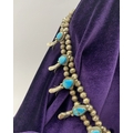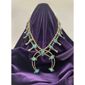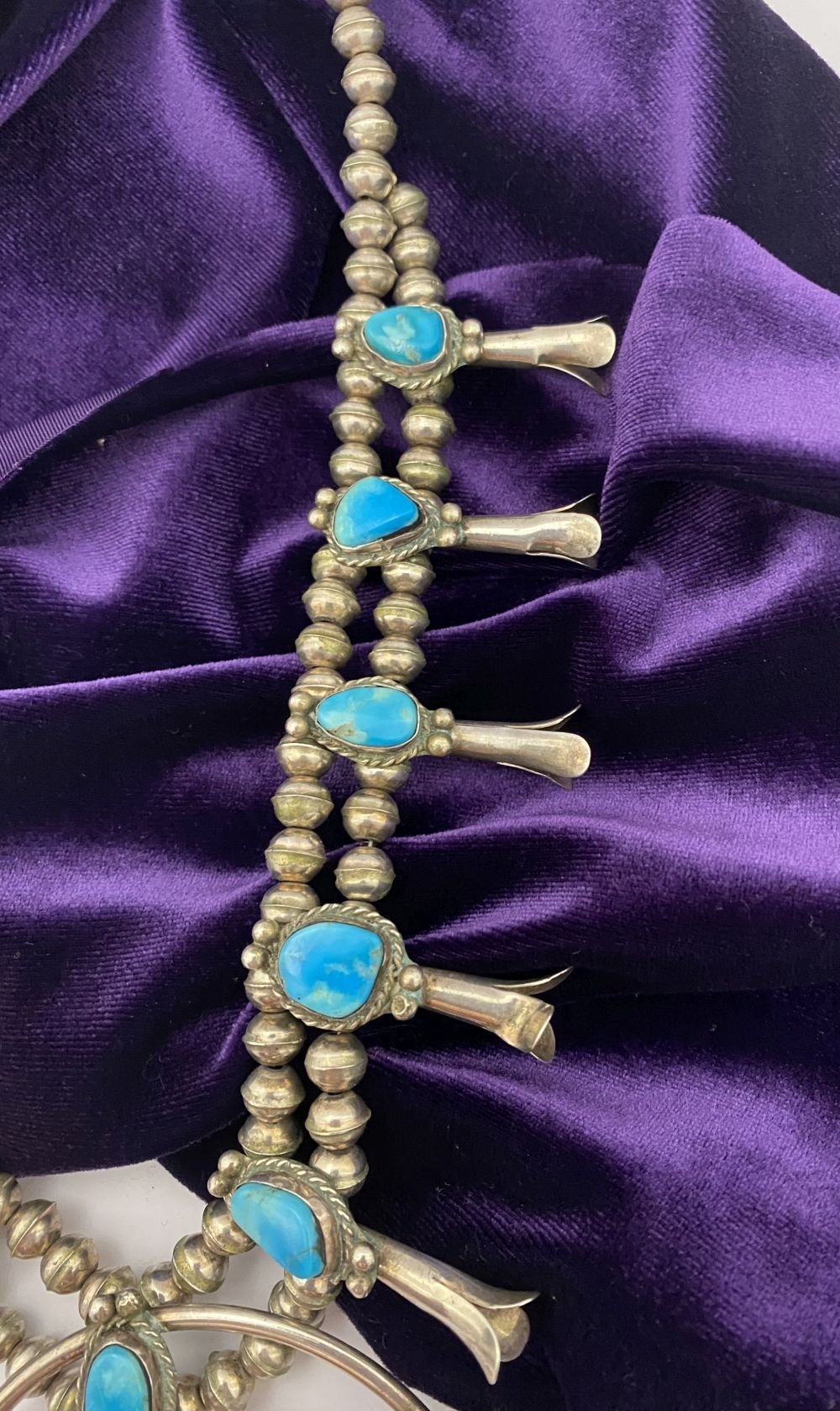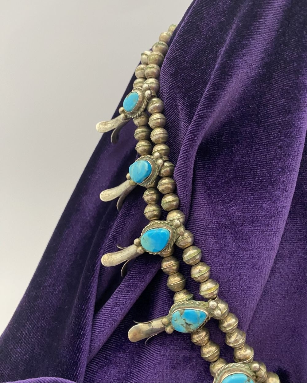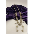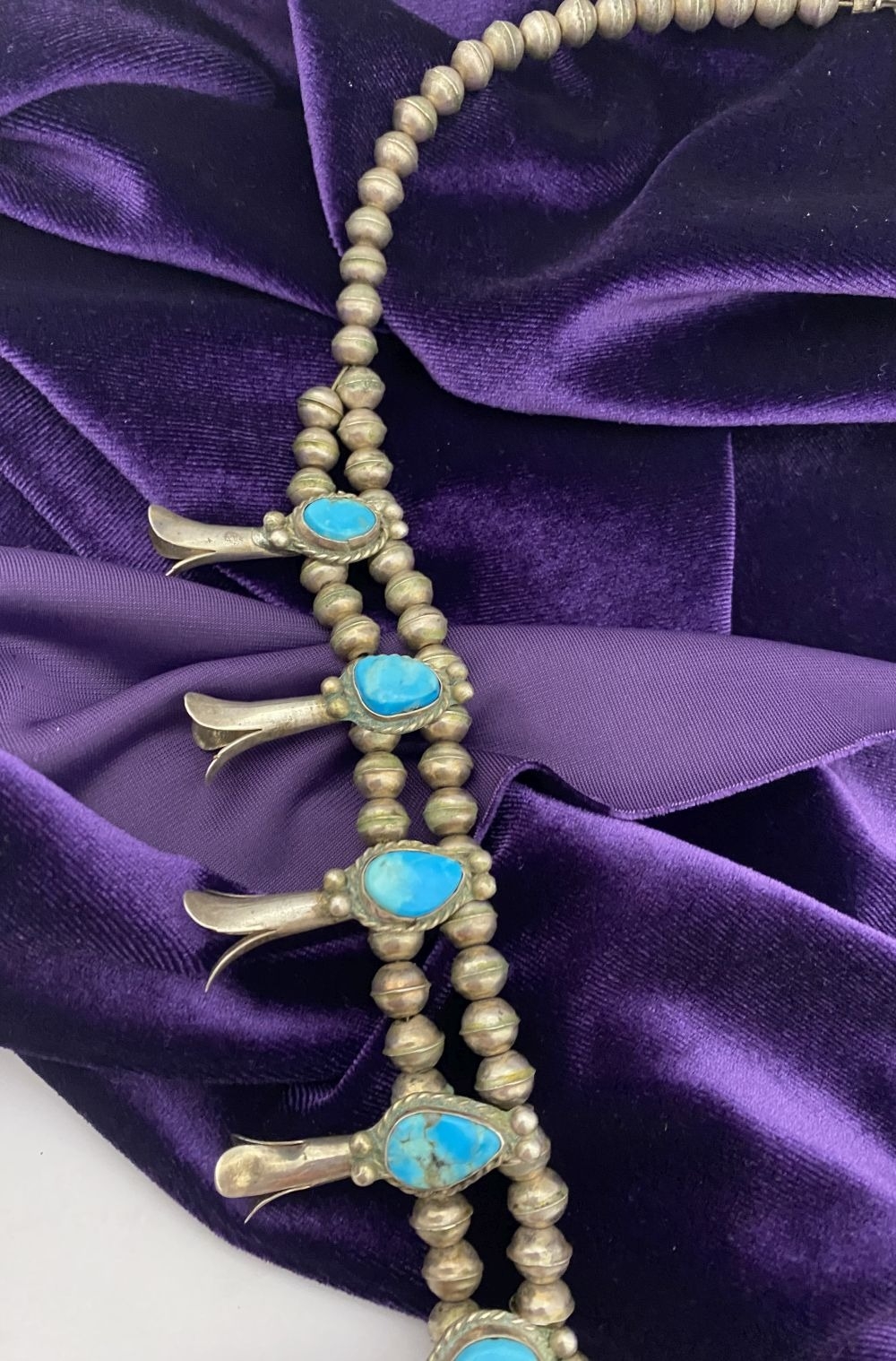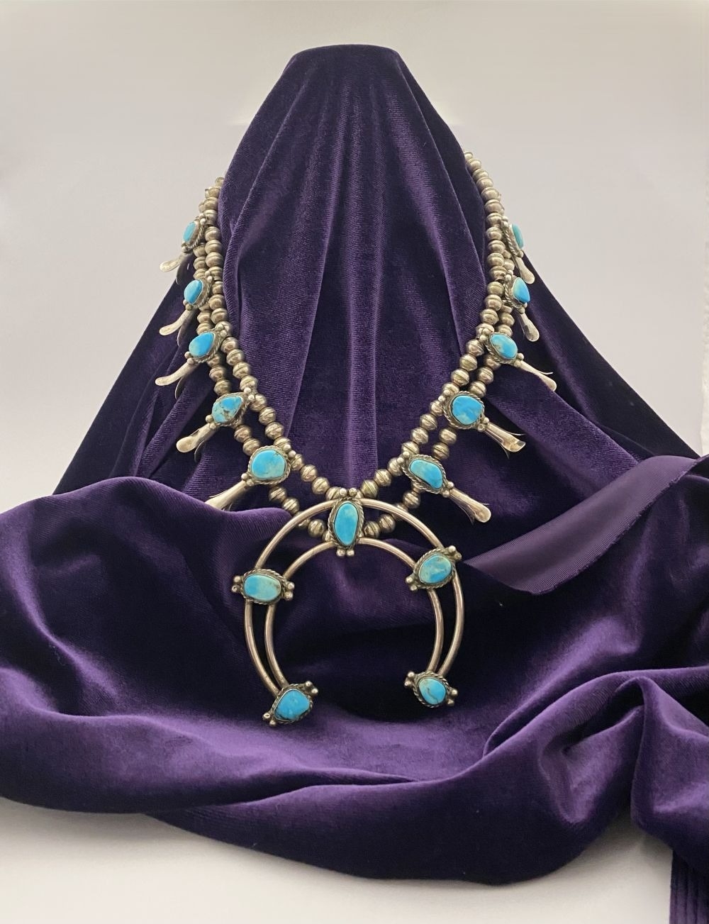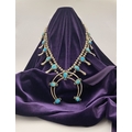 A VINTAGE NAVAJO STERLING SILVER TURQUOISE SQUASH BLOSSOM NECKLACE, with two rows of beads to necklace and double horseshoe pendant, both set with fifteen turquoise cabochons in bezel setting, surrounded by rope border with pair of beads to either end. Dimensions: 37cm long from clasp to end of pendant when closed approx. No visible silver marks, common with Navajo pieces.