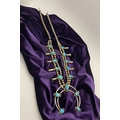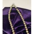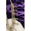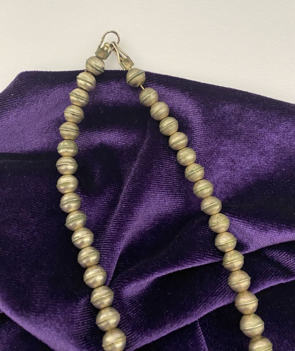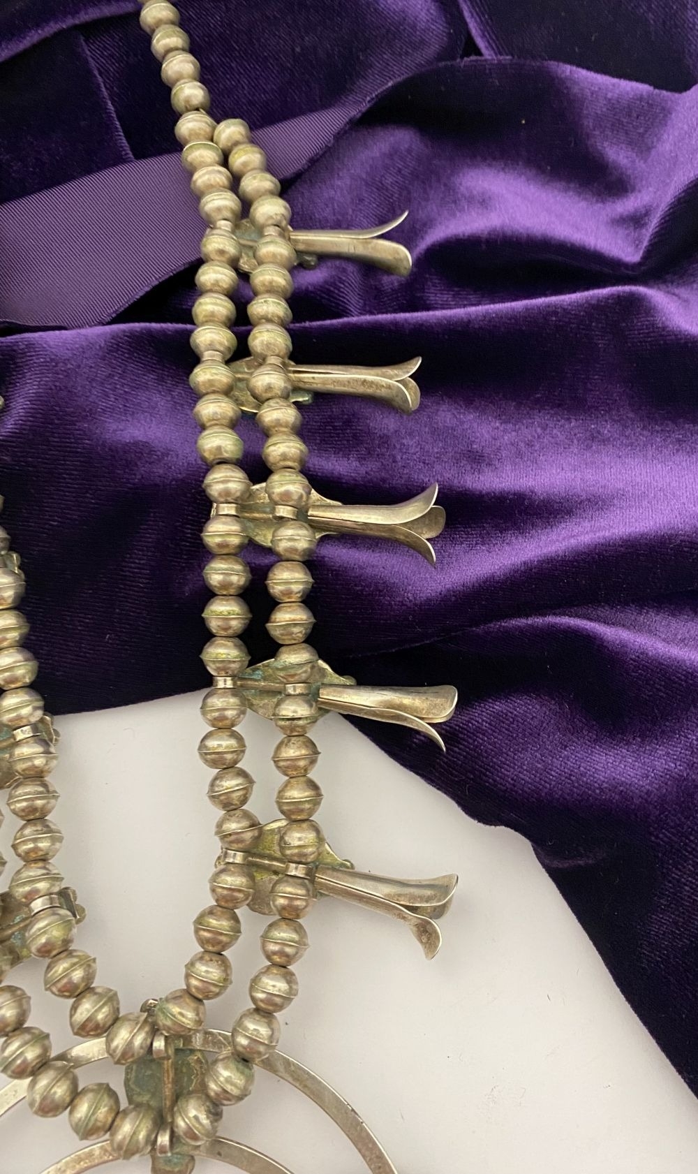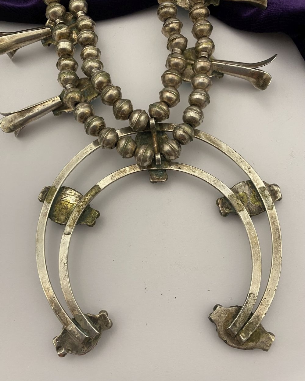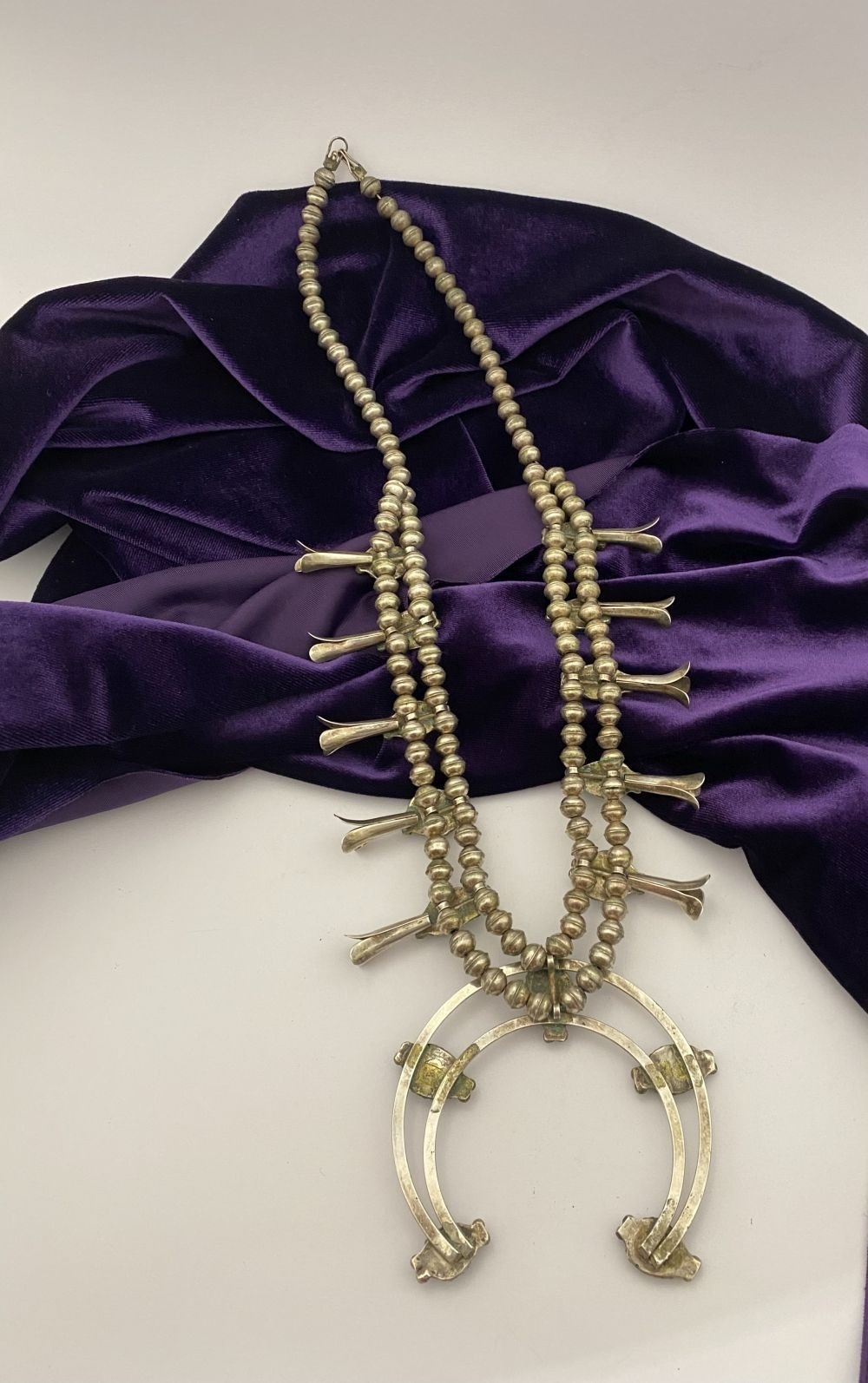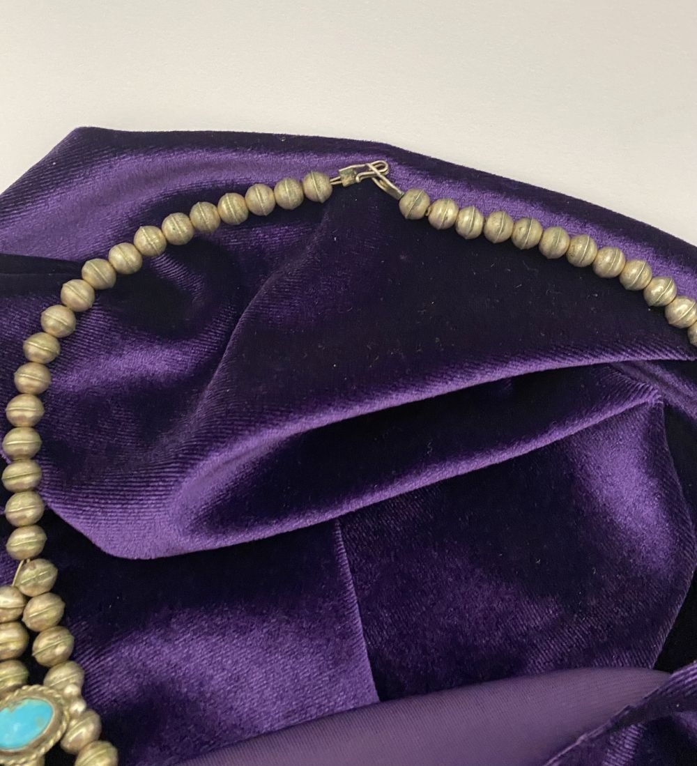 A VINTAGE NAVAJO STERLING SILVER TURQUOISE SQUASH BLOSSOM NECKLACE, with two rows of beads to necklace and double horseshoe pendant, both set with fifteen turquoise cabochons in bezel setting, surrounded by rope border with pair of beads to either end. Dimensions: 37cm long from clasp to end of pendant when closed approx. No visible silver marks, common with Navajo pieces.