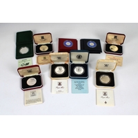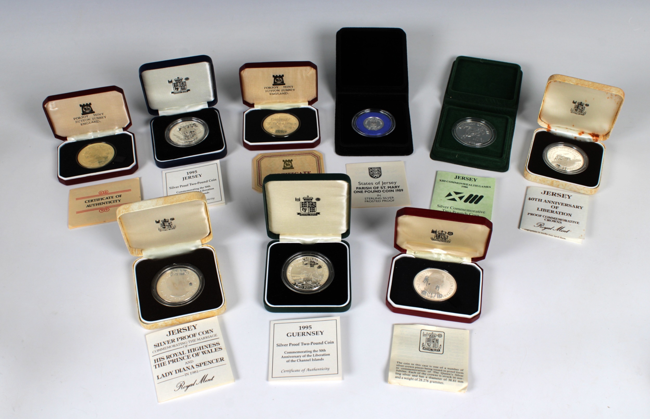 A collection of various boxed commemorative silver coins to include 1995 Guernsey silver proof Two-Pound coin, commemorating the 50th Anniversary of the Liberation; two 1976 Washington Crowns, H.M. Queen Elizabeth II visit to the United States; Jersey 1981 Royal marriage, His Royal Highness and Lady Diana Spencer; Jersey 40th Anniversary of Liberation; Queen's silver Jubilee Jersey Crown; Jersey 1986 Commonwealth Game Two Pound; 1995 Jersey silver proof Two-Pound; Jersey Parish of St Mary One Pound. (9)