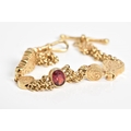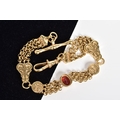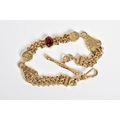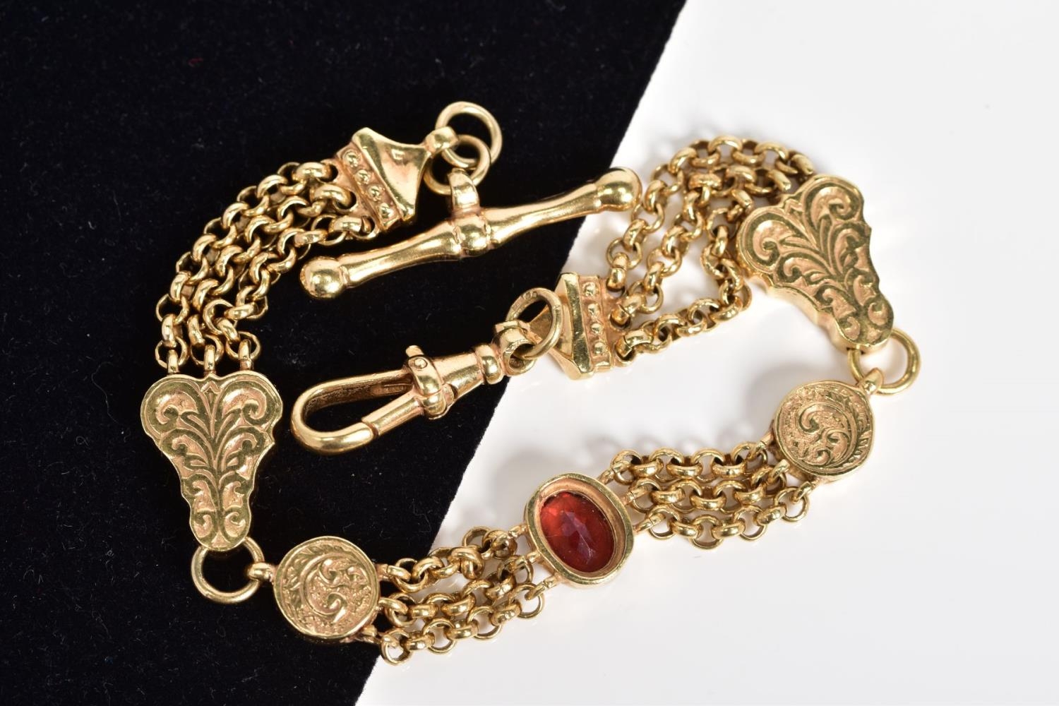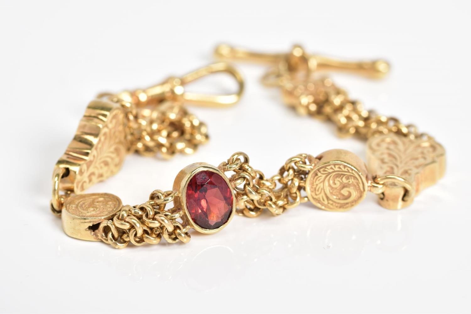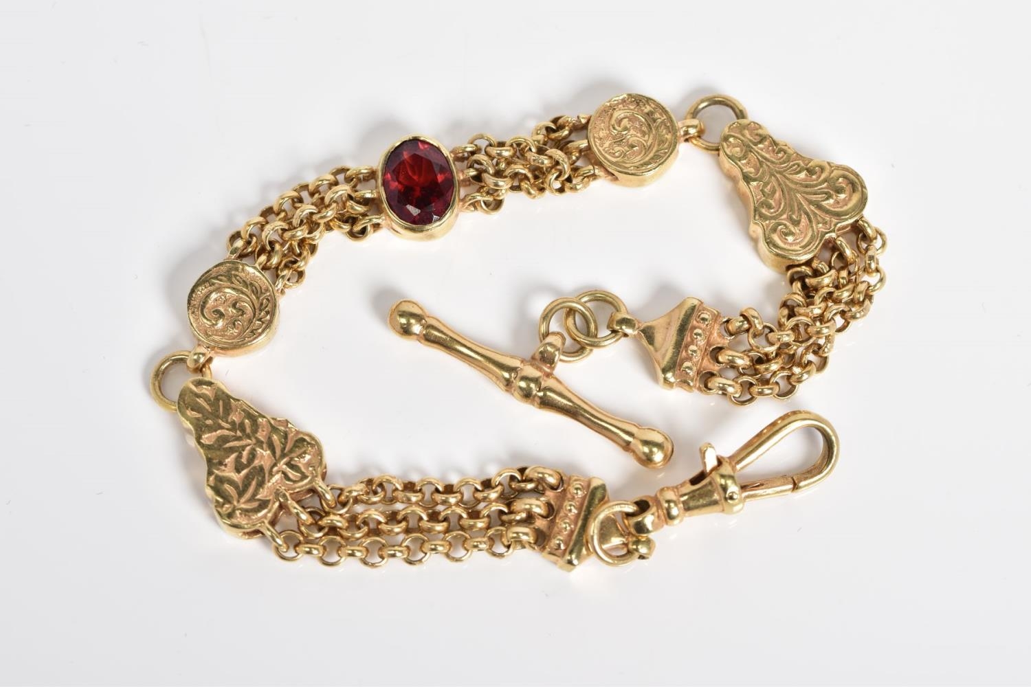 A 9CT GOLD ALBERTINA CHAIN, designed with a central oval cut garnet interspaced either side with multi strand belcher link chains to circular embossed links and foliage embossed panels interspaced with further multi-link chains, with a lobster clasp and T-bar, with a 9ct import mark for Sheffield, length 210mm, approximate weight 20.5 grams