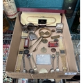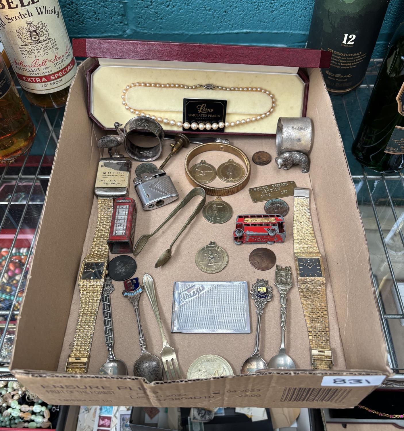Box containing curios including collector's spoons, coins and an emu napkin ring etc
