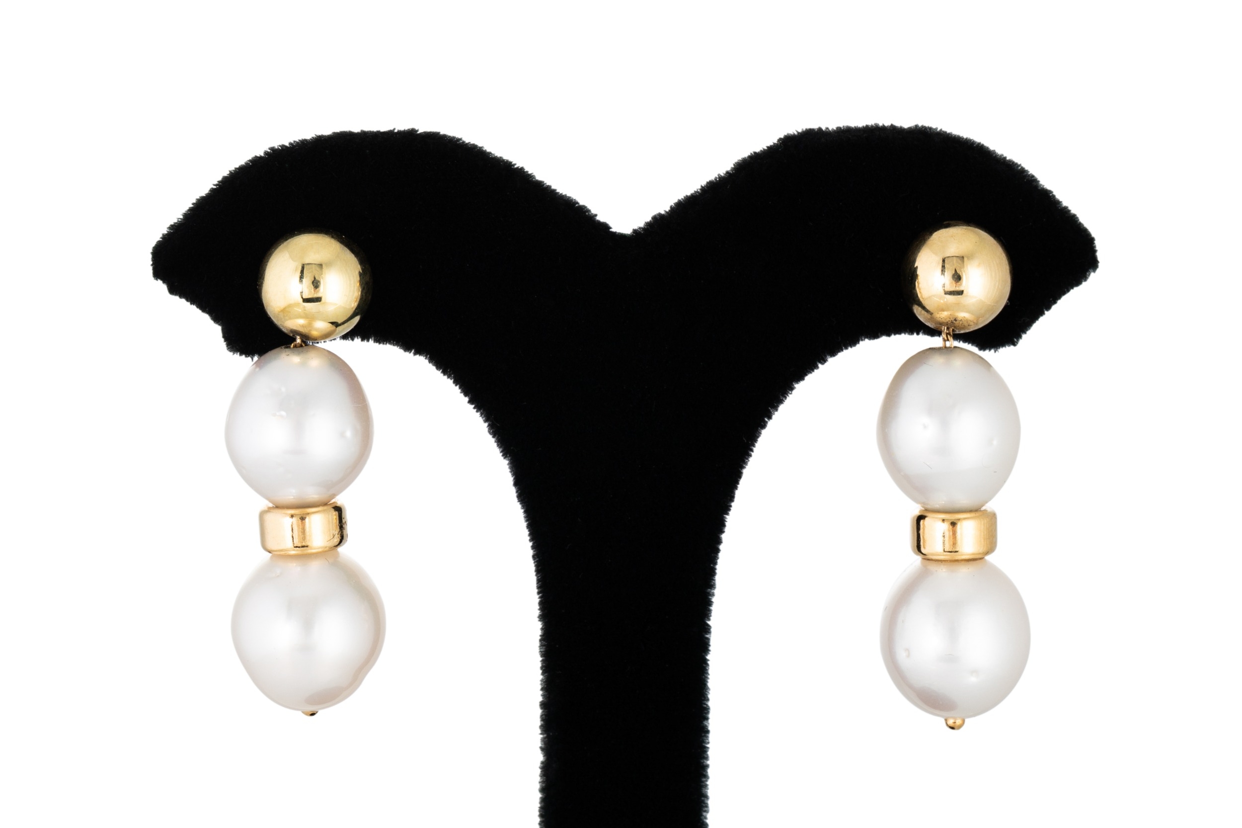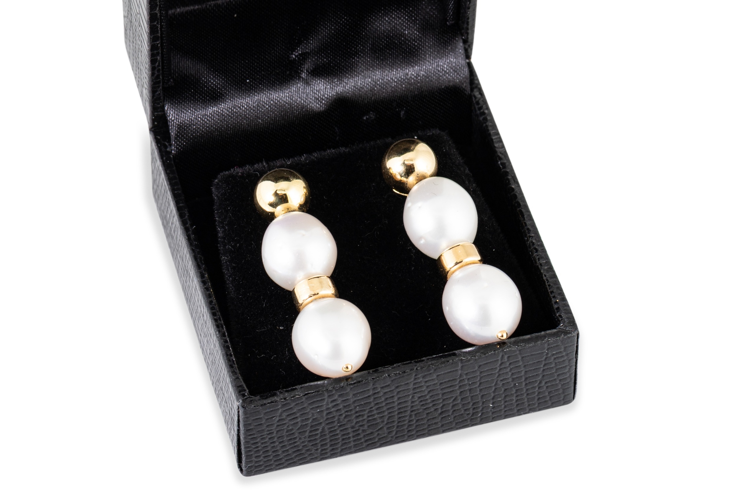 A PAIR OF CULTURED PEARL DROP EARRINGS, the cultured pearls to 18ct gold spacers and fittings