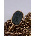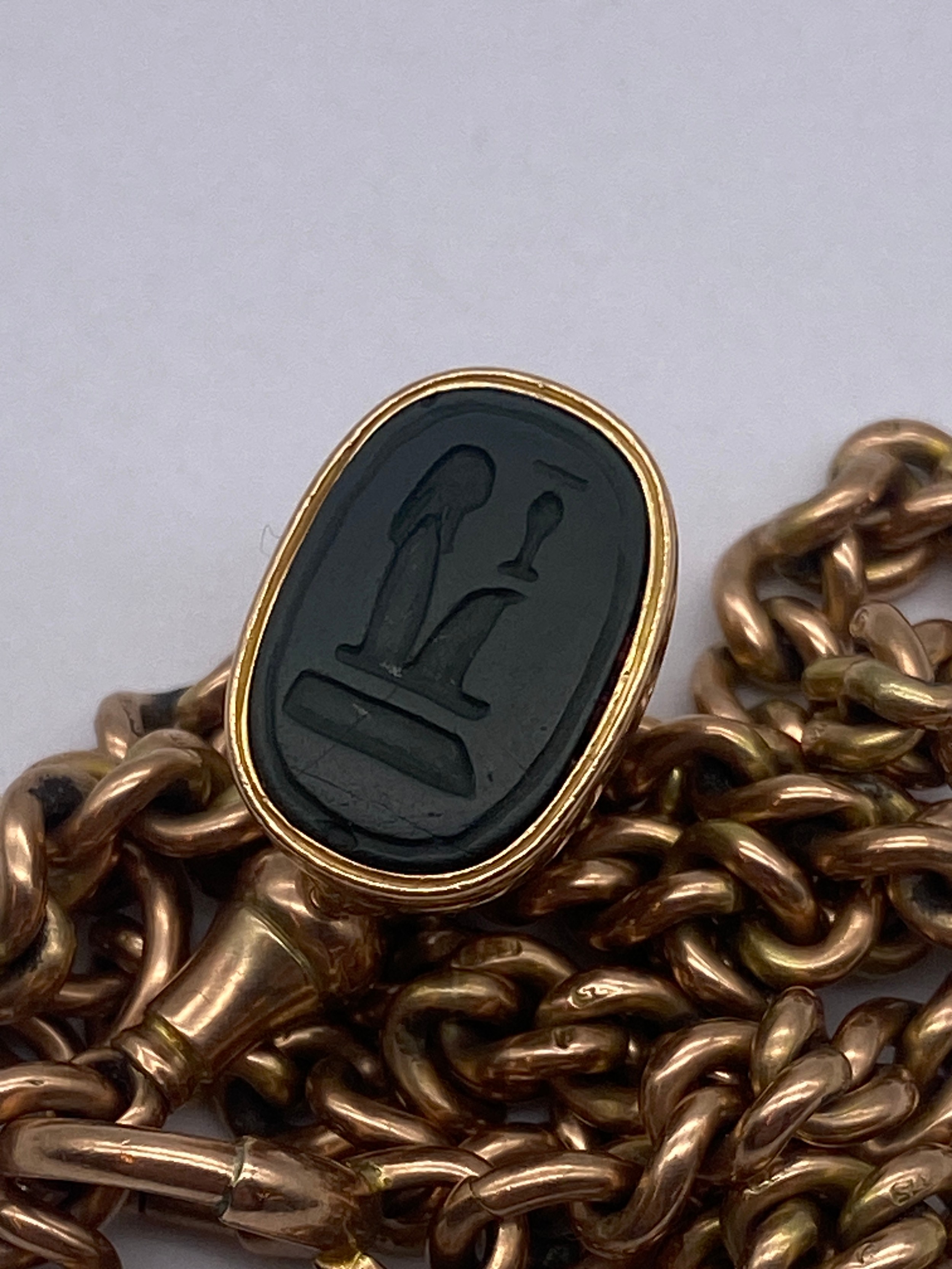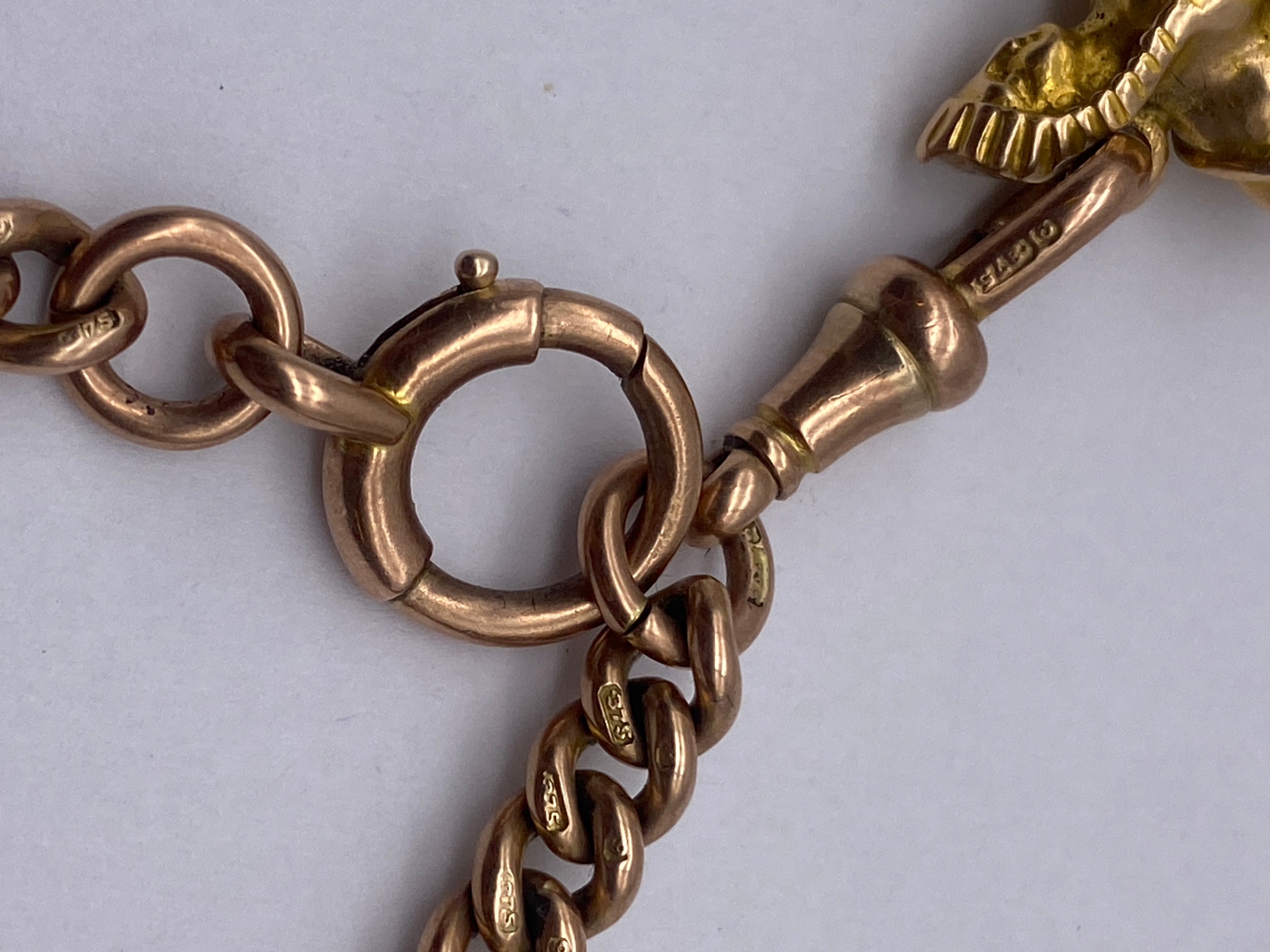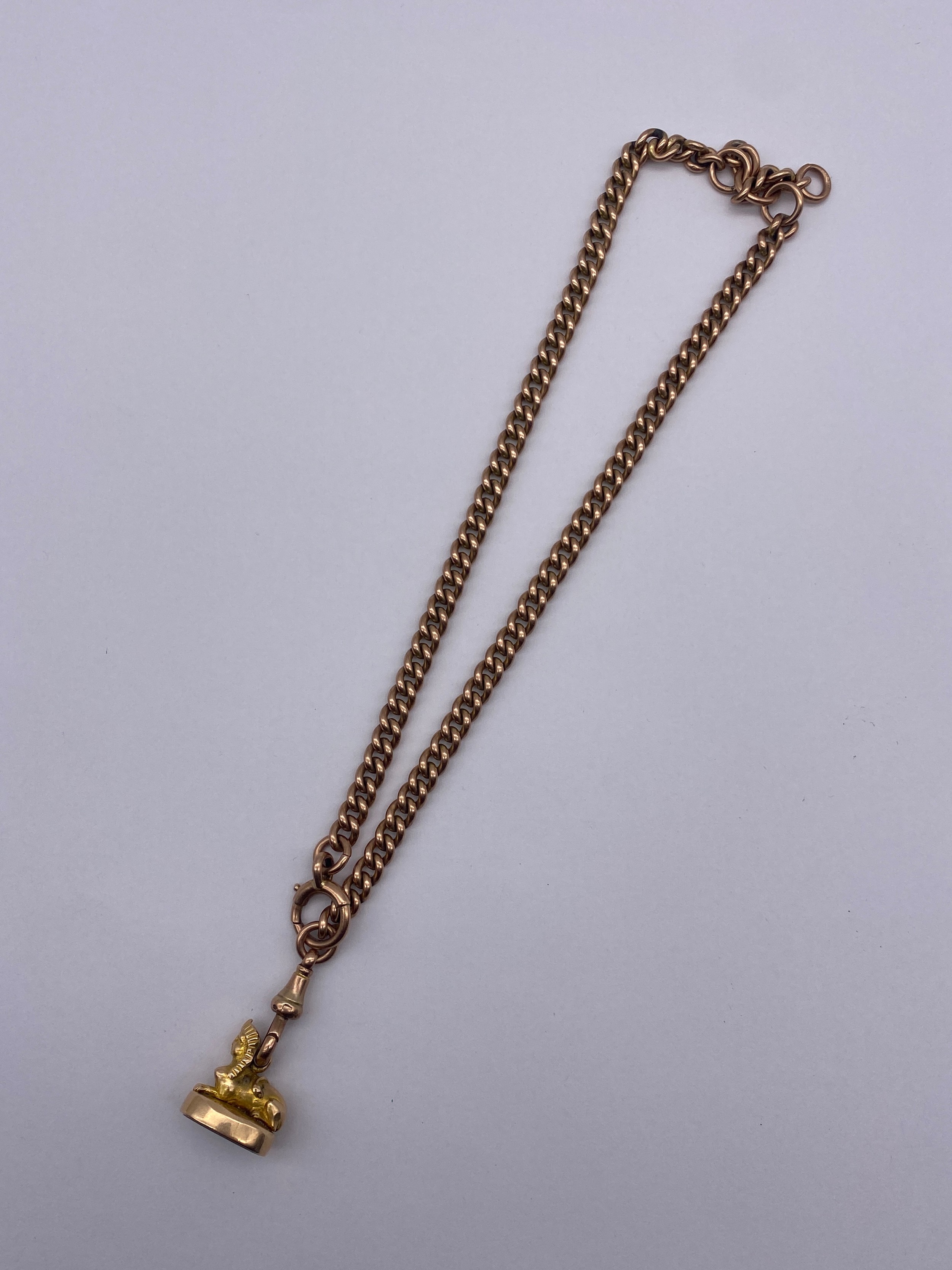 9CT ROSE GOLD ALBERT CHAIN WITH SNAP SWIVEL FASTENER AND UNMARKED YELLOW METAL SPHINX SEAL FOB 43G APPROX OVERALL