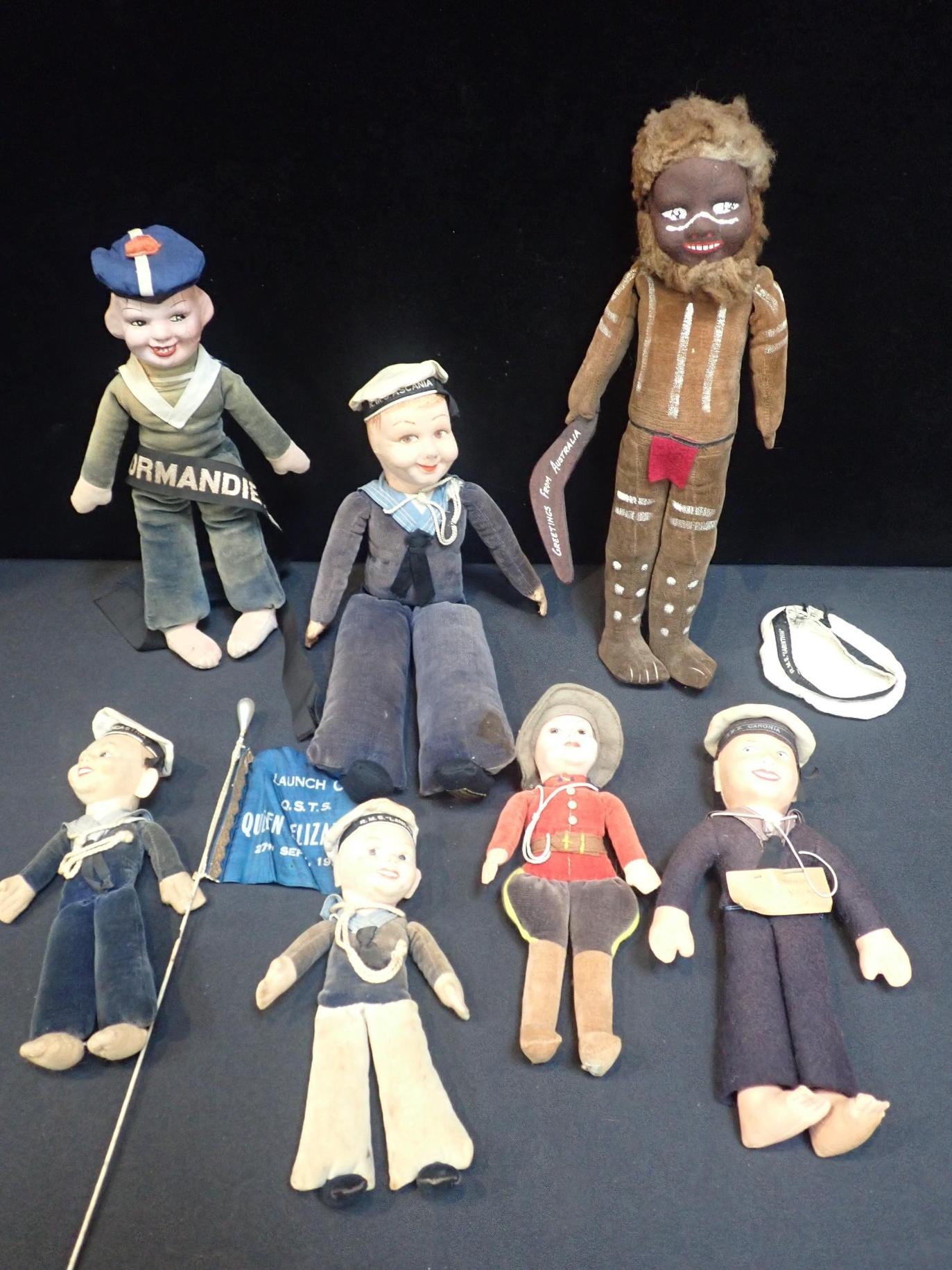 A NORAH WELLINGS CANADIAN 'MOUNTIE' MOUNTED POLICE DOLL23cm high, a sailor doll 35cm high, other similar sailor dolls, and a velvet Australian Aboriginal doll