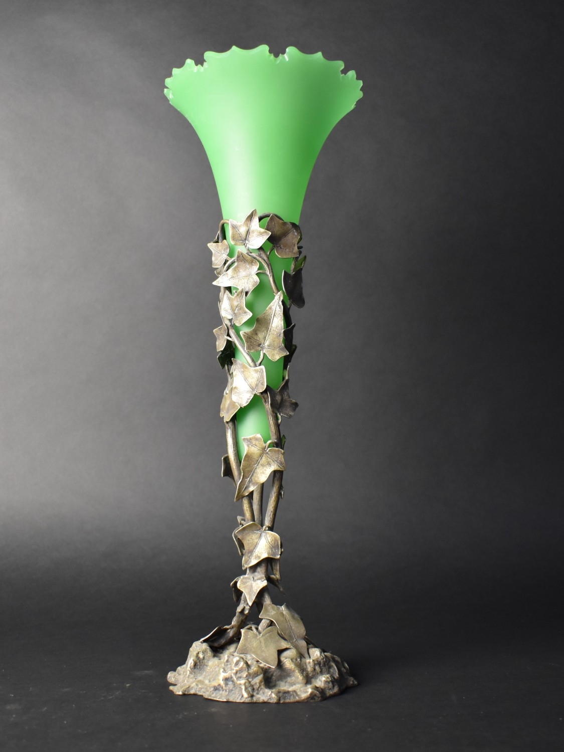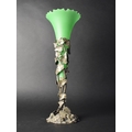 A Late Victorian/Edwardian Tall Silver Plated Single Trumpet Green Glass Epergne, The Support in the Form of a Vine, 41cms High