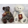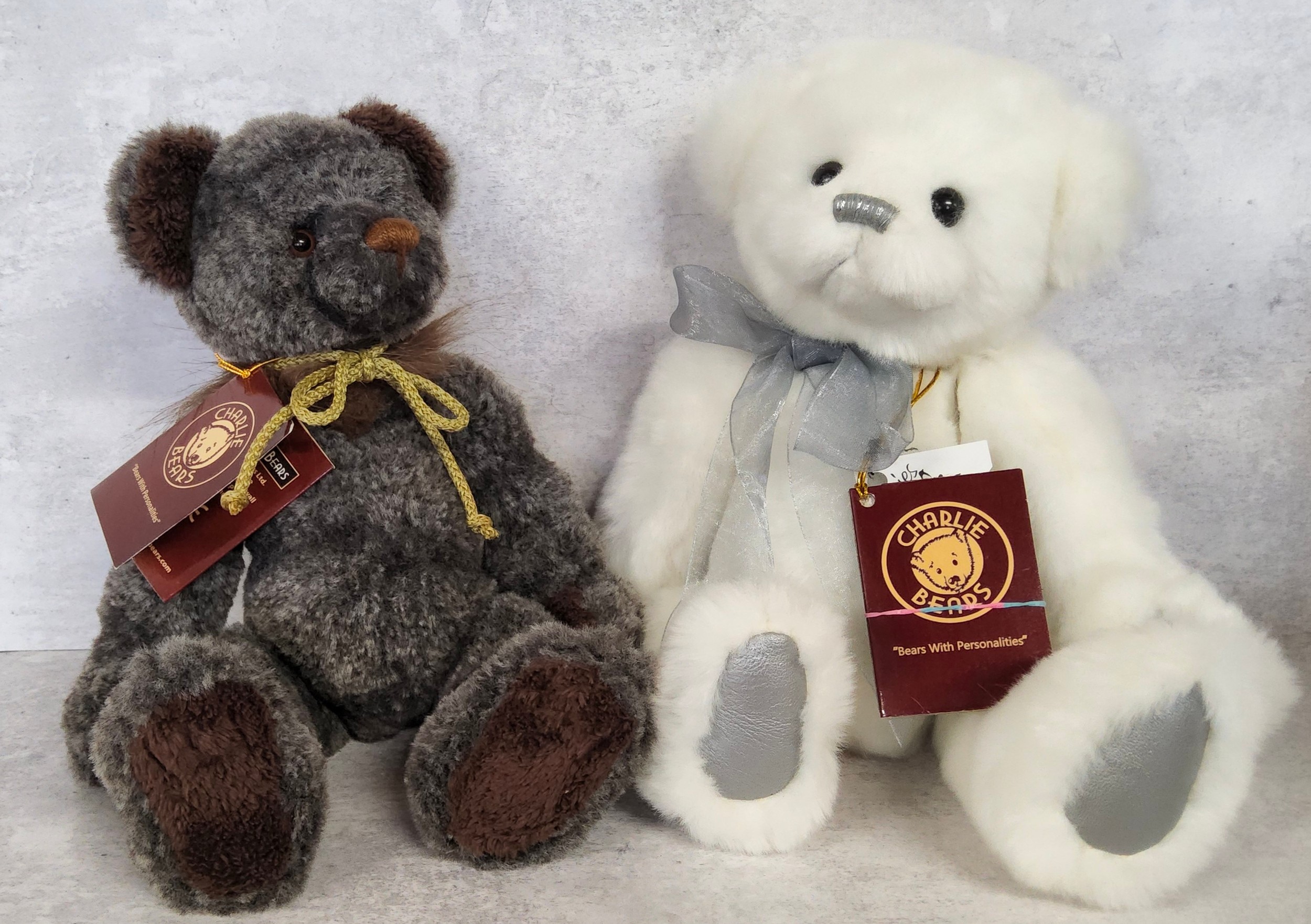Charlie Bears Plush Collections - Pepper Pot CB161698 exclusively designed by Isabelle Lee with jointed arms and legs, stitched nose, green rope bow, original tags, (height in bear paws 10) 2016; another Snowball CB159064S exclusively designed by Isabelle Lee with jointed arms and legs, stitched nose, silver bow, original tags, (height in bear paws 10) 2015 (2)
